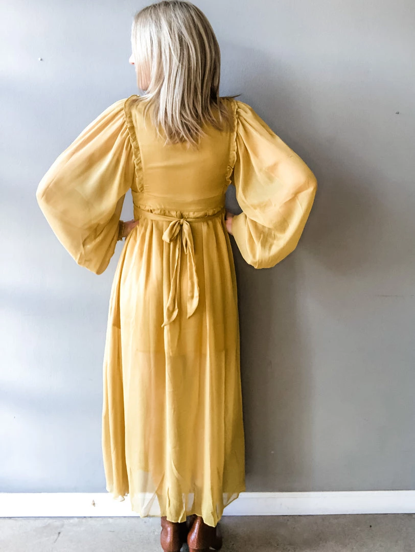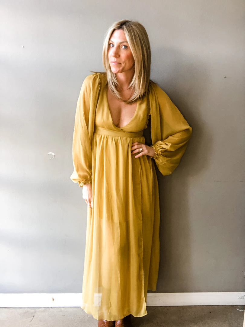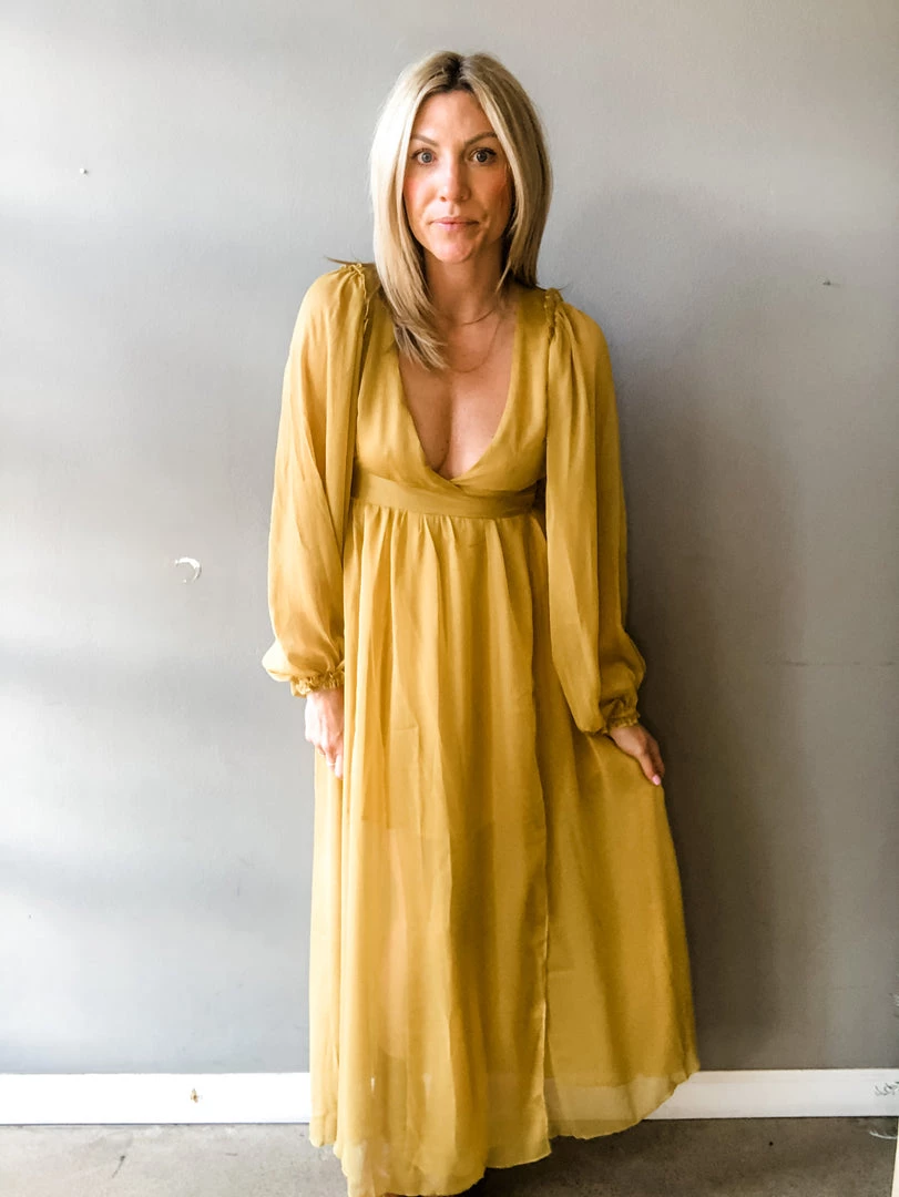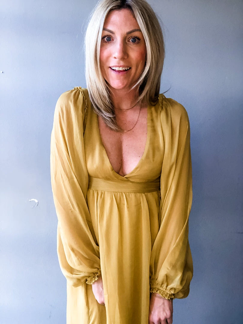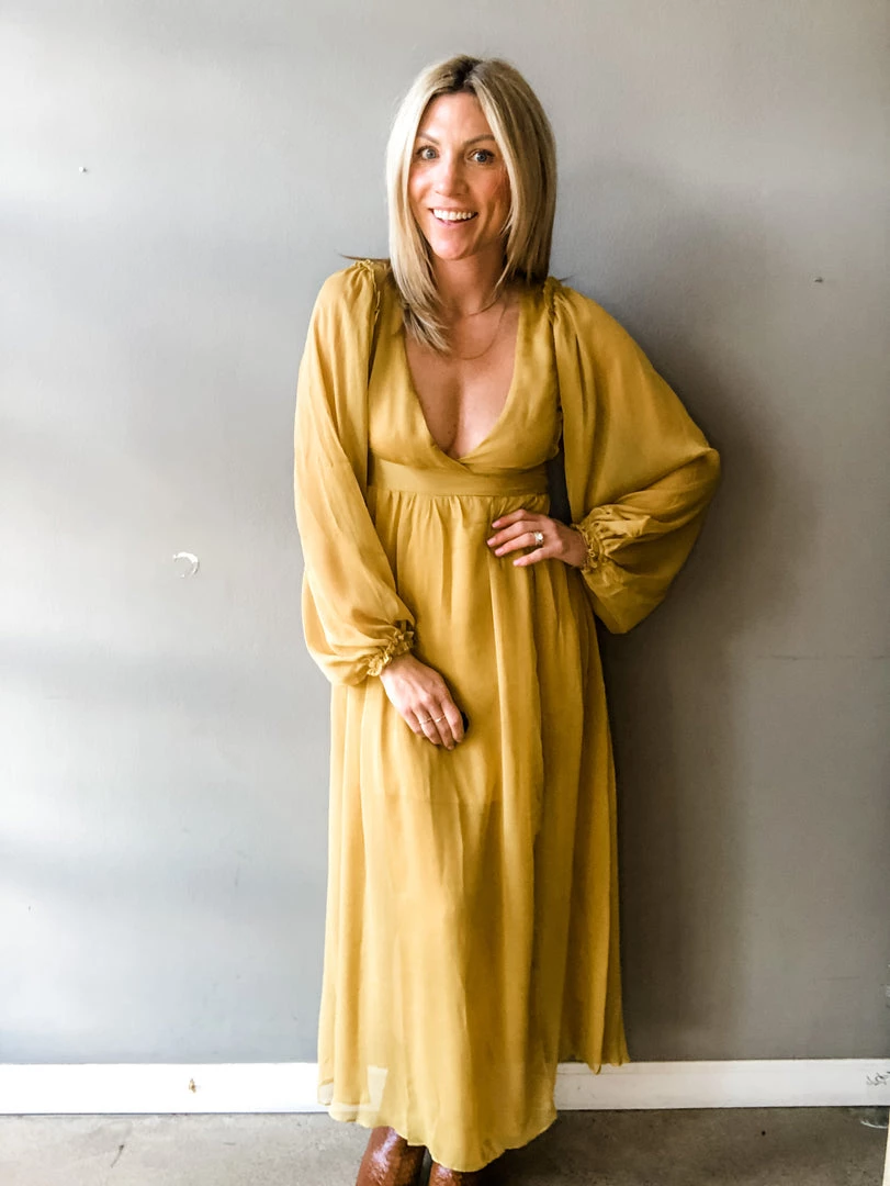 A beautiful long sleeve wrap style dress with balloon sleeves, a deep v neck and flowy skirt. Perfect for a special occasion, you can take this mustard boho vibe dress and pair her with the new Caty boot in Cognac snake or a heel for a more dressed up look.