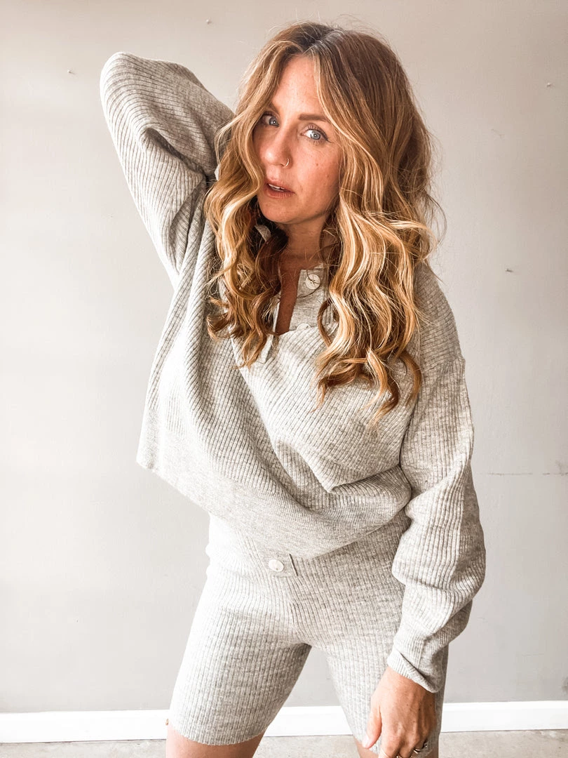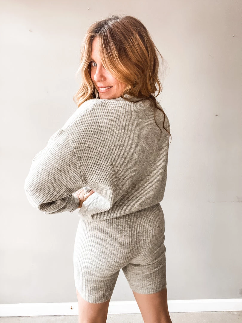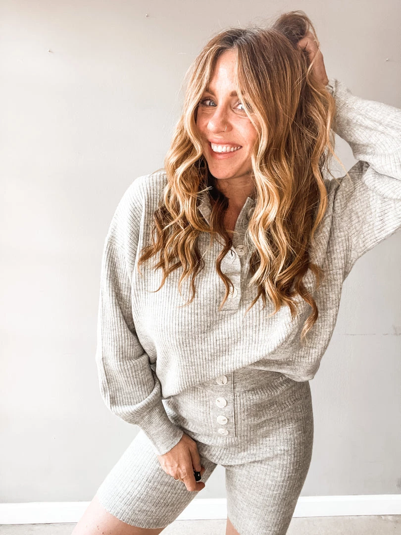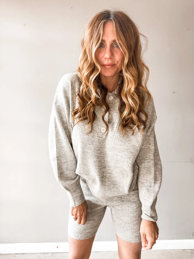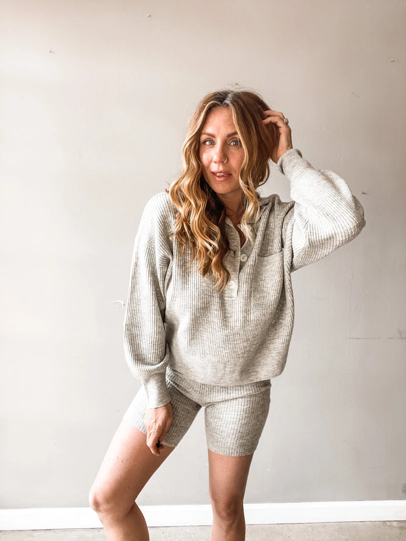 The Likes to Lounge Sweater and Bike Short Set is a fun, super cozy set for easy lounge Fall days!!! We love this chic high waisted bikes short with the fun collared shirt for errand running when its a bit brisk. So cute as a set or as separates!!