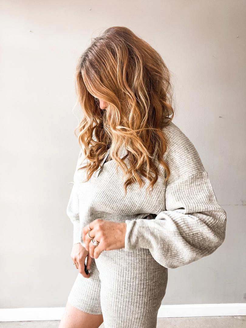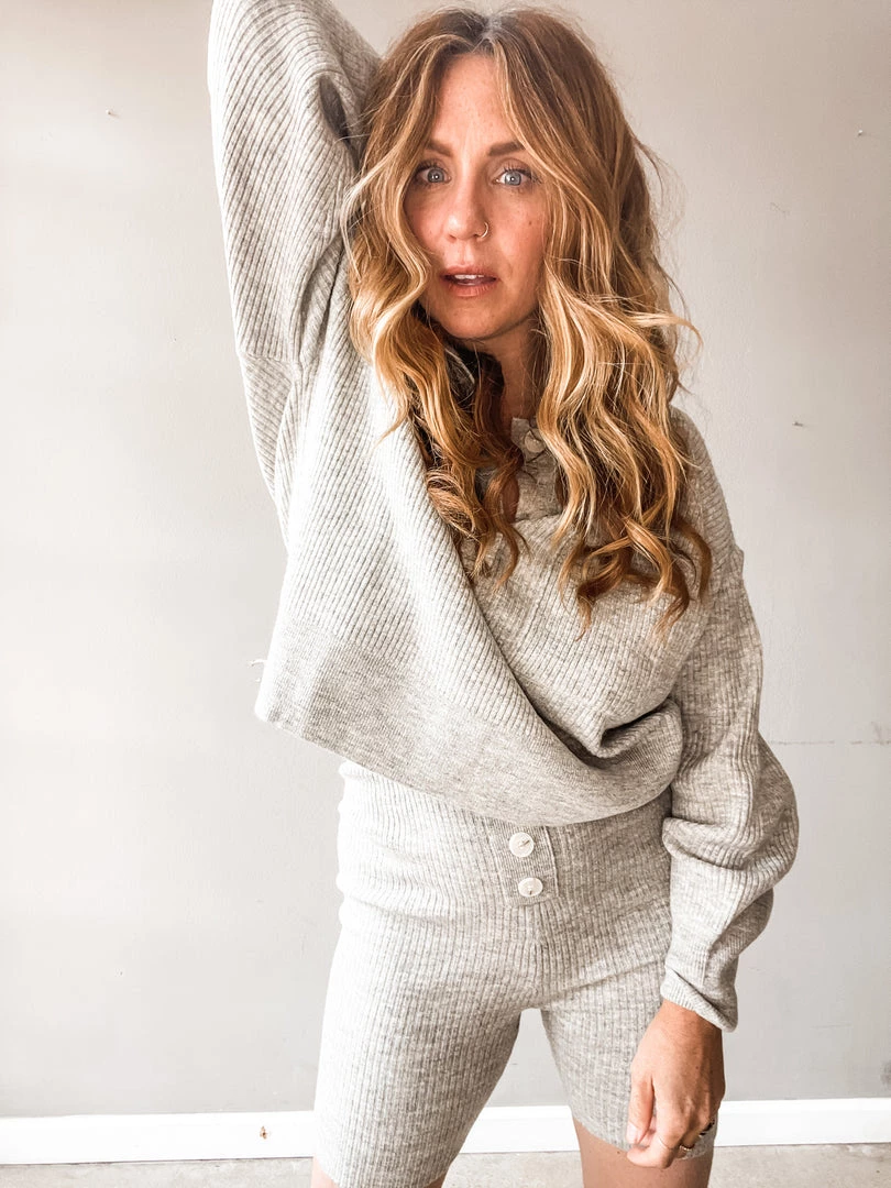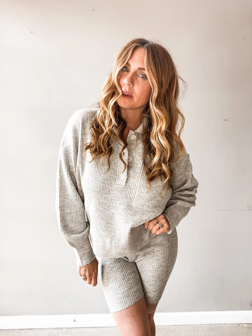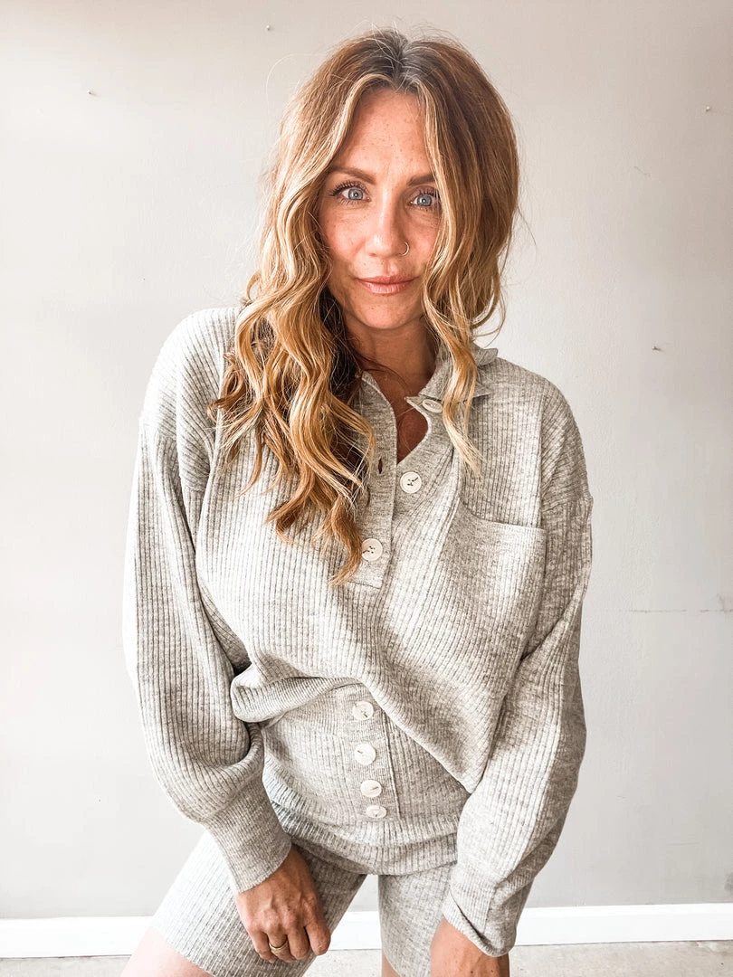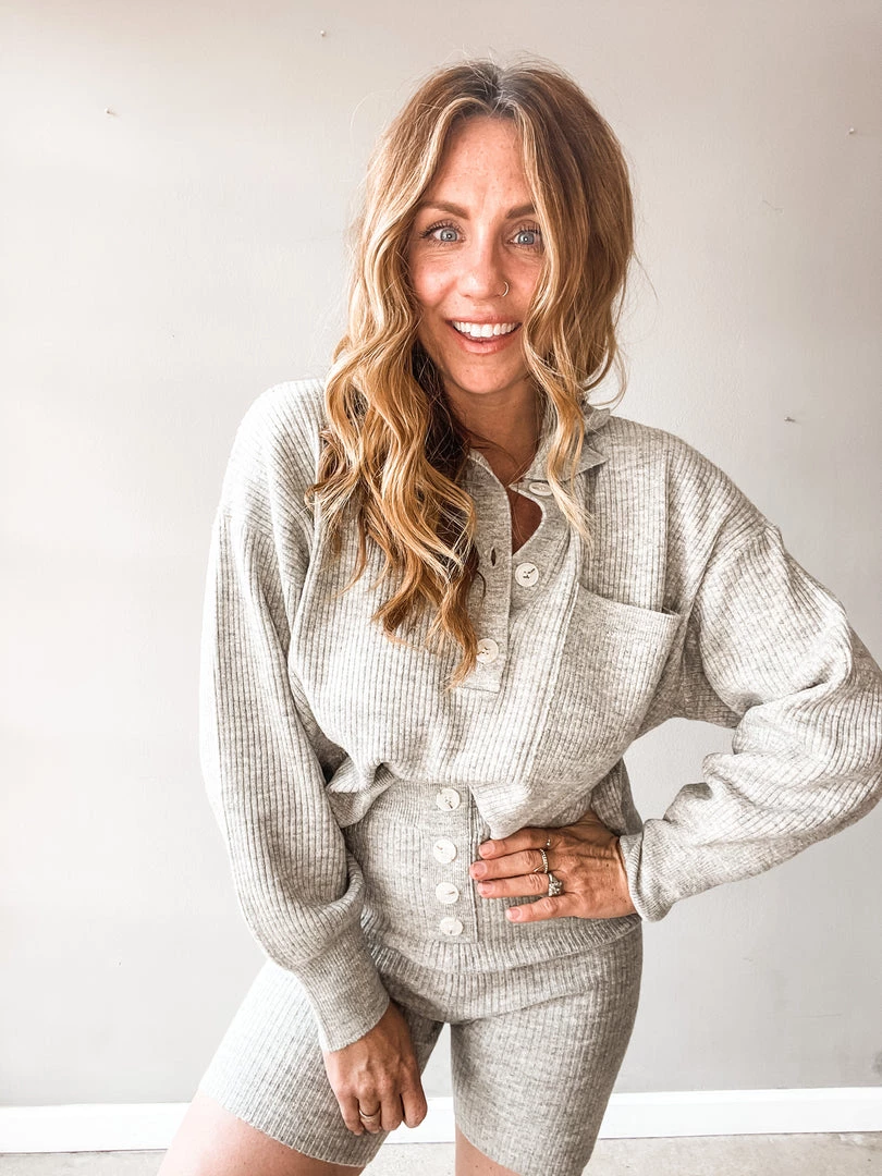 The Likes to Lounge Sweater and Bike Short Set is a fun, super cozy set for easy lounge Fall days!!! We love this chic high waisted bikes short with the fun collared shirt for errand running when its a bit brisk. So cute as a set or as separates!!