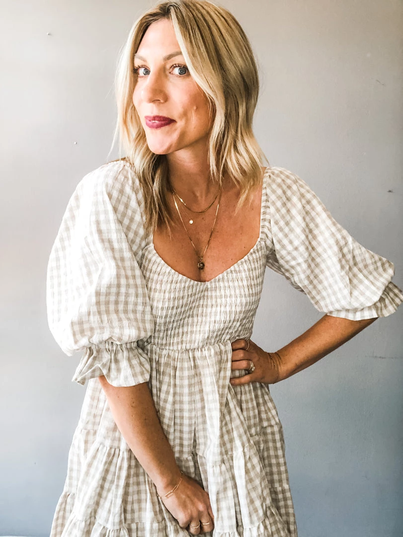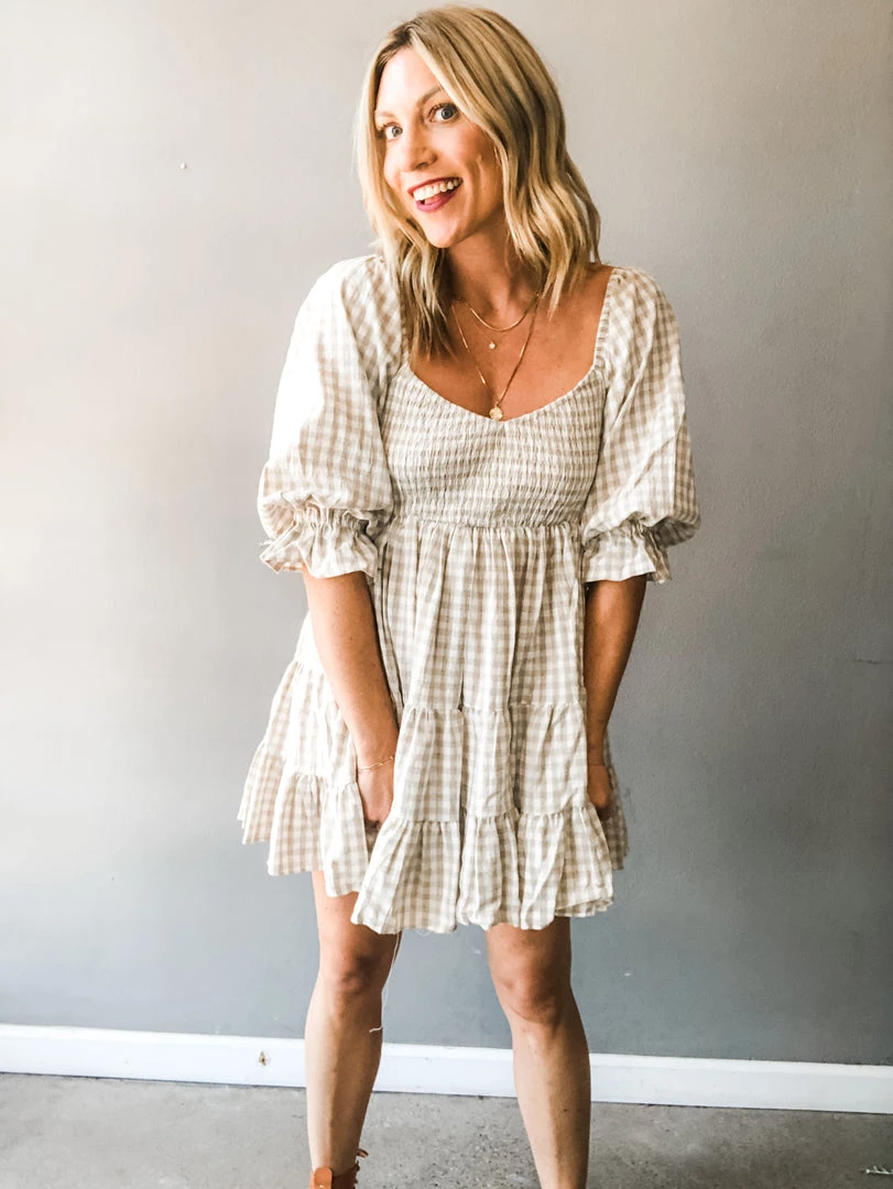 A gingham mini dress with 3/4 length puff sleeves, smocked upper and a tiered skirt. Love how chic, feminine and versatile this little dress is. Can be paired with sandals, sneaks or a wedge and worn for any occasion.