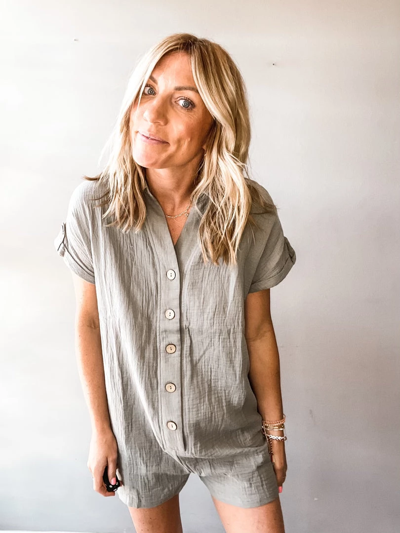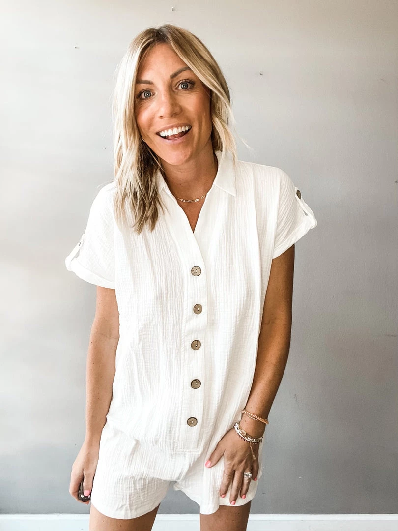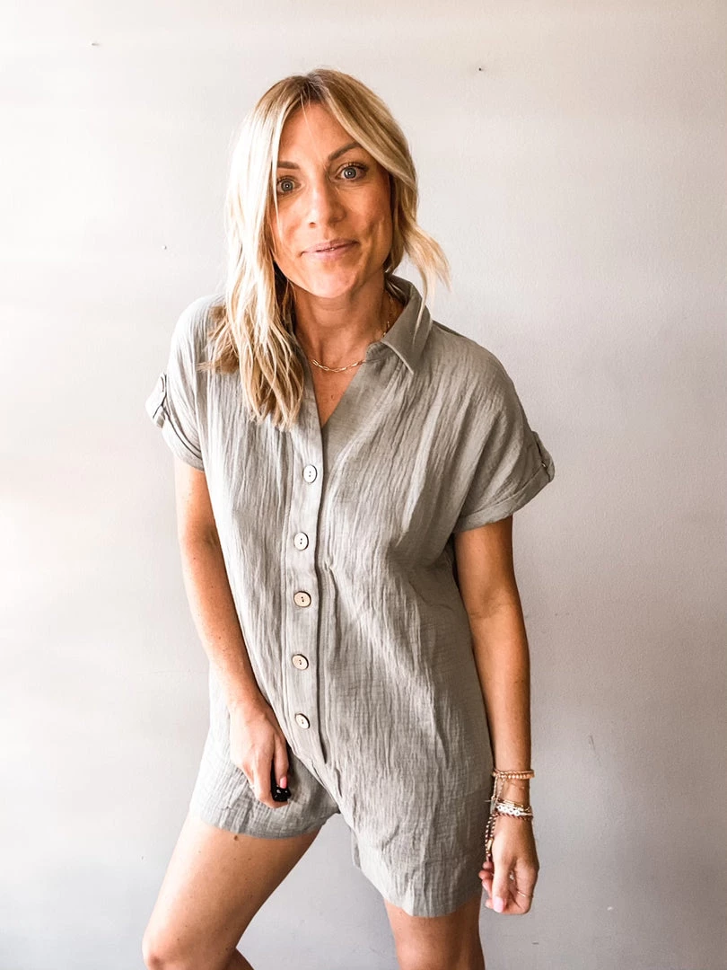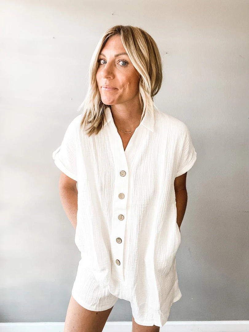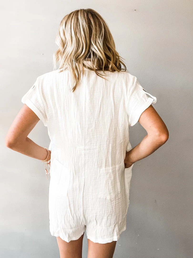 A wrinkle gauze button down shorts romper with side pockets and rear pocket detail. An easy summer piece to toss on and go. Pair with flats or sneakers or dress up for a night out. Available in two color ways.