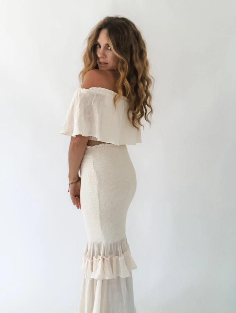 Oh wow this one is a real showstopper!!! Obsessed with this super sweet and fem set with a gorgeous, off the shoulder crop and smocked skirt with ruffle details. This super flattering set fits like a glove and makes for the perfect vacation look, boho bride outfit, or just because.