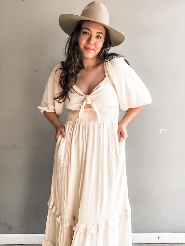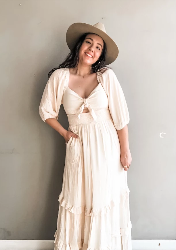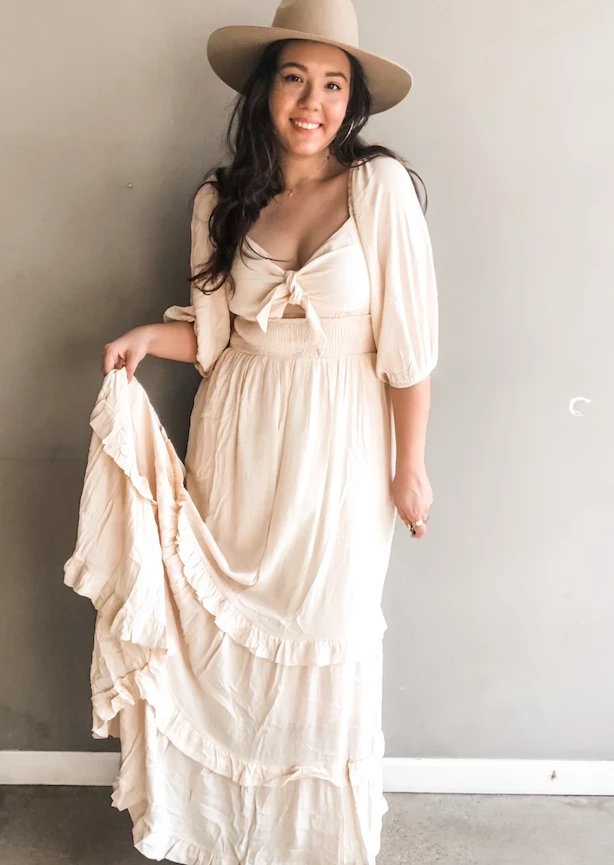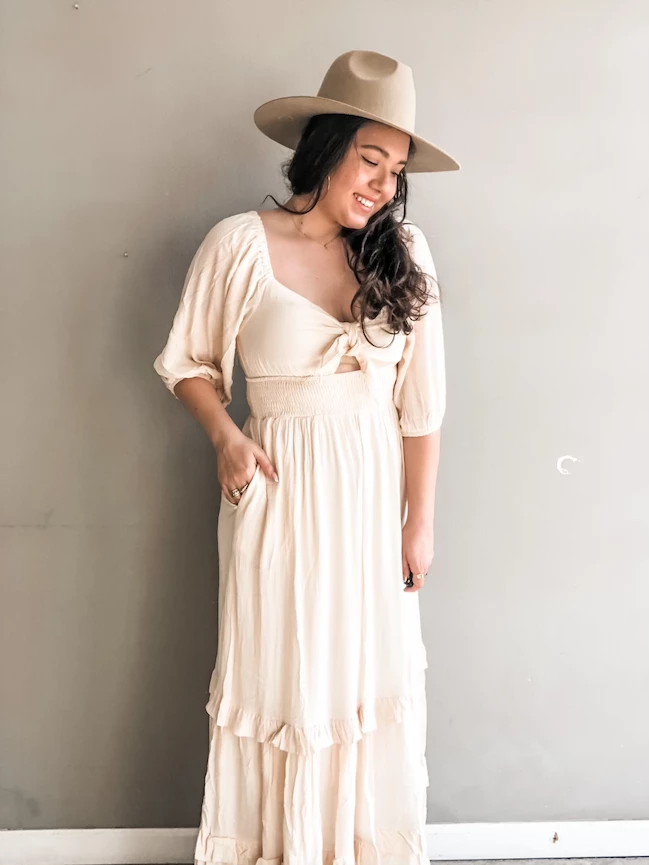 Calling all future brides, vacationers and carefree babes!! The Ride with the Wind Maxi is the perfect piece for you! This ruffle tiered maxi dress comes in the prettiest cream color way that is perfect for bridal showers, wide open spaces or for beachside hangs. With a flattering silhouette and flexible smocked waist, this V neck dress is a free and easy piece. We love the simple details on this 3/4 sleeve dress with flirty self-tie bust and side pocket details. Lined.