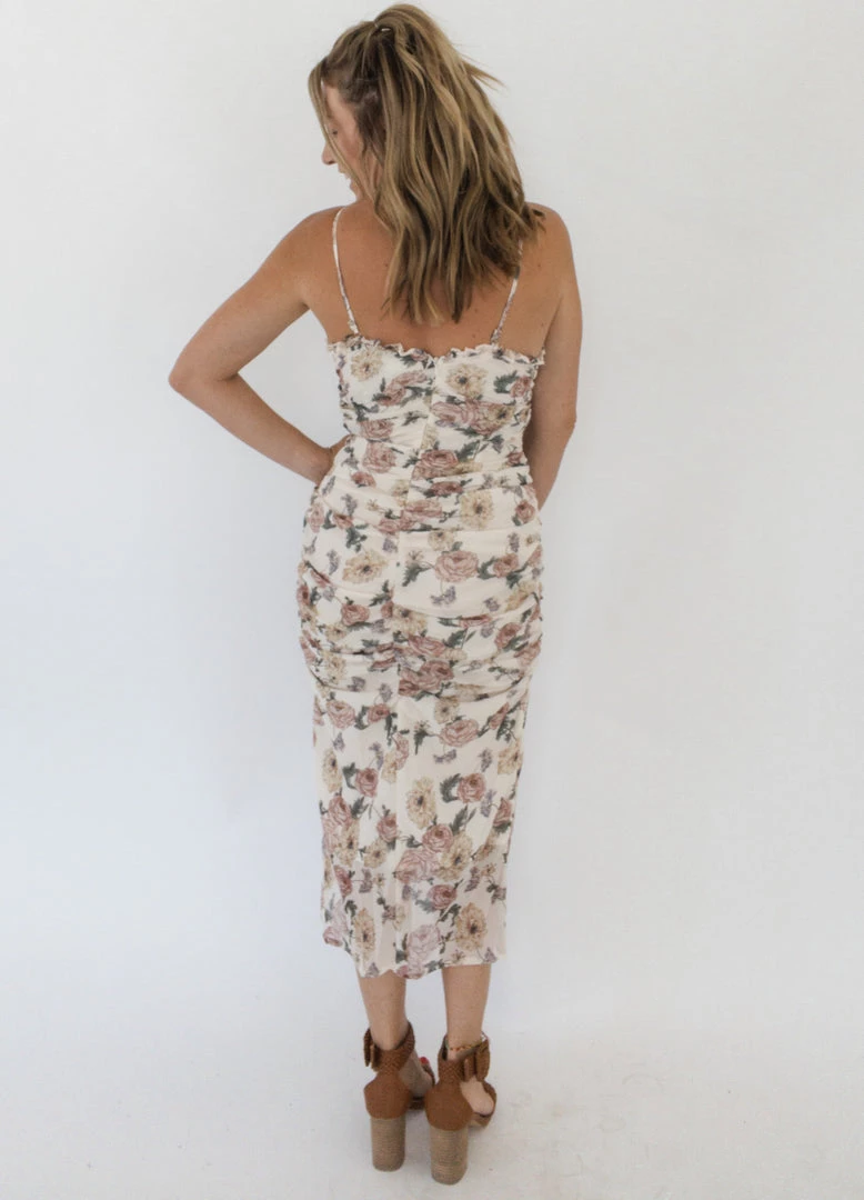 Off to somewhere special? Let this dress take you there! The soft bloom print with the taupe base color compliments the ruched detailing and ruffled sweetheart neckline. It features a zipper up the back and adjustable shoulder straps. Complete the look with our Bridget heel.