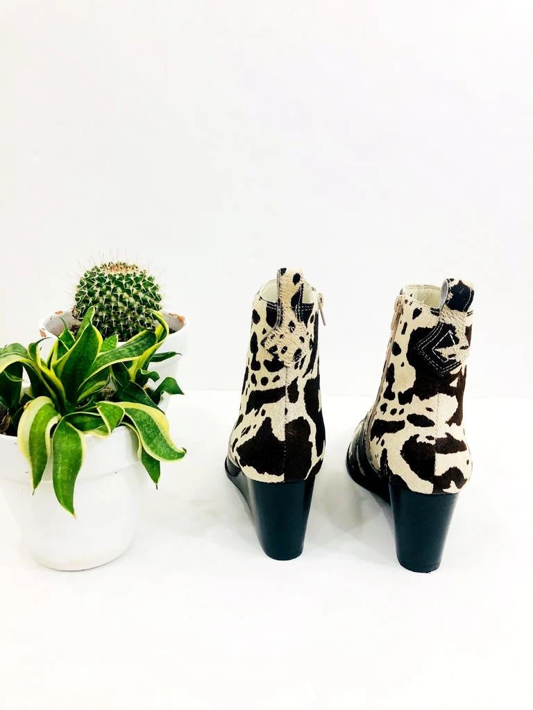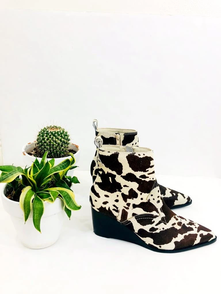 When something’s this good you call it what it is. Essential. This pointed toe bootie serves up some rad Western vibes with it’s cow hair print and wedged heel. Inner zipper closure with padded insole. Heel height: 2.5″