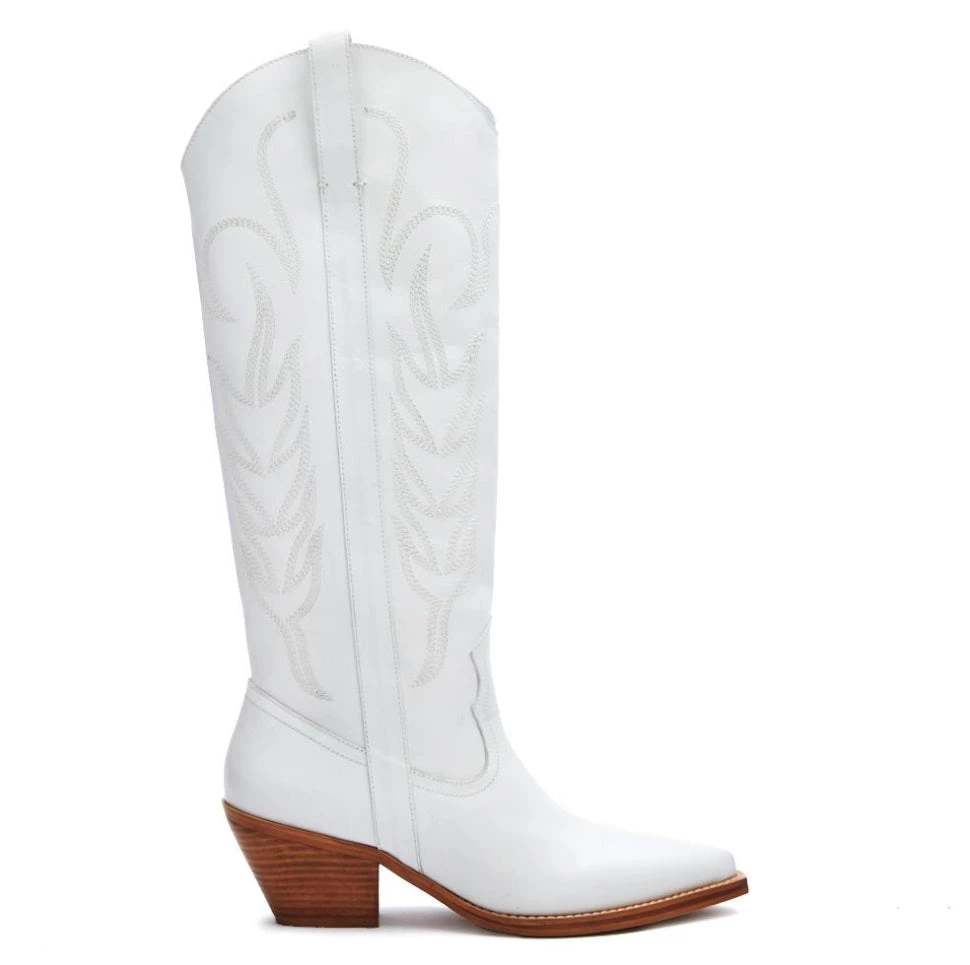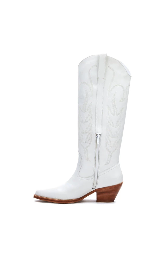 The Agency Boot is the perfect mix between two of our favorite styles. It has that laid back cool girl vibe of a western style boot with the tailored goodness of a riding boot. This slip on style boot has a half zipper closure at the ankle with wooden block heel. We absolutely love these white knee high boots with their stitched design and all too classic feel.