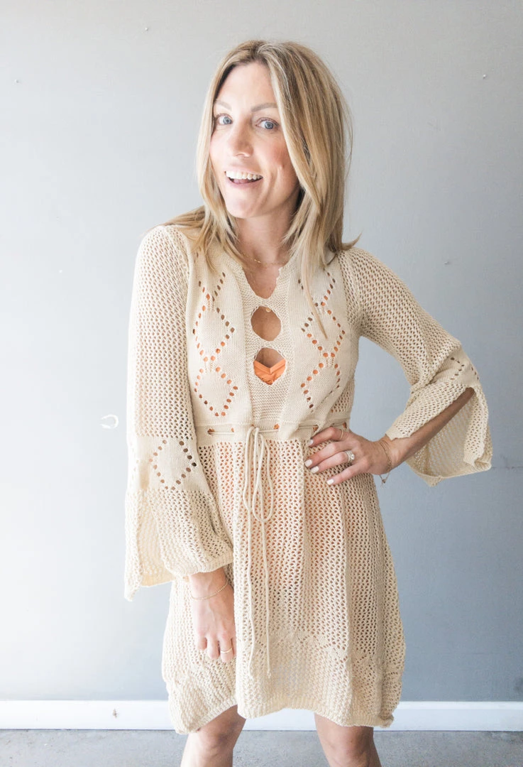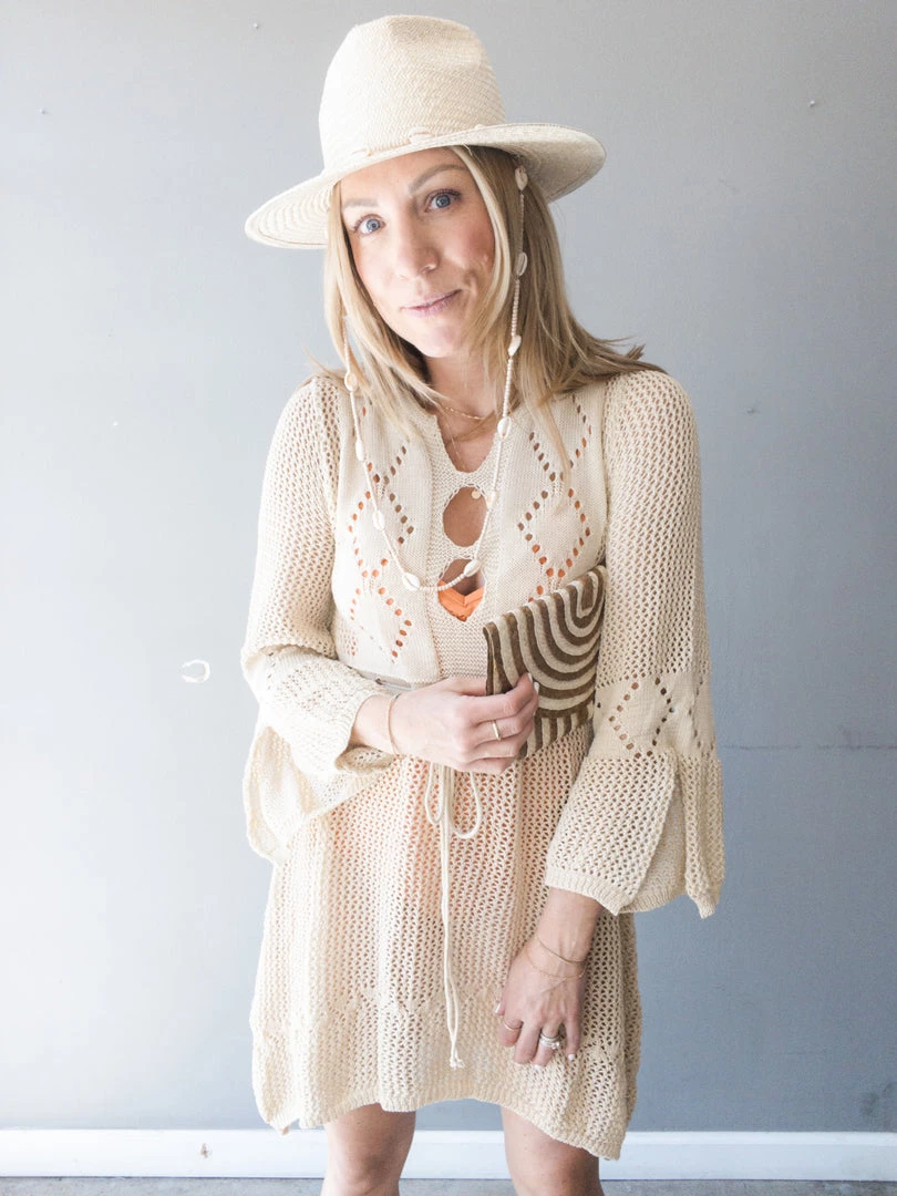 A sweet, open knit, mini length coverup that is perfect to toss on before heading beachside. The Coastline Coverup is a pull on, crochet piece with slight V neck and double keyhole details at the bust. We love the adjustable tie waist and chevron style open knit pattern. This bell sleeved cover up is a relaxed fit that hits mid thigh.