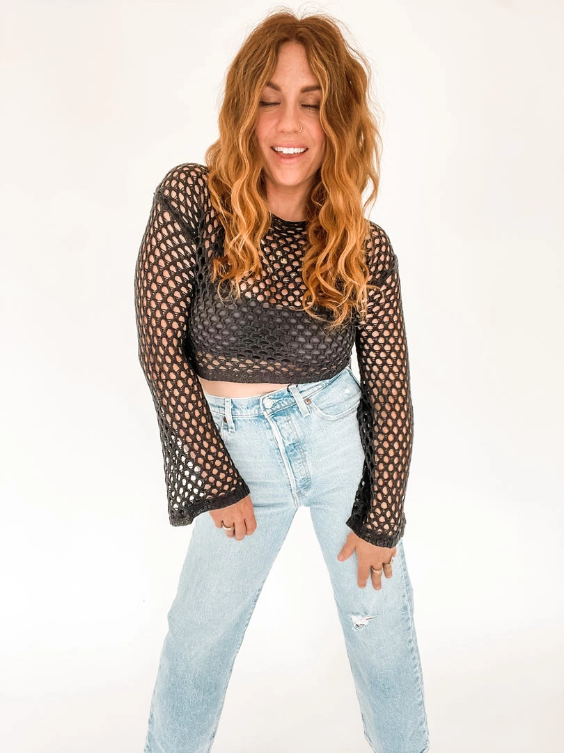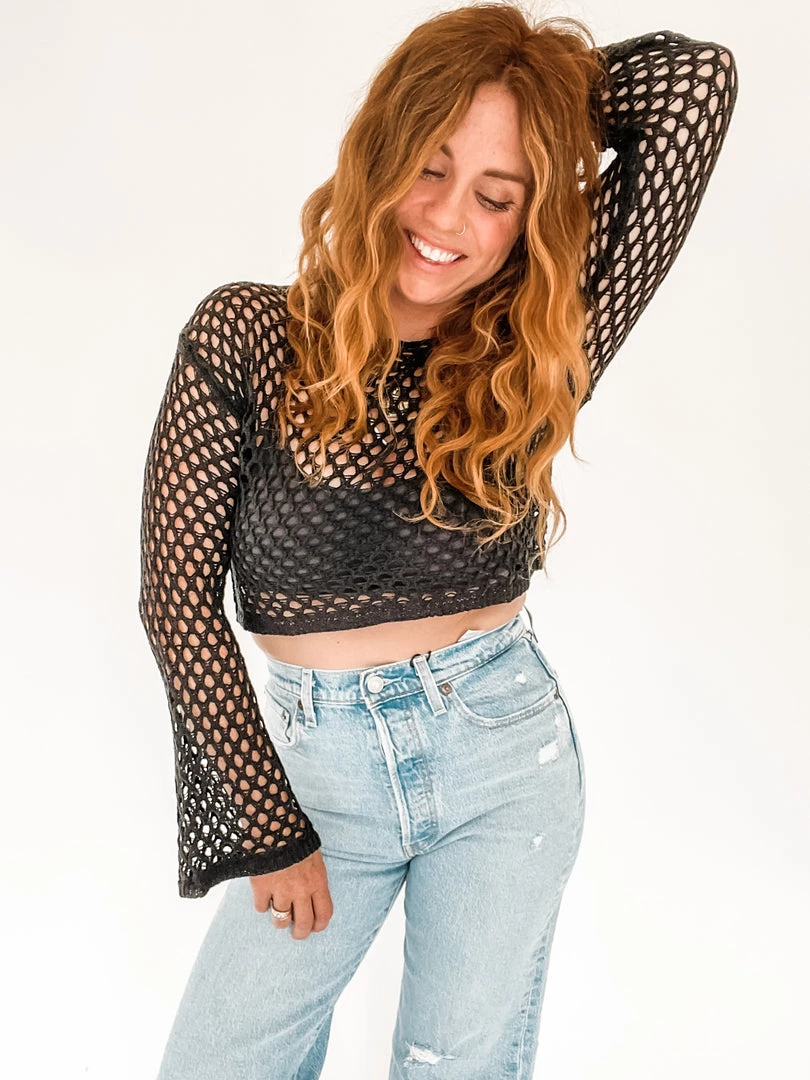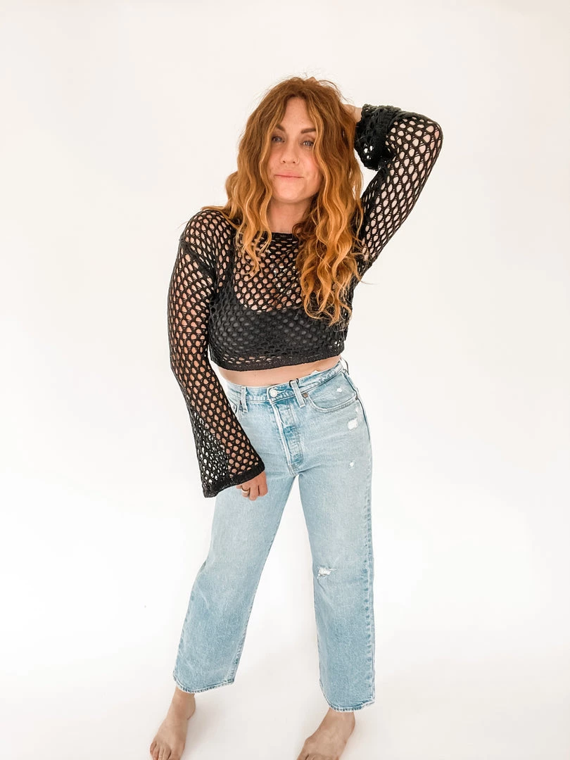 An open knit pullover that is the perfect toss on over your swim or paired with some high waisted cut offs. This sheer crop is a wide neck long sleeve with seamed trim on the hem and sleeves.