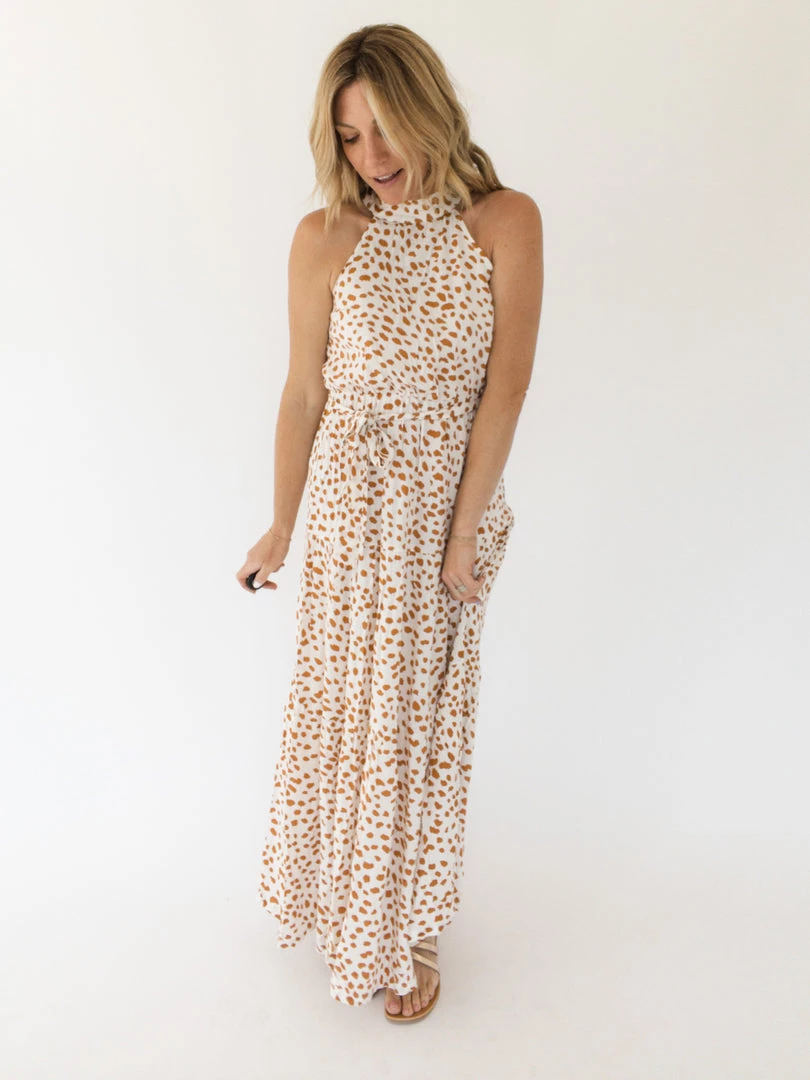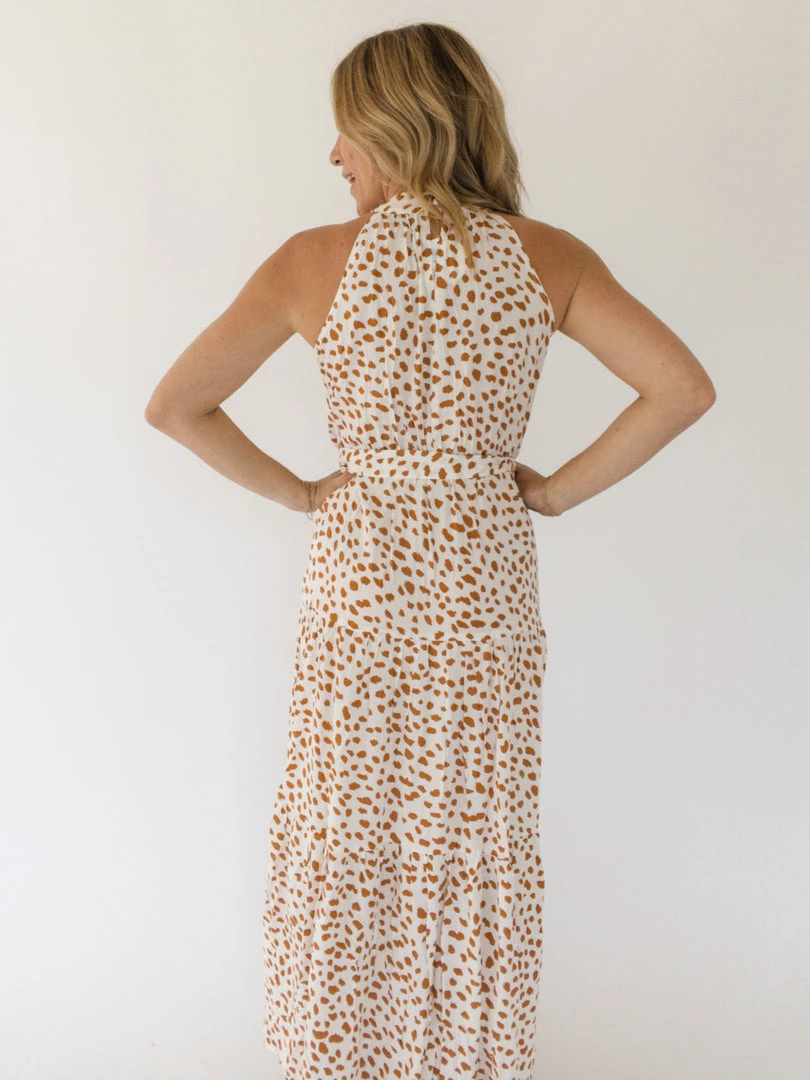 This stunning, high neck maxi dress comes in a fun giraffe print that can easily be dressed up or down! We love the easiness of this chic silhouette that slips on and has a button neck. Adjustable tie at the waist that can be worn or removed.