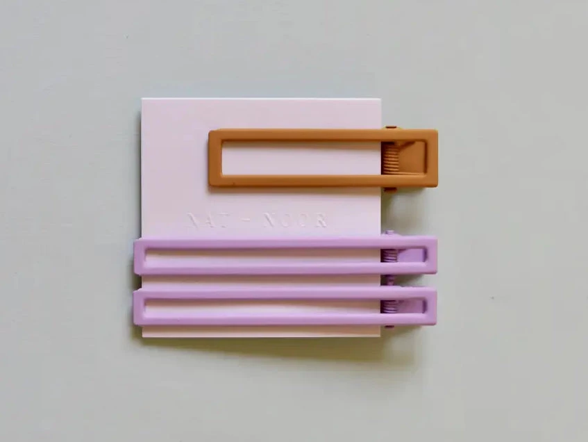 A set of 3 clips in fun color ways! Wear them separate or together for a fun pop. One rectangular mustard clip and two thin rectangular lilac clips.