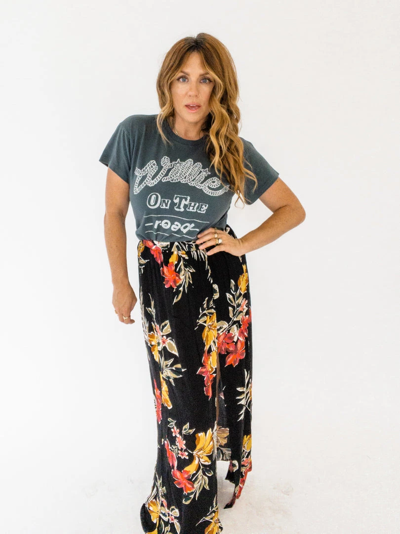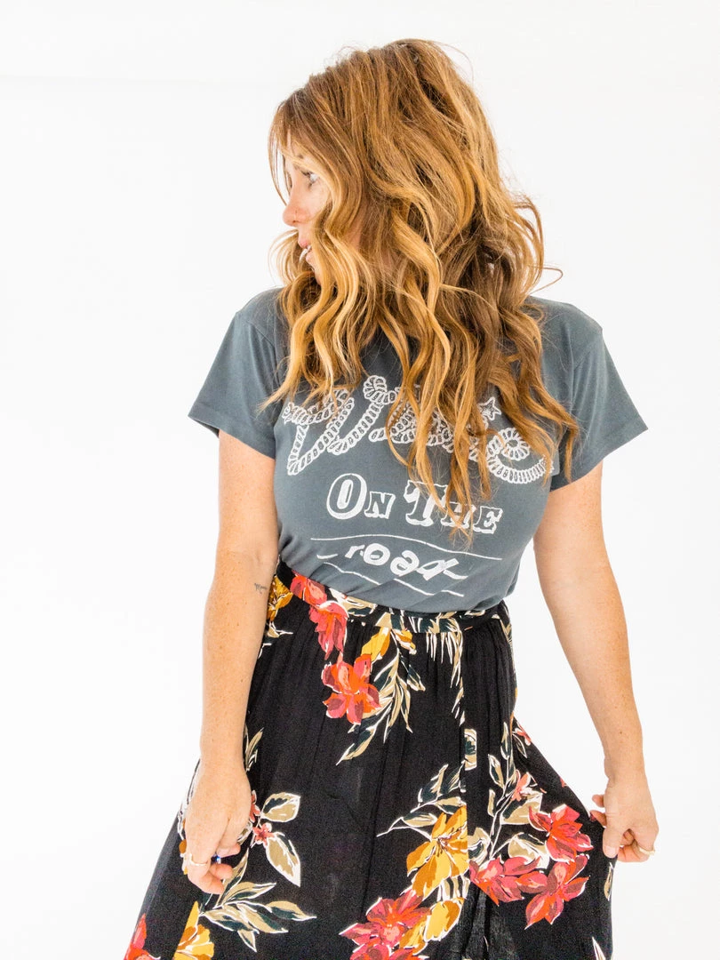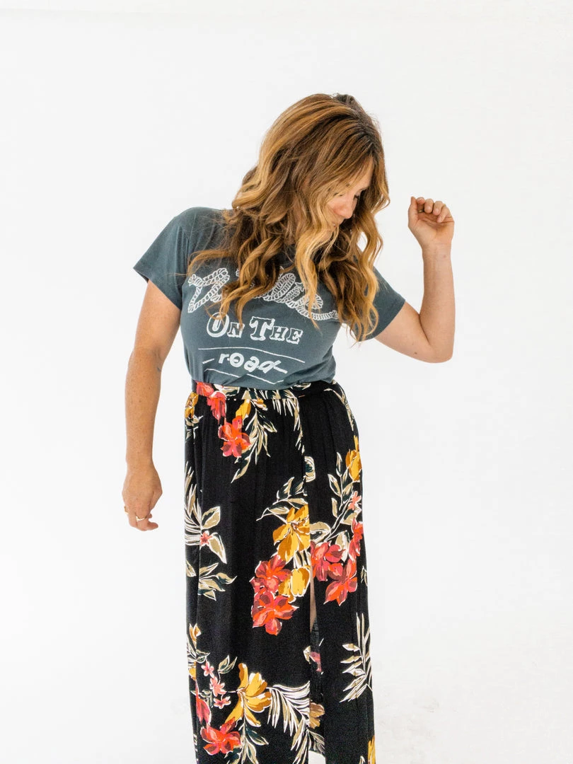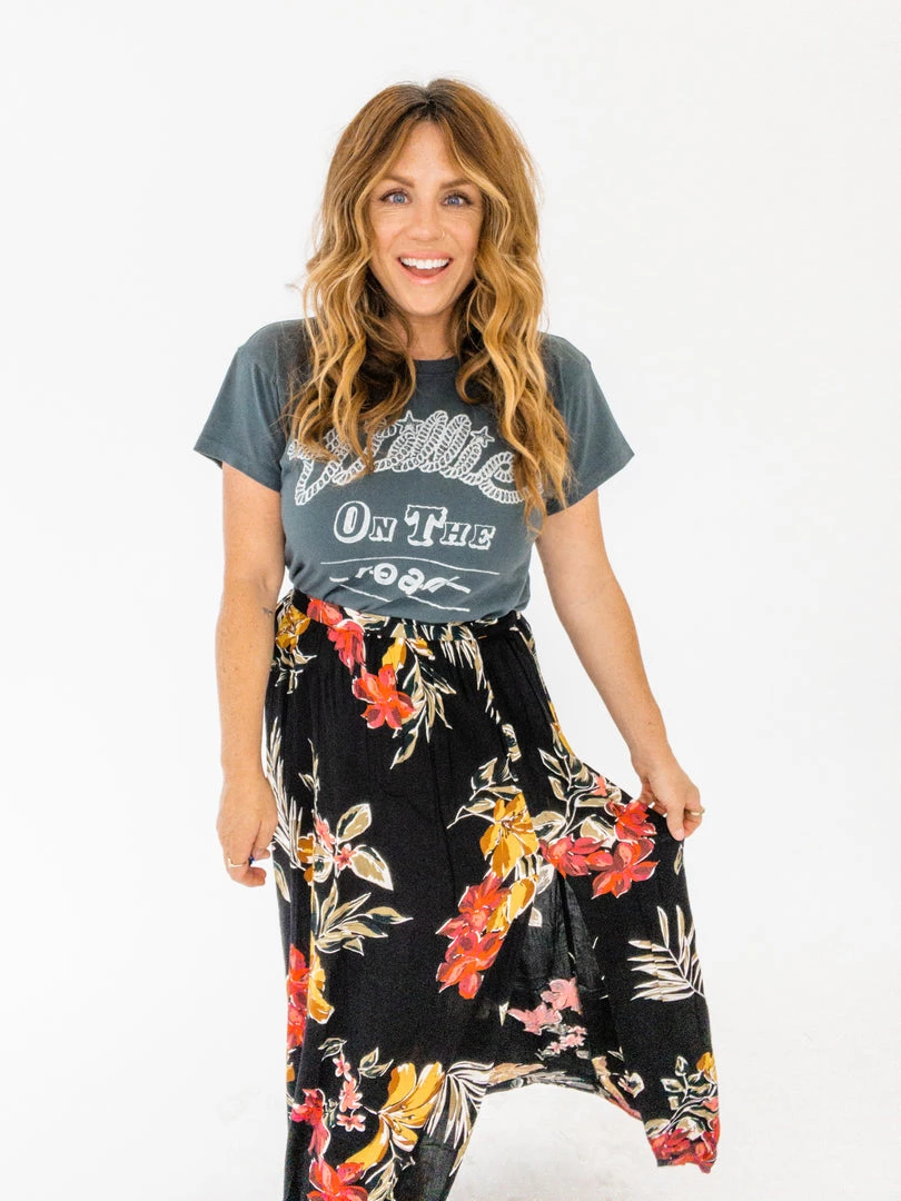 Willie Nelson is on the road again with this new graphic! Designed with the icon’s name in silver glitter, lasso lettering with a shoutout to Nelson’s home state on the back, this one is for the country fans. Made from a soft 100% cotton fabric with a perfect hand feel and worn in look. The tour tee is heavier loose knit cotton jersey, that features an open feminine neckline and ultra-flattering draped sleeve. With a length that shows off all your assets, this style is accented with classic vintage blind stitch.