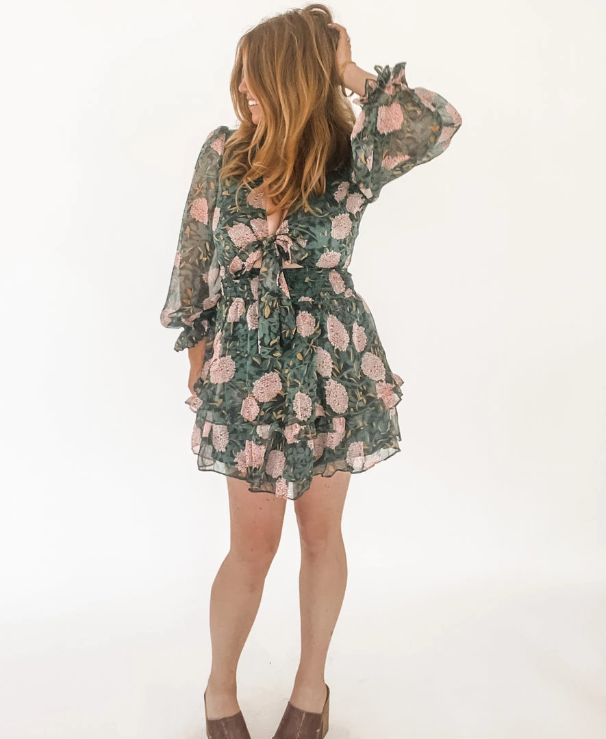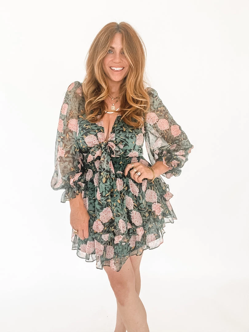 This flirty little number is begging to be taken out for a spin. It comes lined and has sheer long bubble sleeves, a tie front with a keyhole, a smocked waistband, and a tiered ruffle skirt. The floral print is comprised of dark greens, reds, golds, and whites.