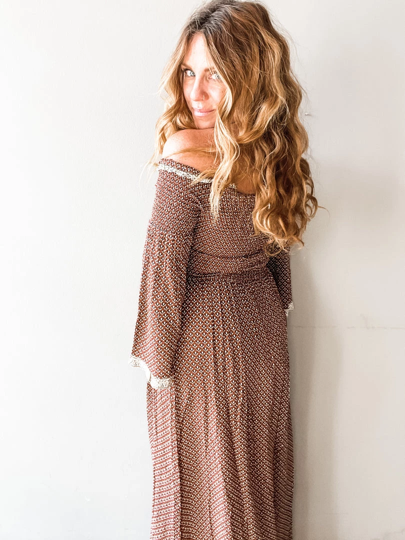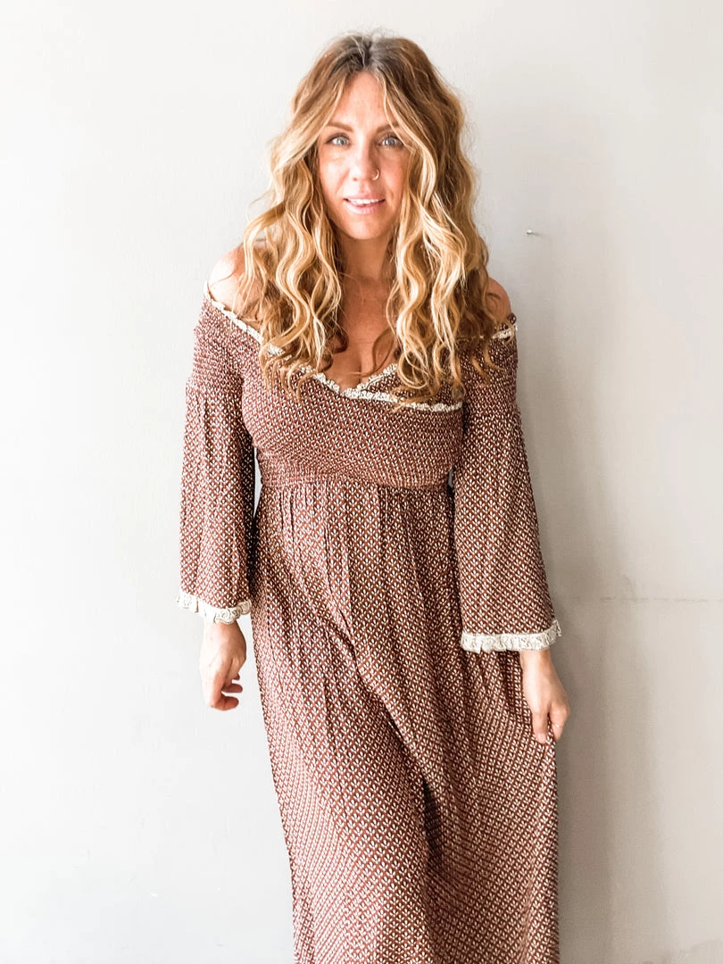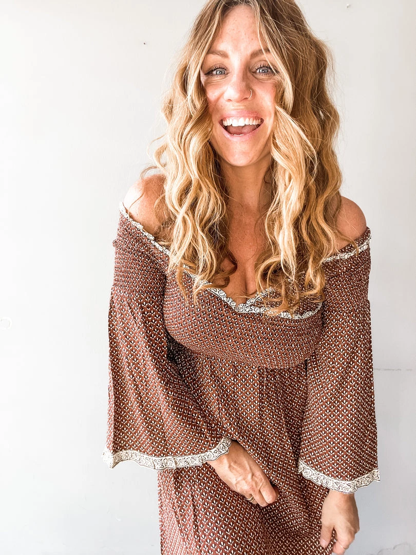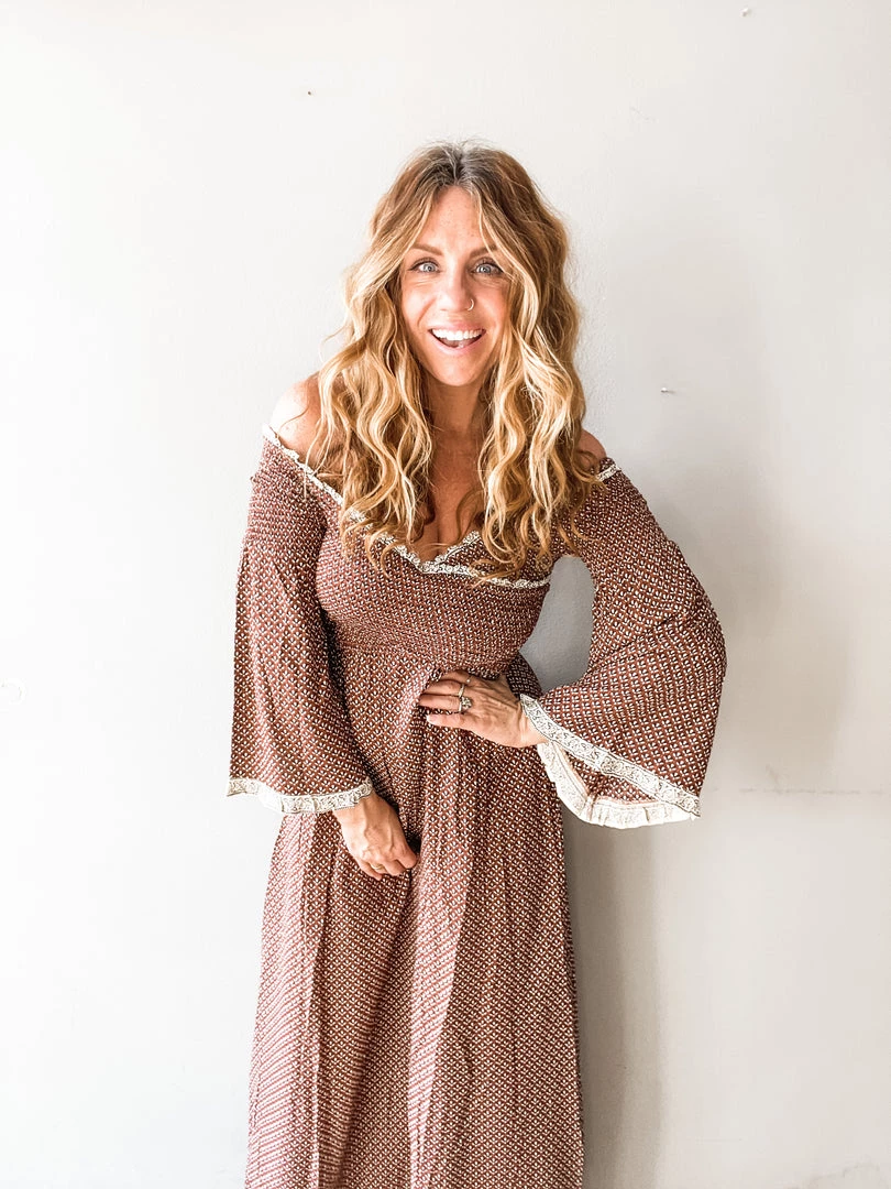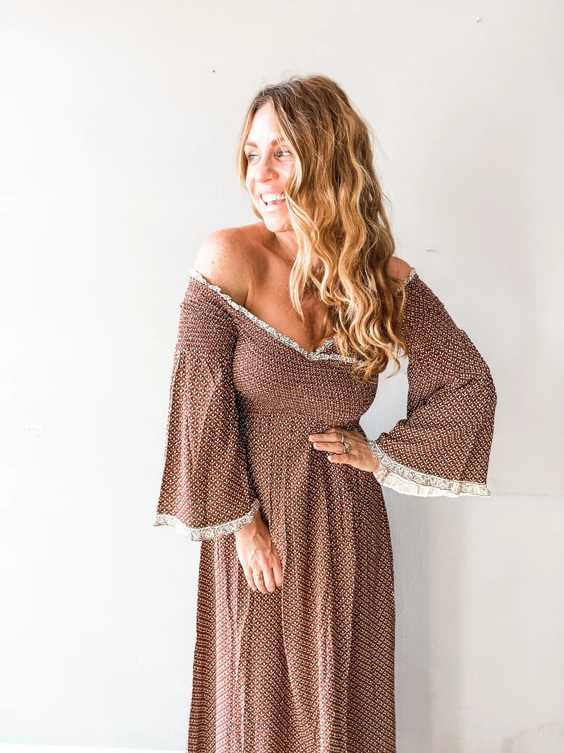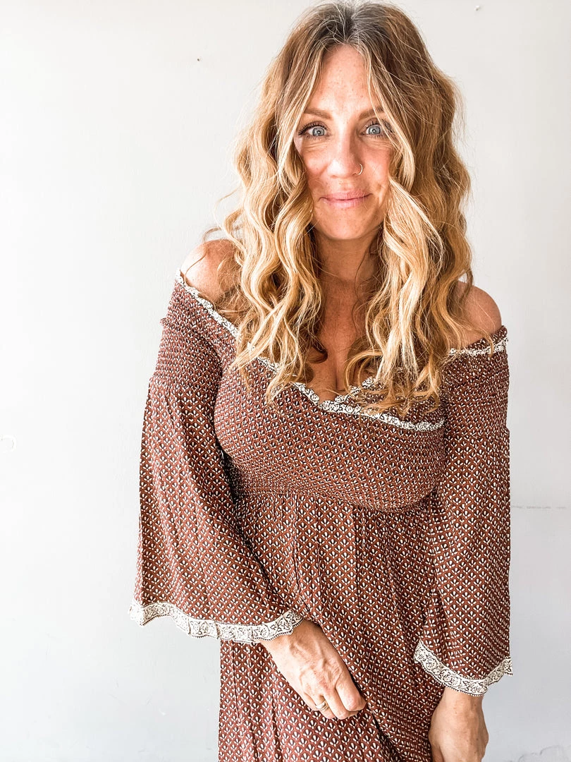 Say hello to the stunner that is the Alta Mesa Dress. A midi length dress in the prettiest tawny neutral colorway. A flowy fit with a smocked wrapped bodice that you can wear on or off the shoulder. We love this silhouette on every body type and absolutely adore the contrasting white ruffle hem details at the sleeves and neck. It’s perfect for special occasions, family pumpkin patch photos or date night.