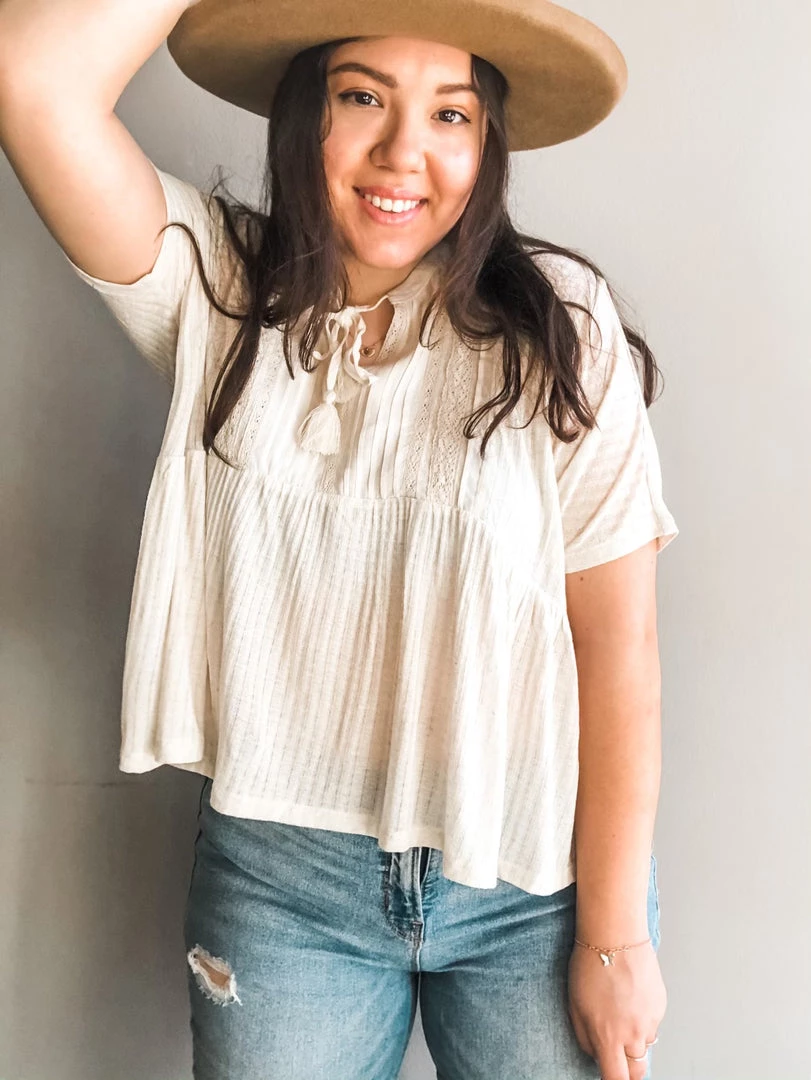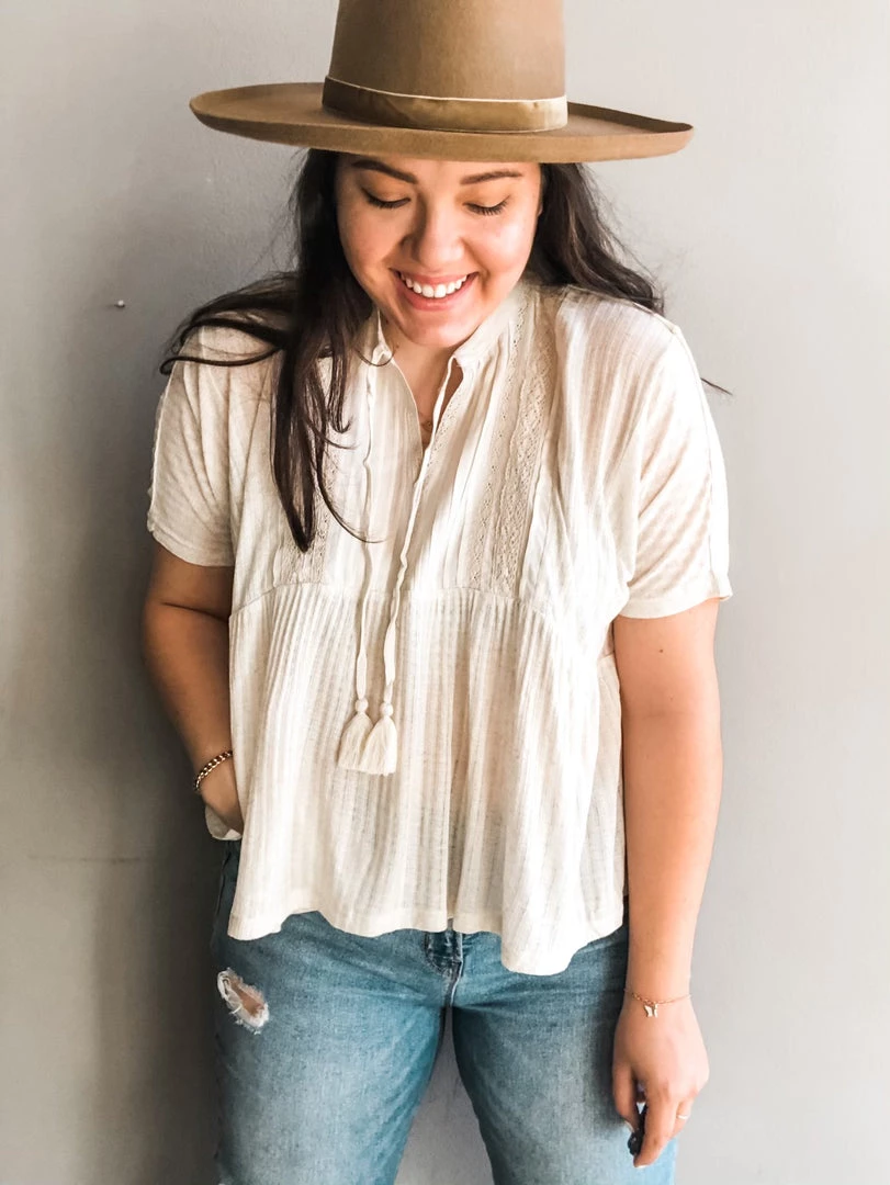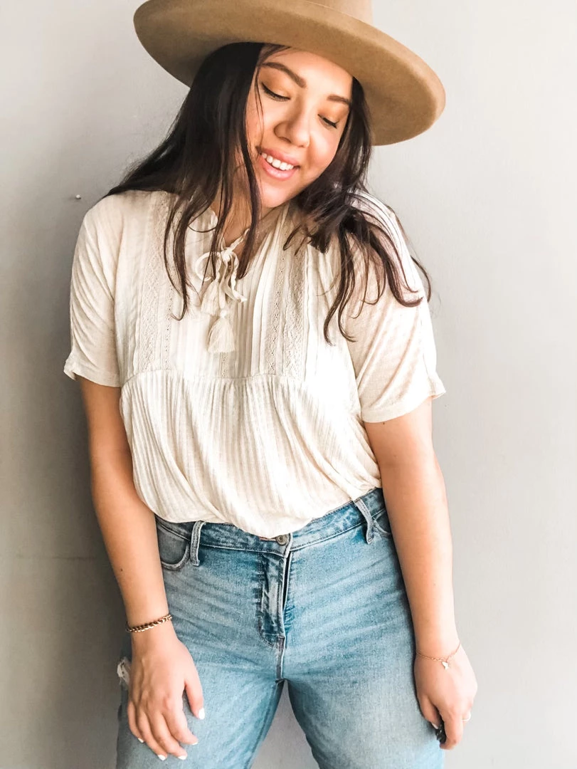A babydoll style top with fixed lace design on bust. This almond short sleeve top has a straight fit on the body with a loose and breezy silhouette. Tie neck tassle details give you the flexibility to make this top a mockneck short sleeve or a flirty Vneck top. Wear it untucked and loose or tuck it into any of your high rise bottoms with a statment hat for a SoCal meets western vibe we can’t get enough of.