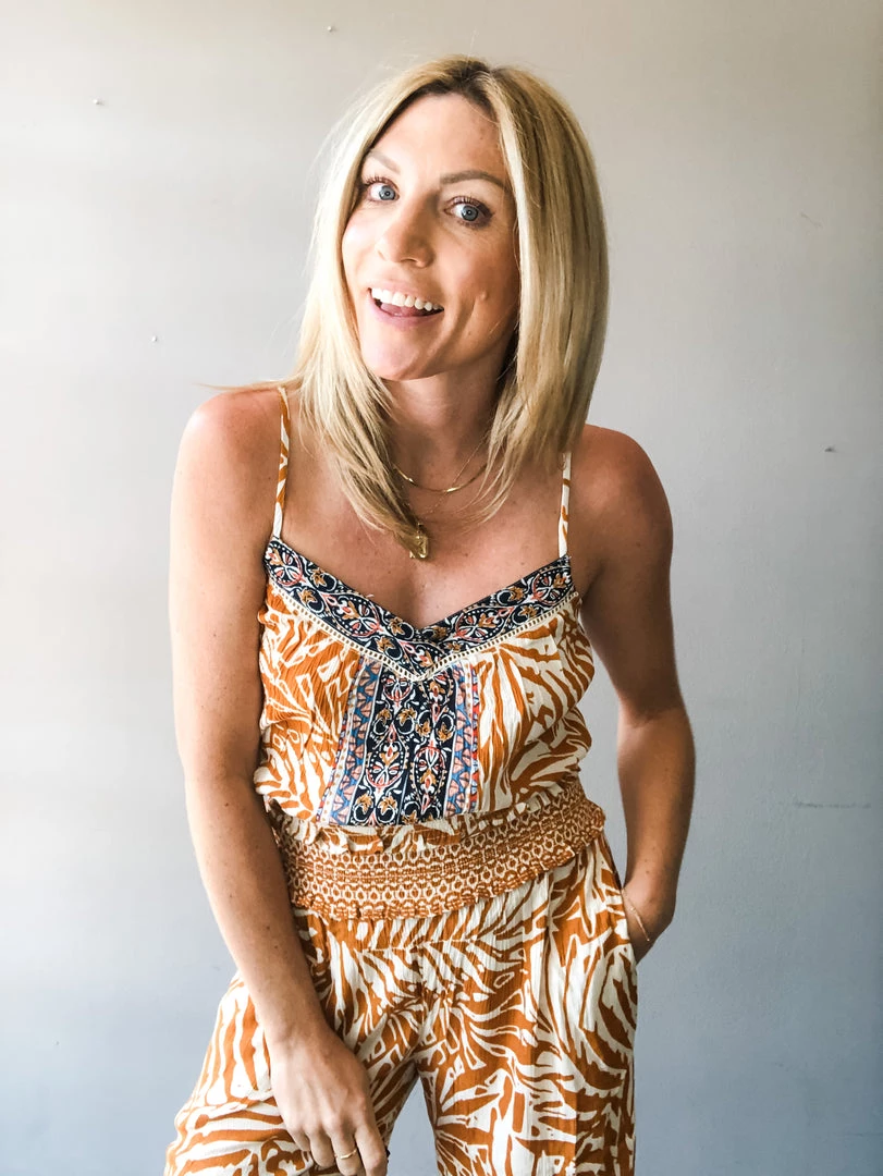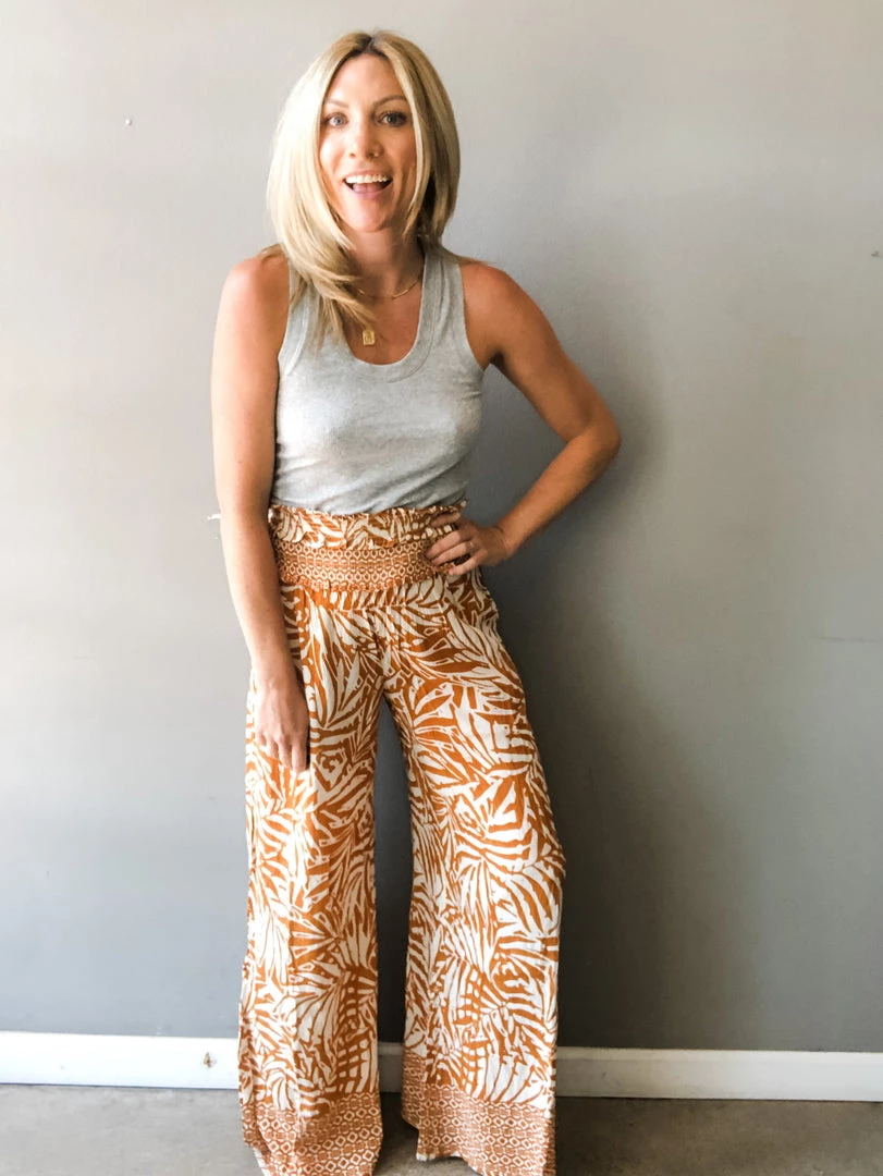 A wide leg palm print pant with a high waist and contrasting detail, side pockets and elastic waist. A fun pant for vacationing or hanging poolside, pair with a solid top orĀ completeĀ the set with the matching Oro Top (sold separately). Either way these pants are a fun statement piece and are great for all ages and body shapes.Ā