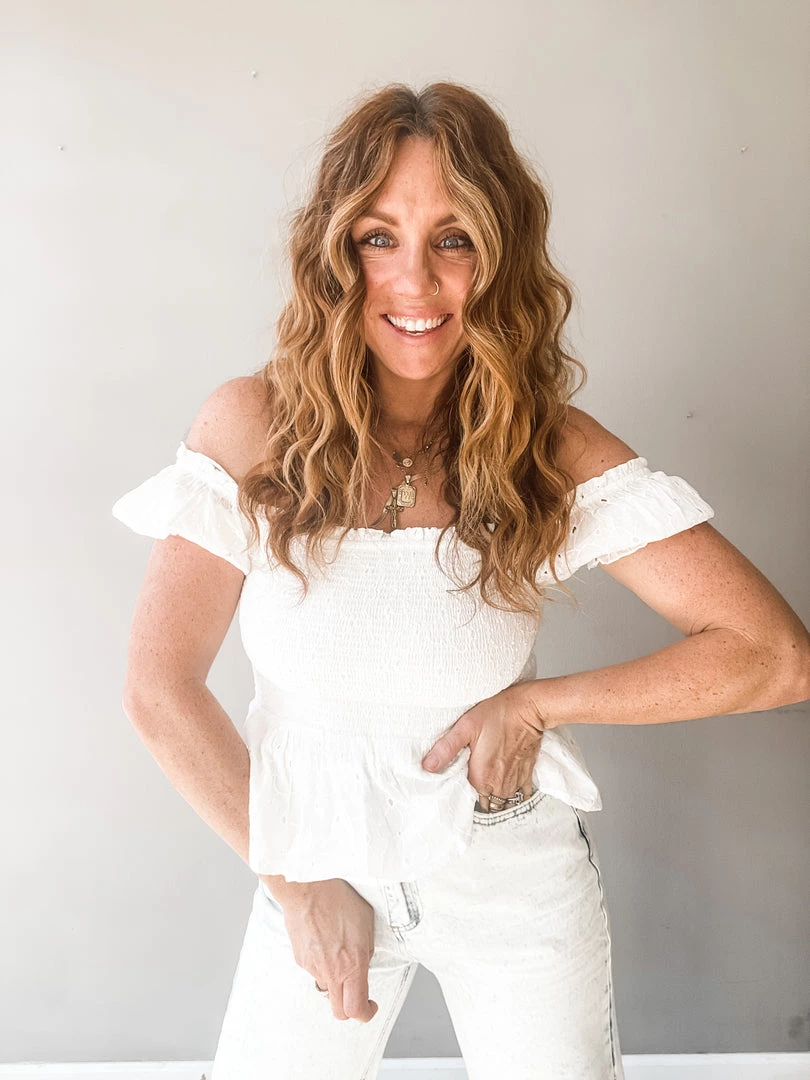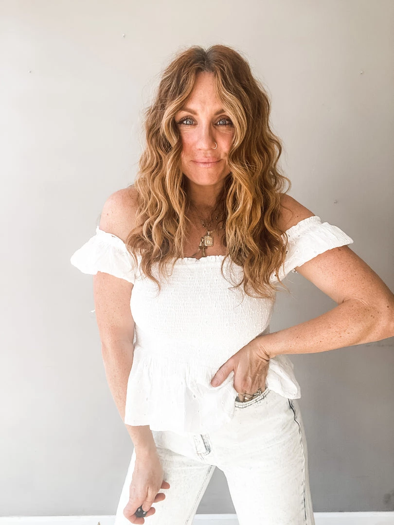 Gotta love a good neutral, crisp white off the shoulder top. This smocked top features a large ruffle hem (great for pairing with high waisted jeans) and a cute silhouette to spice up any outfit.