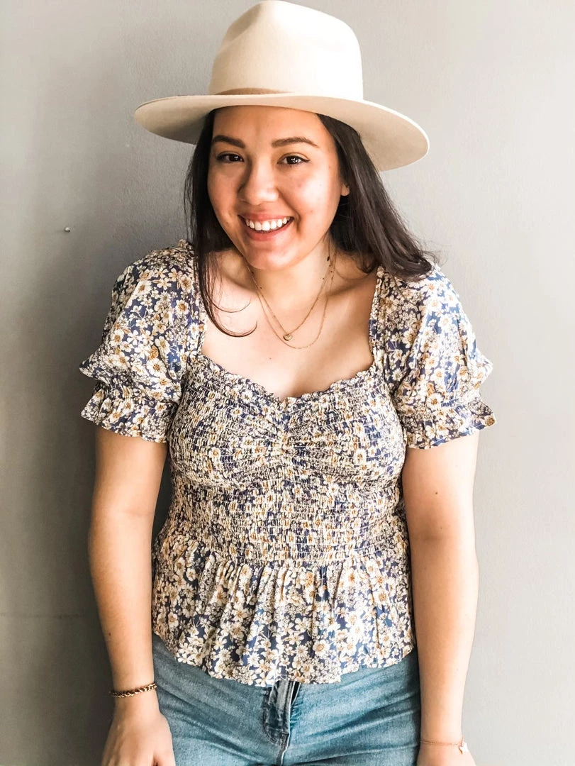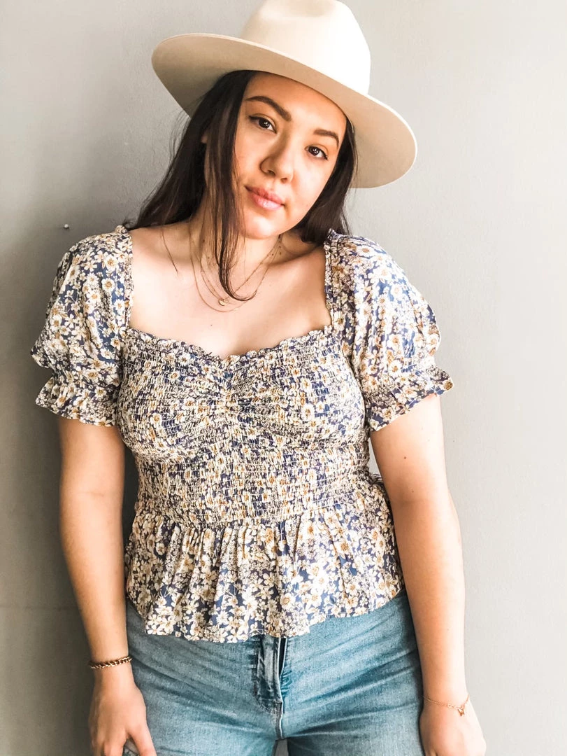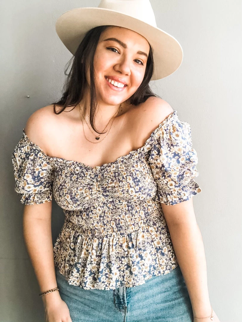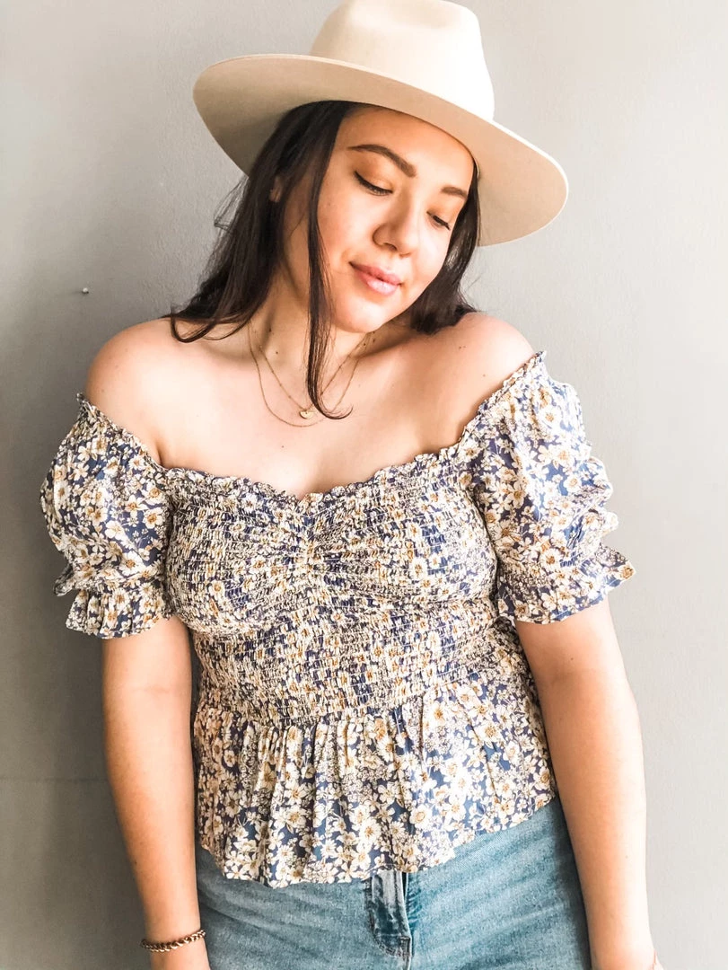 Absolutely in love with this newest drop!! All the sweet and fem details we love to wear season after season! A sweetheart style top with accentuated smocked bust and elasticated shoulders that will stay put if you wear them as a full sleeve or off the shoulder. Ruffle details to boot in the puff sleeves and hem of this fine floral number.