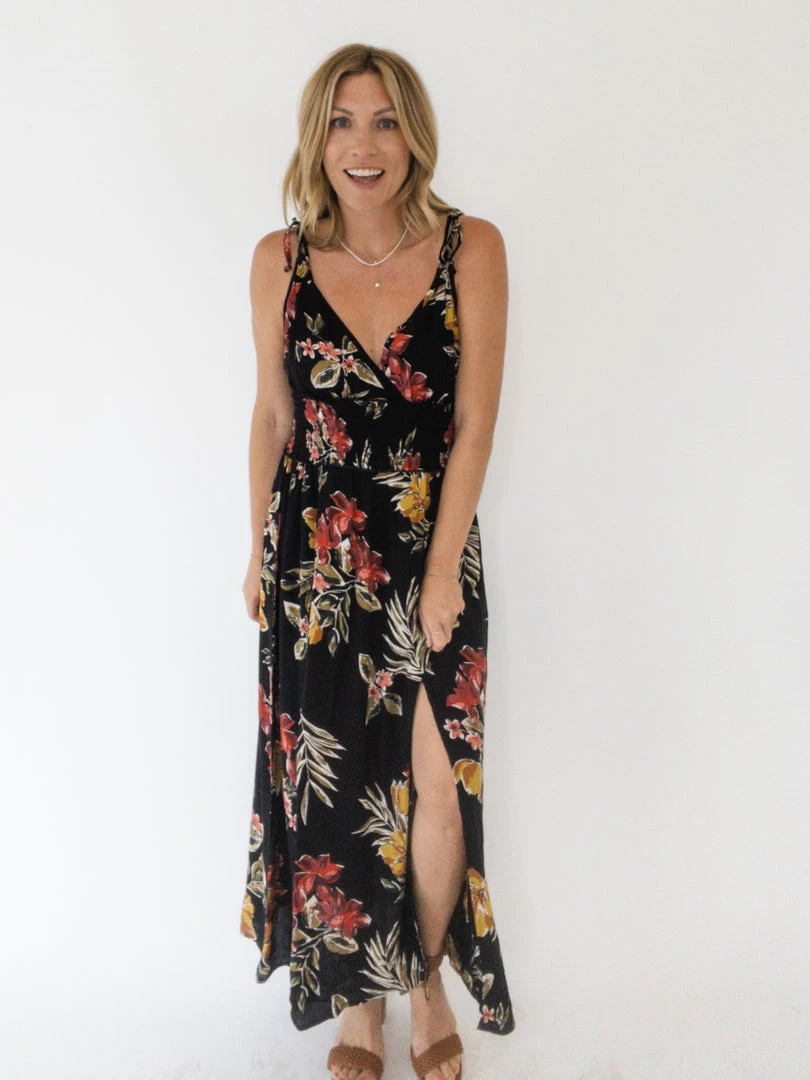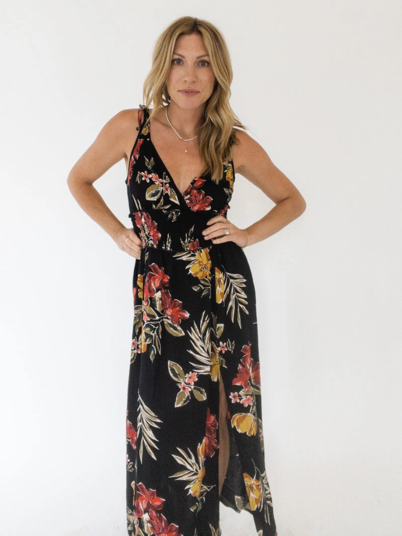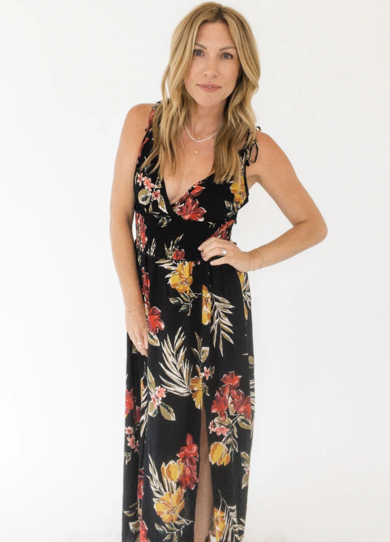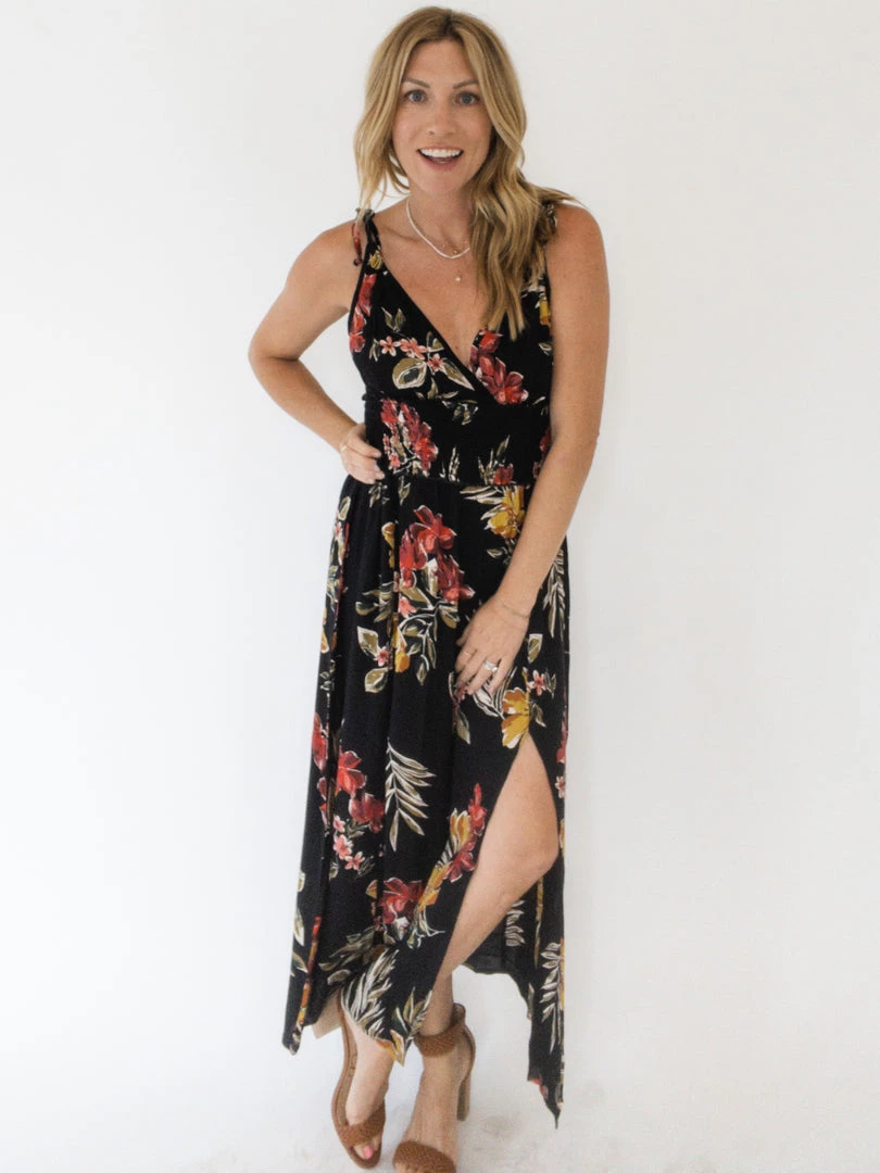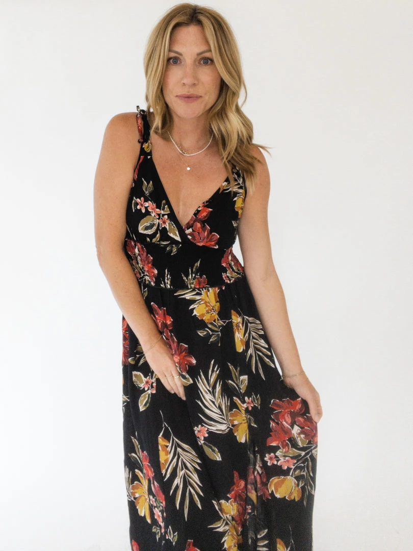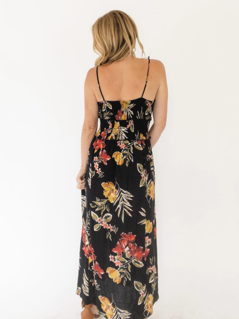 What we love so much about pieces like the Eden dress is how easy it is to toss on and go! A great neutral black base with an allover yellow, red and green floral print. It’s a universally flattering fit with adjustable tie shoulder and smocked bodice under the bust. With triangle cut bust and side slit. Prepare for plenty of wear!