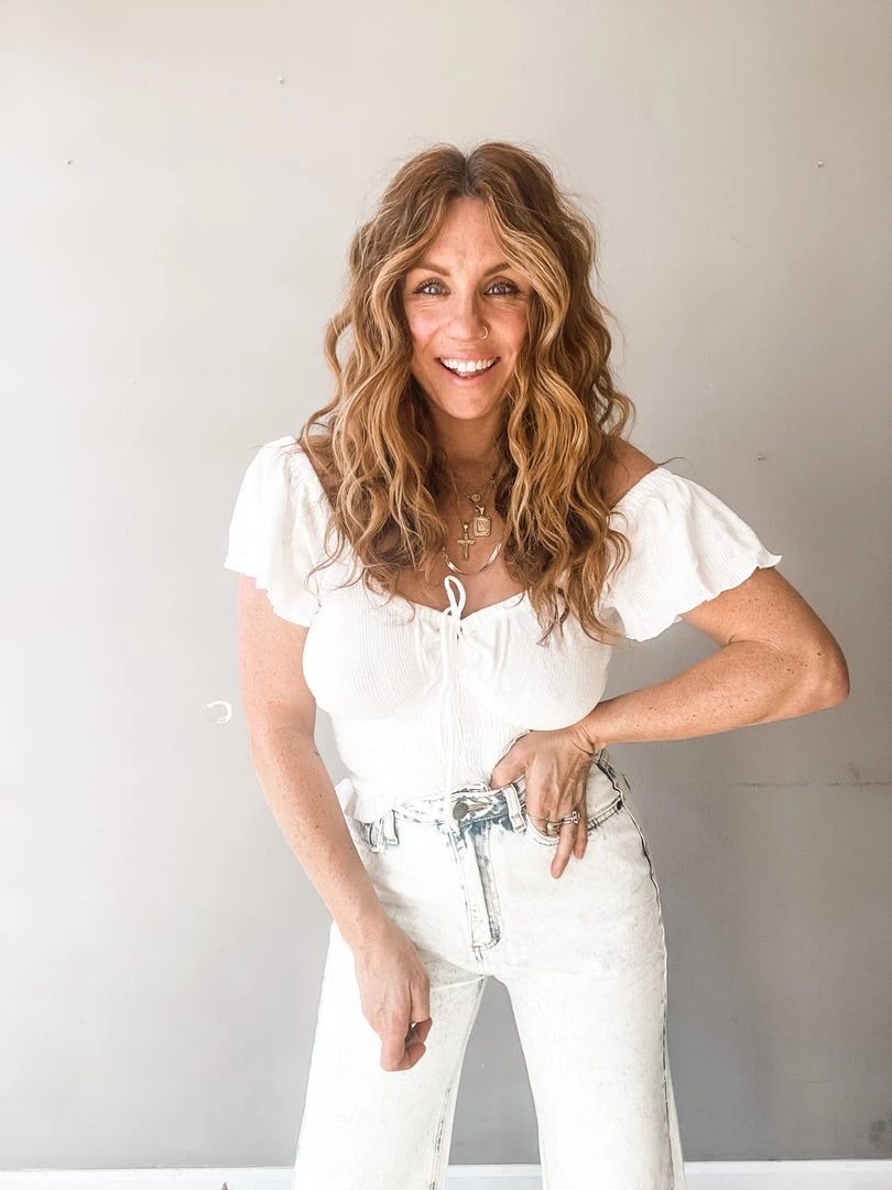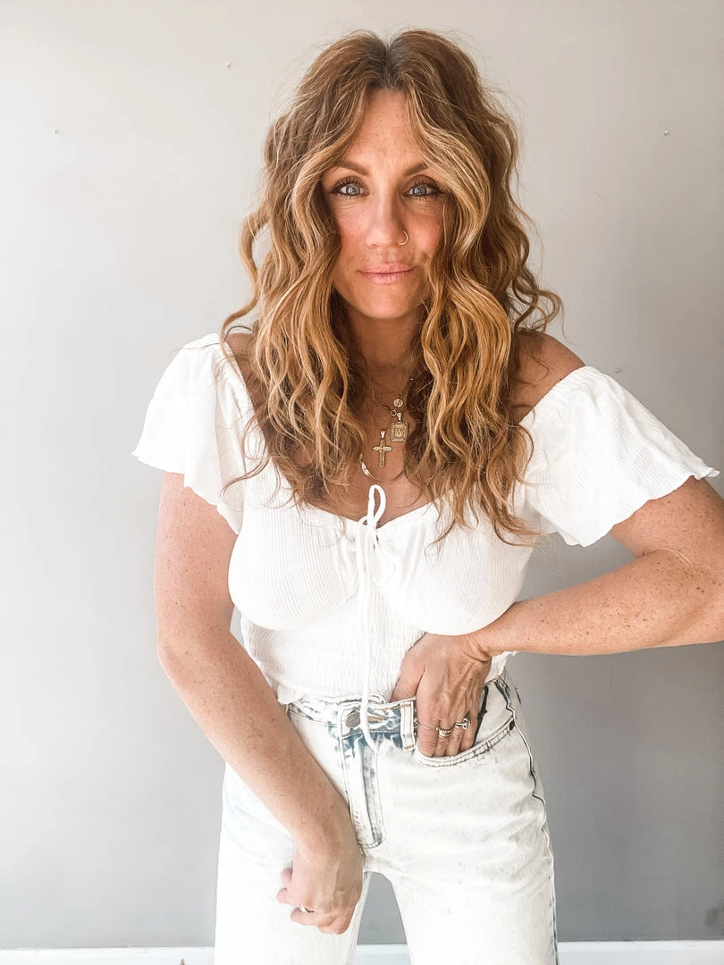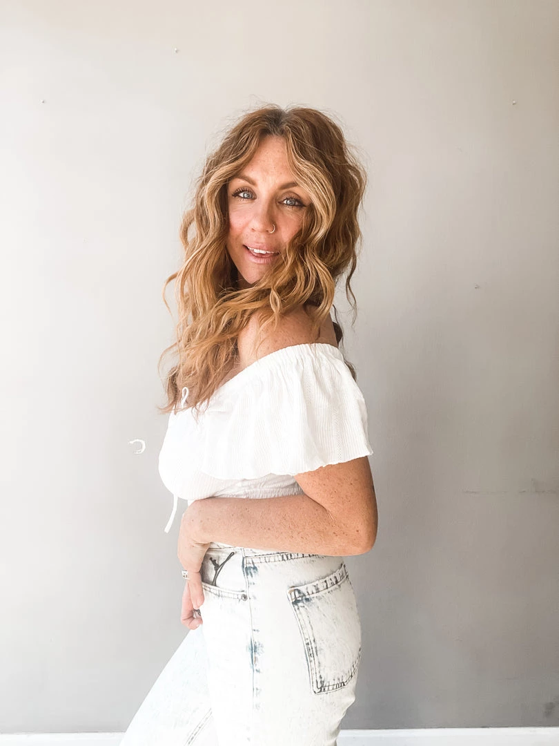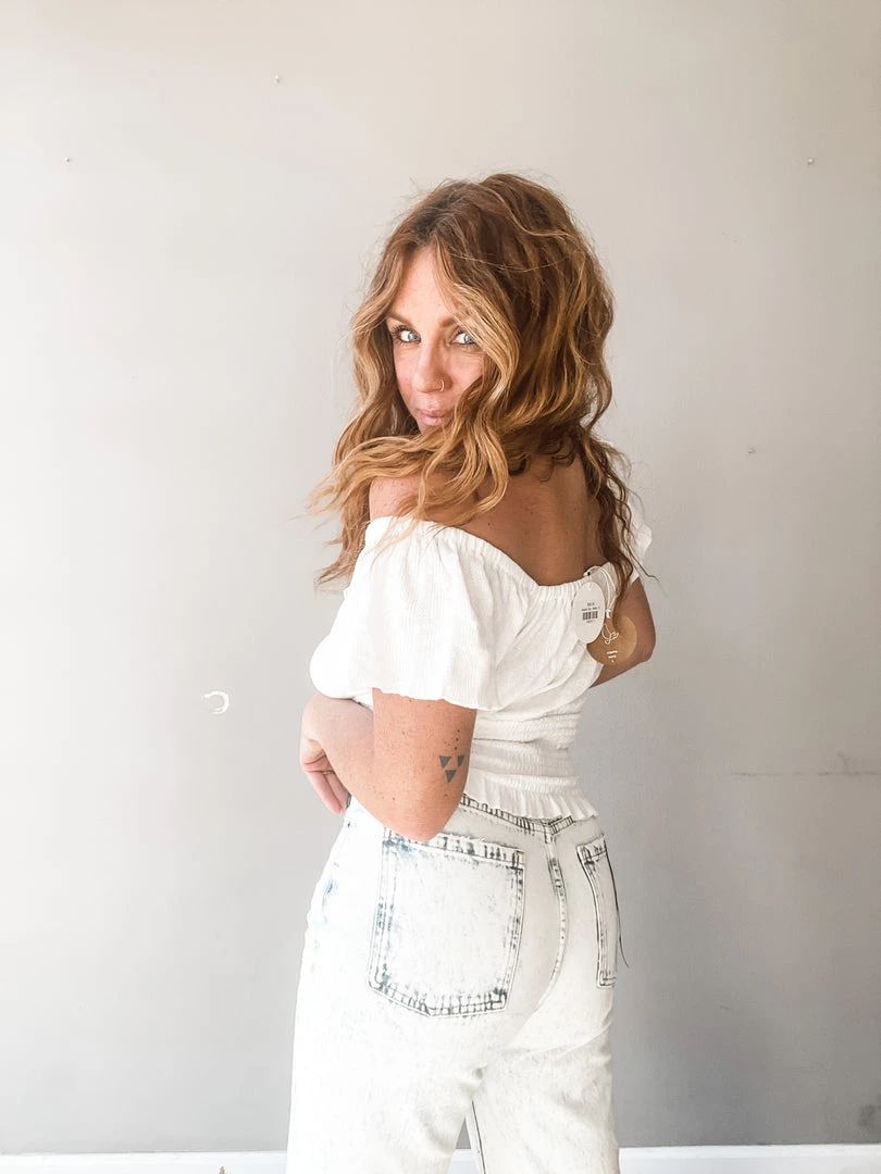 The Hyland Top is a chic and fun off the shoulder, flouncy sleeve top with a tie at the bustline. This fitted, classic, feminine top is so cute paired with high waisted denim tucked in or out.