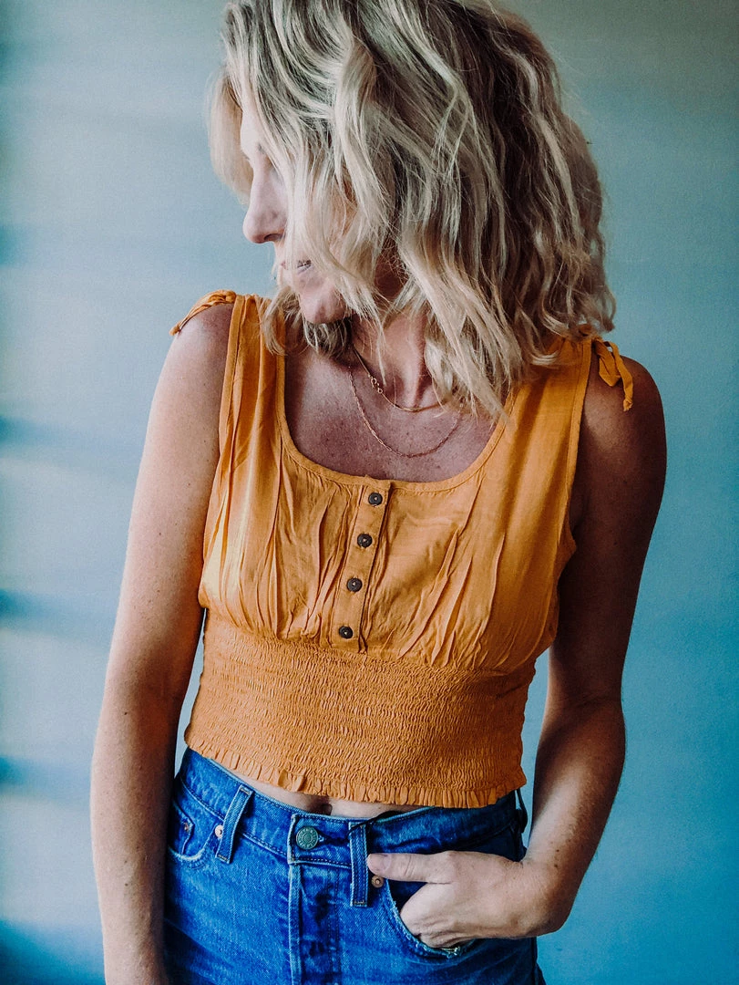 Cute little crop for these perfect sunny days. Easily paired with our Levi Wedgie for an everyday look we live for. Smocking on the lower half with button front and shoulder tie detail. Hits at the top of your high waisted denim.