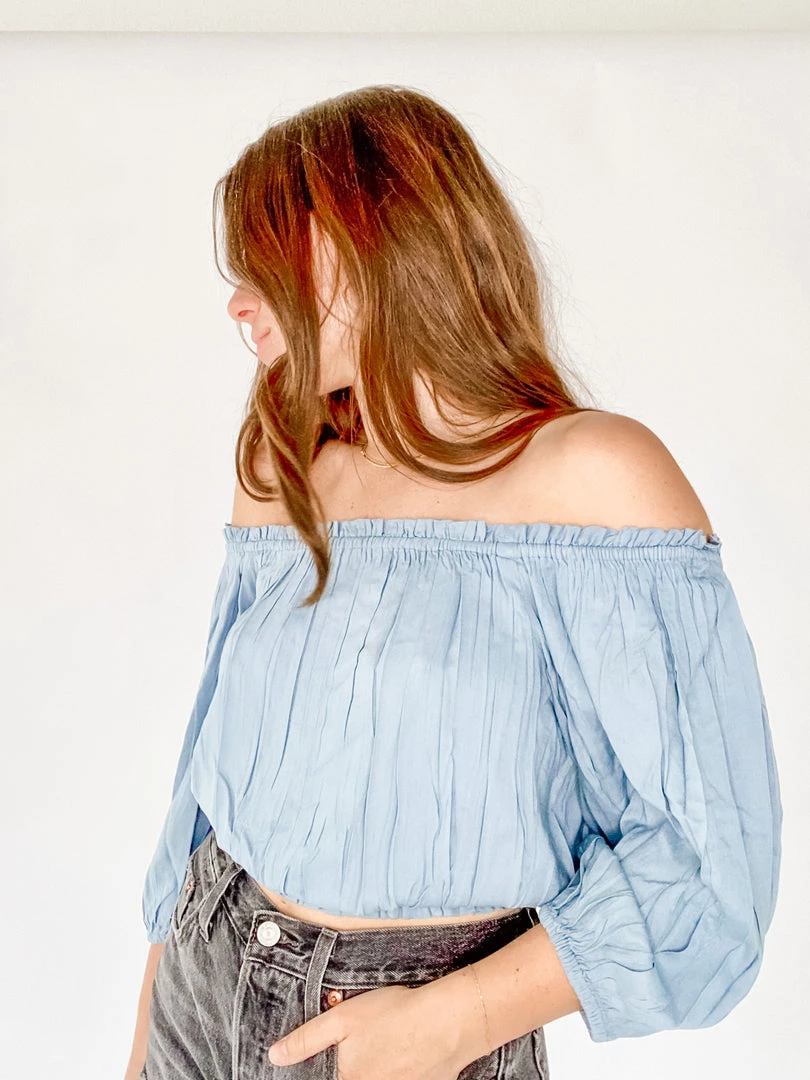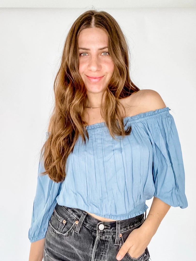 This little number is perfect for summer! It features an off the shoulder neckline, elastic cuffs around the arms to create a bubble sleeve, and a smocked hemline. it comes in a really nice ocean blue color that reminds you of the Italian Riviera.