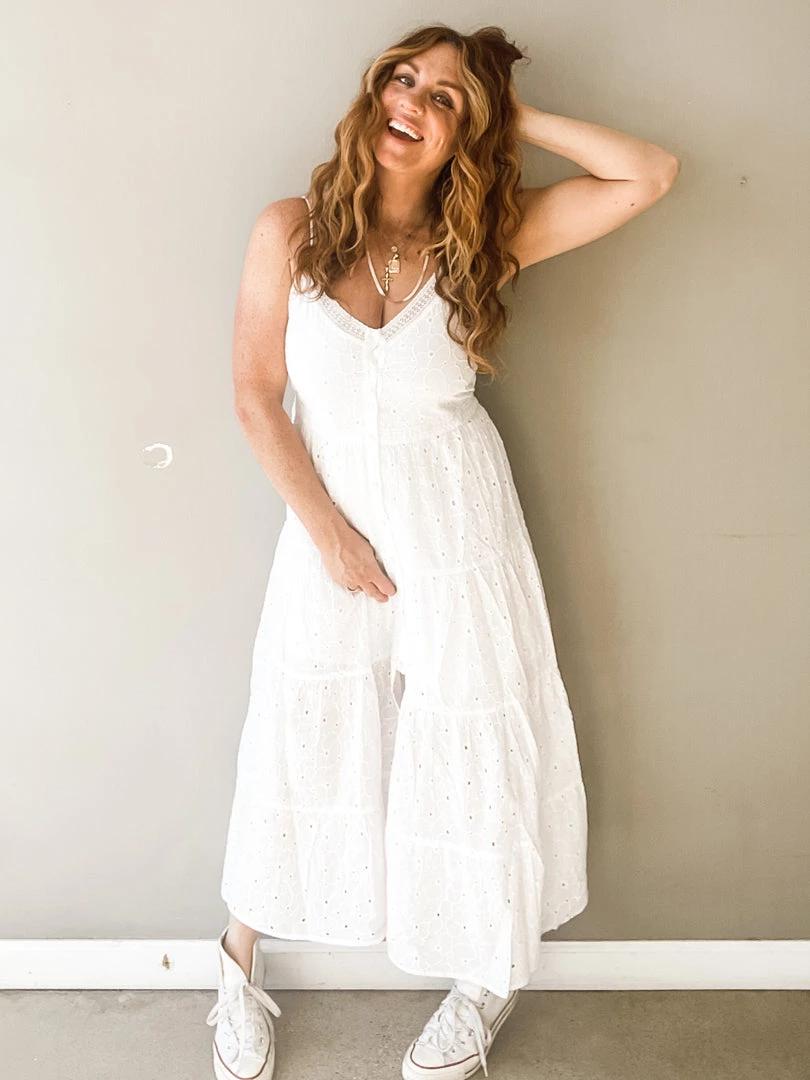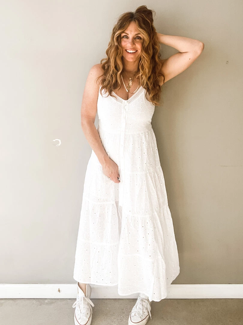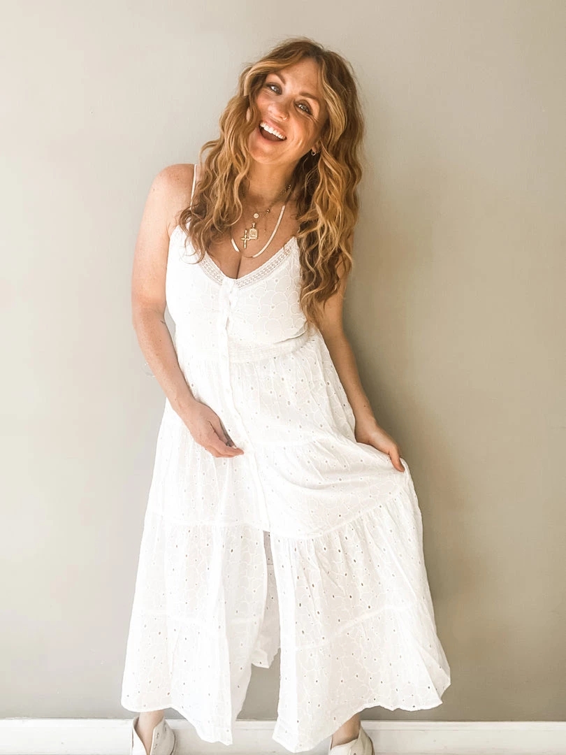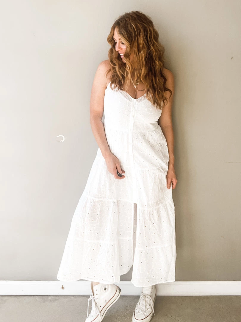 Talk about a pretty piece!!!! This amazing white button front dress has a shorter lining underneath, v neckline, adjustable straps and cute little front slit. And its the most feminine and adorable white crochet fabric. I love how simply summery this chic and timeless dress feels. Like floating on a cloud.