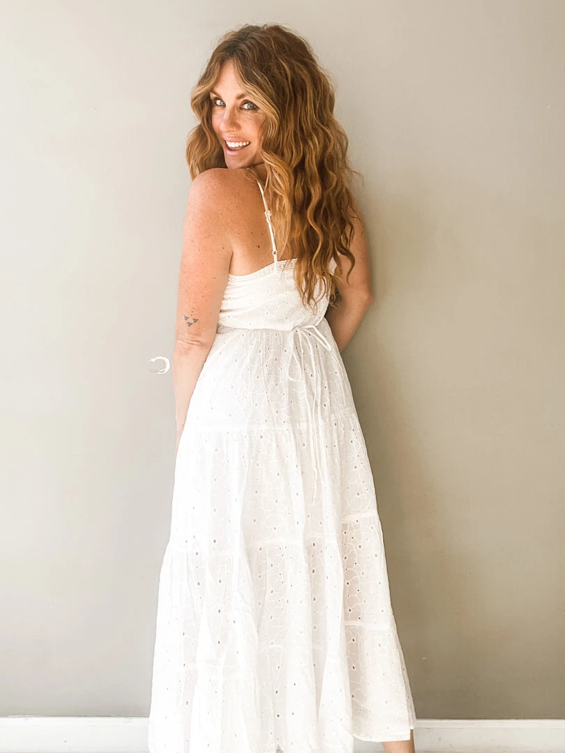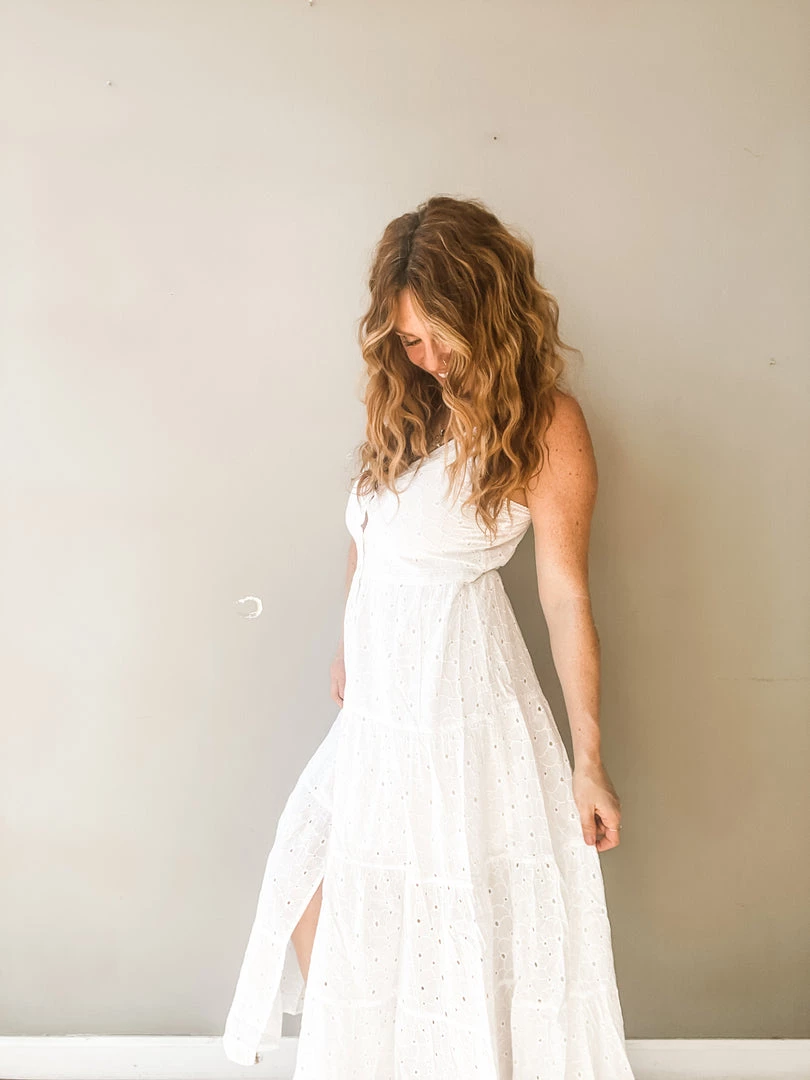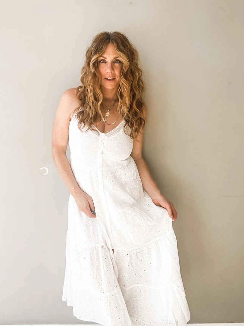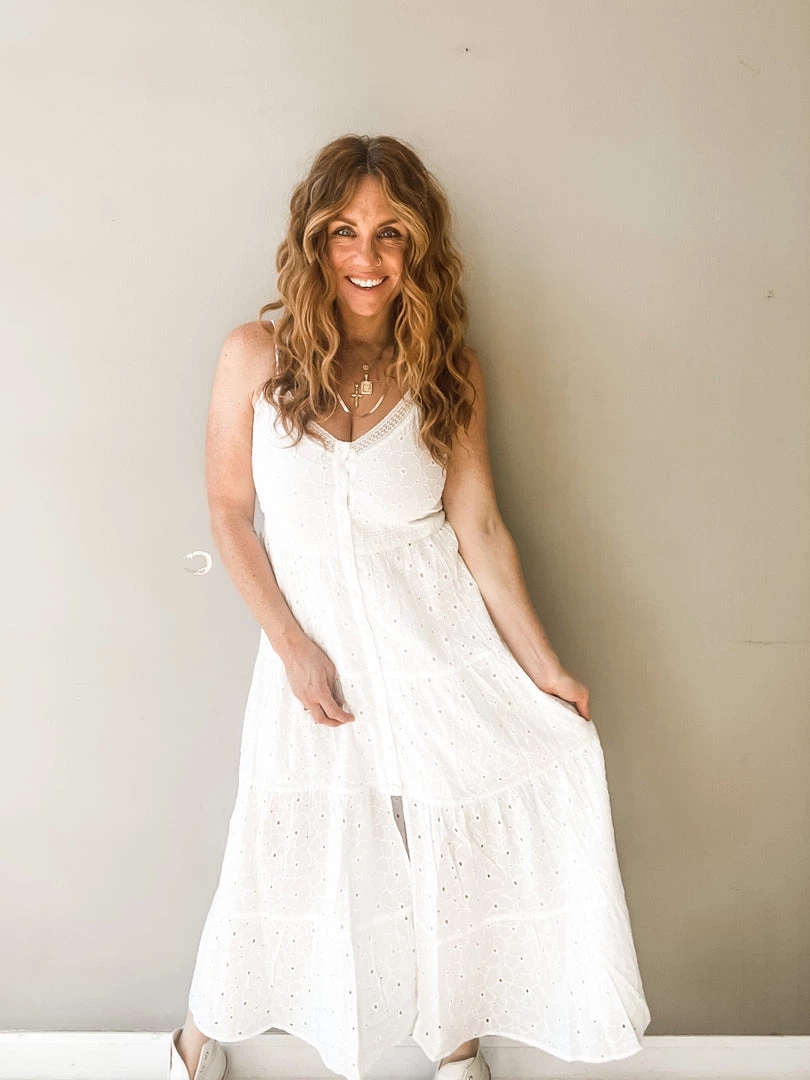 Talk about a pretty piece!!!! This amazing white button front dress has a shorter lining underneath, v neckline, adjustable straps and cute little front slit. And its the most feminine and adorable white crochet fabric. I love how simply summery this chic and timeless dress feels. Like floating on a cloud.