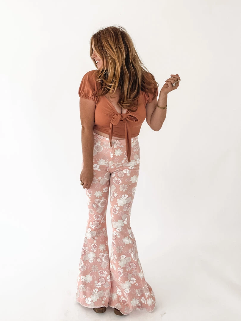 Taking us back with this retro floral flare leg pant. Features a pink and cream tone all over floral with a zipper and button front closure, high rise, rear pockets and kick flare with raw hem. Paired with a little crop and some killer high shoes that give all the retro vibes.
