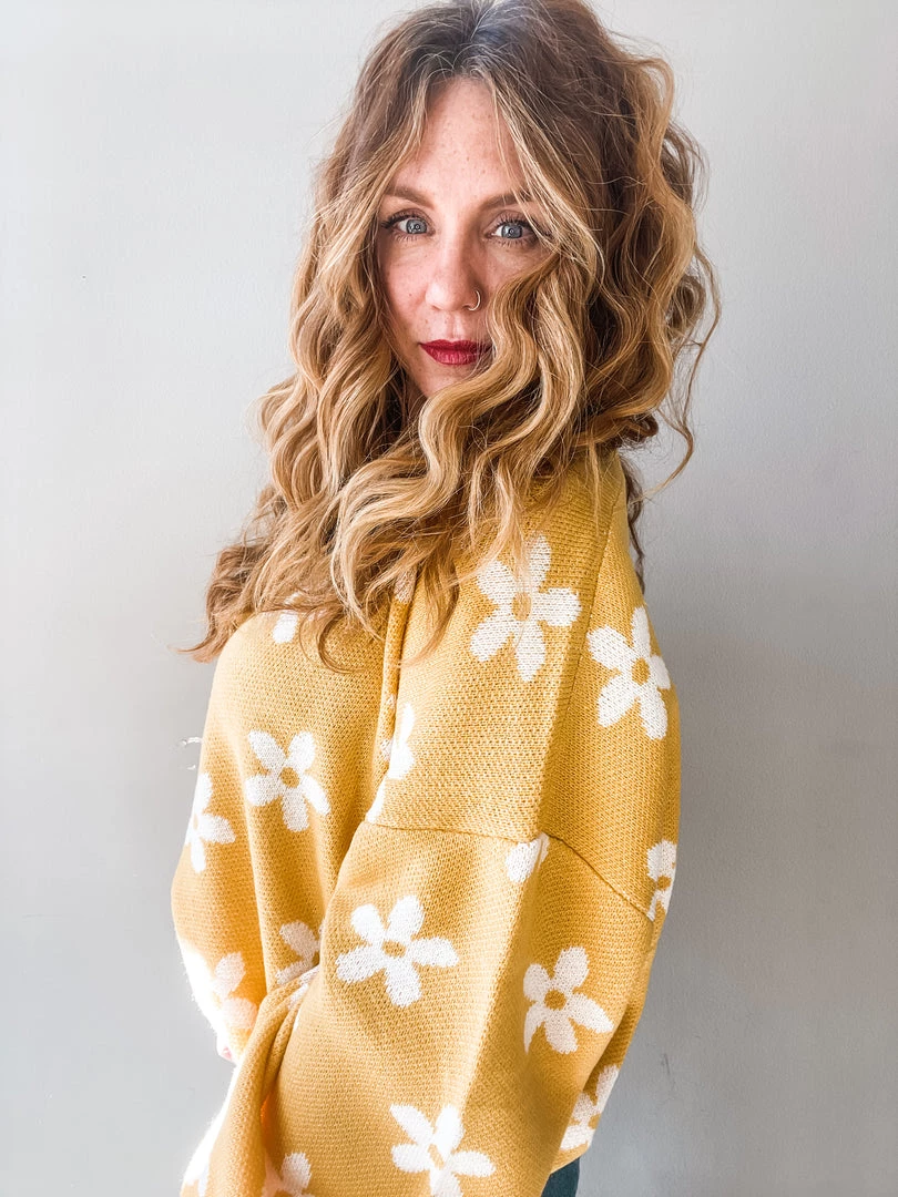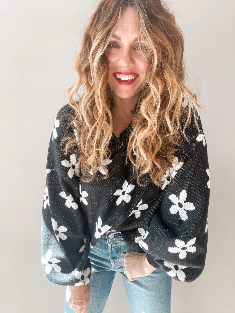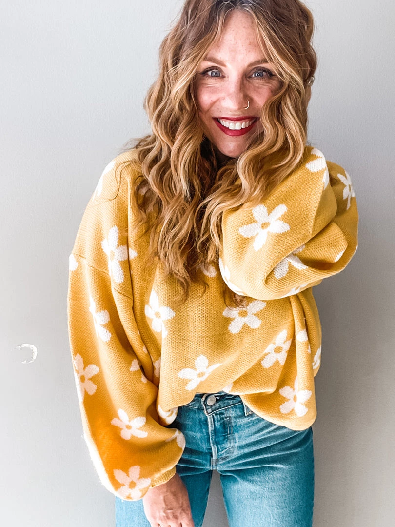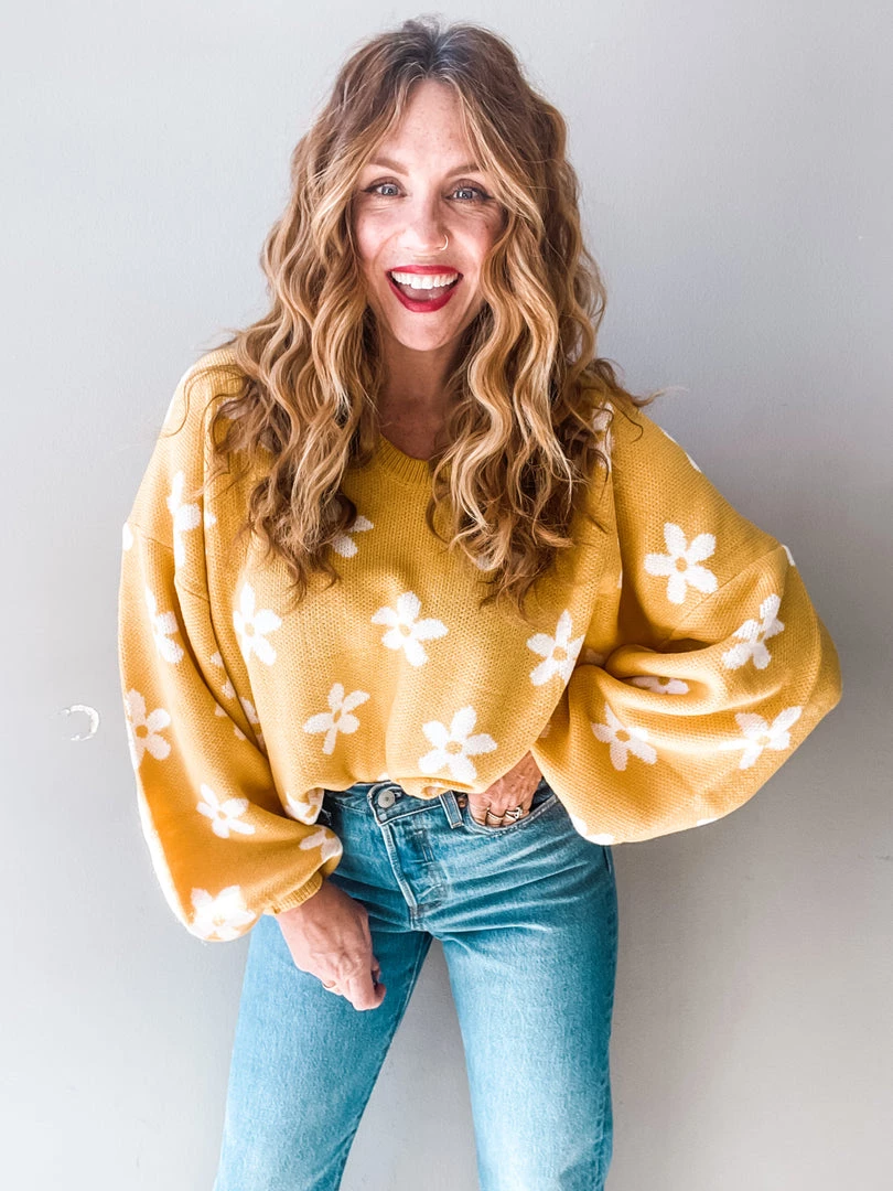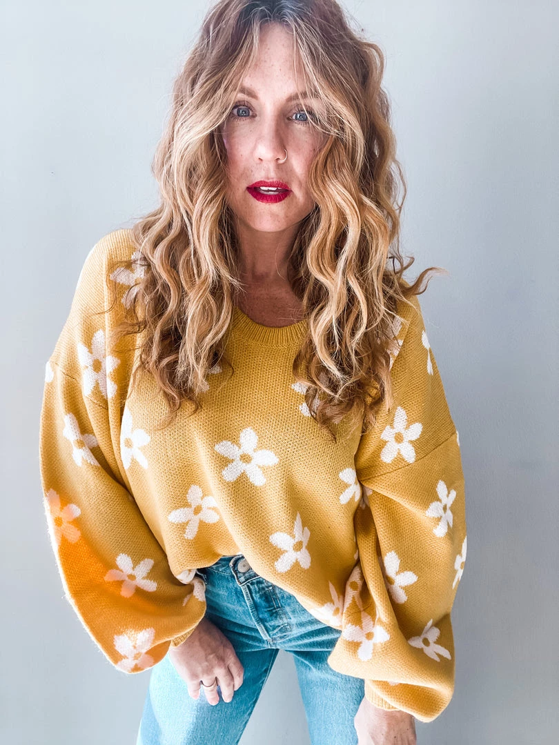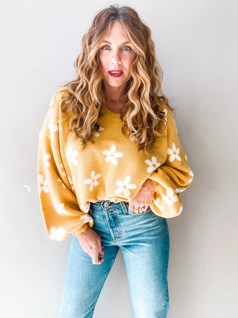 We love the retro vibes of this long sleeve knit sweater with sweet daisy print!! A loose fitting sweater with a wide crewneck and bubble sleeves. Available in a fun pop of mustard or in a classic black. The Dippin Daisies Sweater features banded trim wrists and hemline. An easy pair with some classic denim jeans.