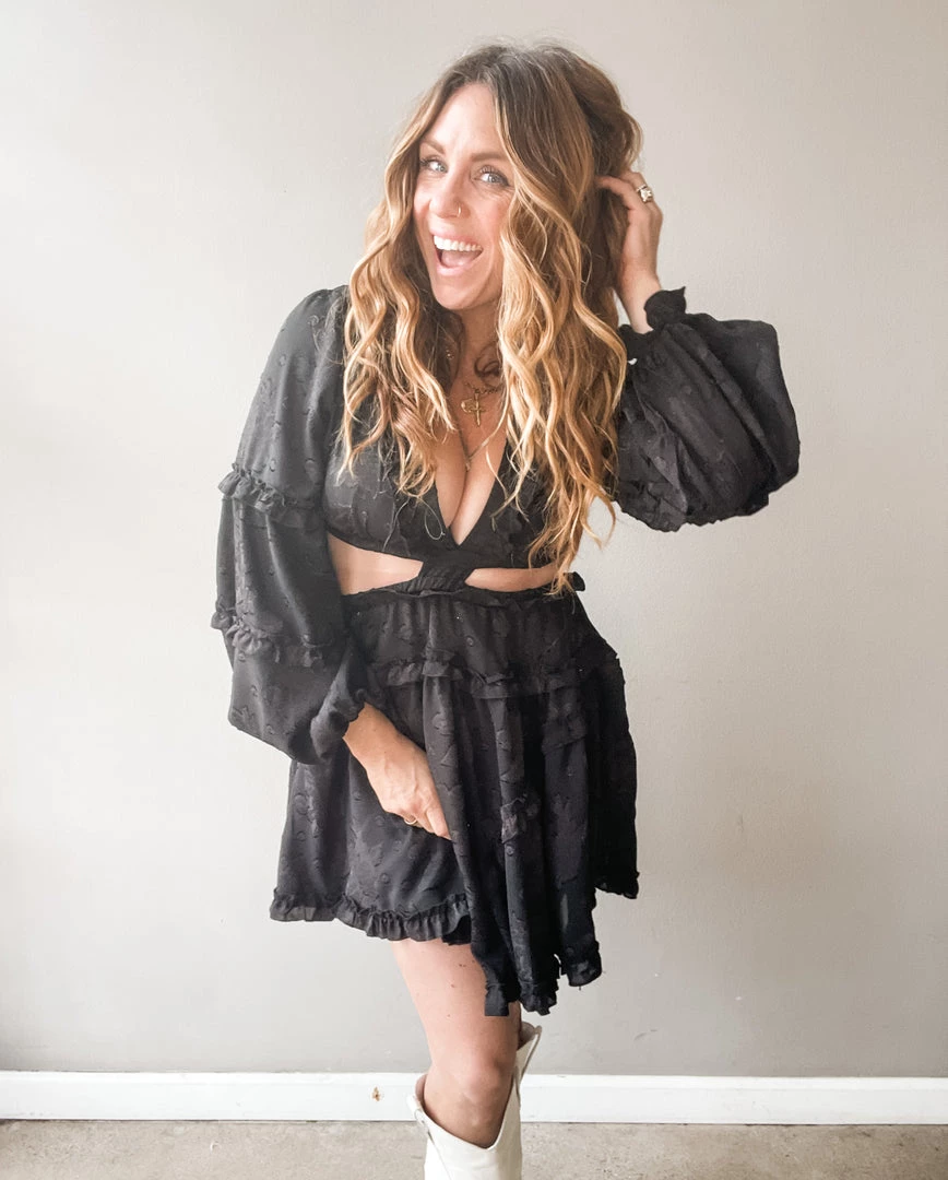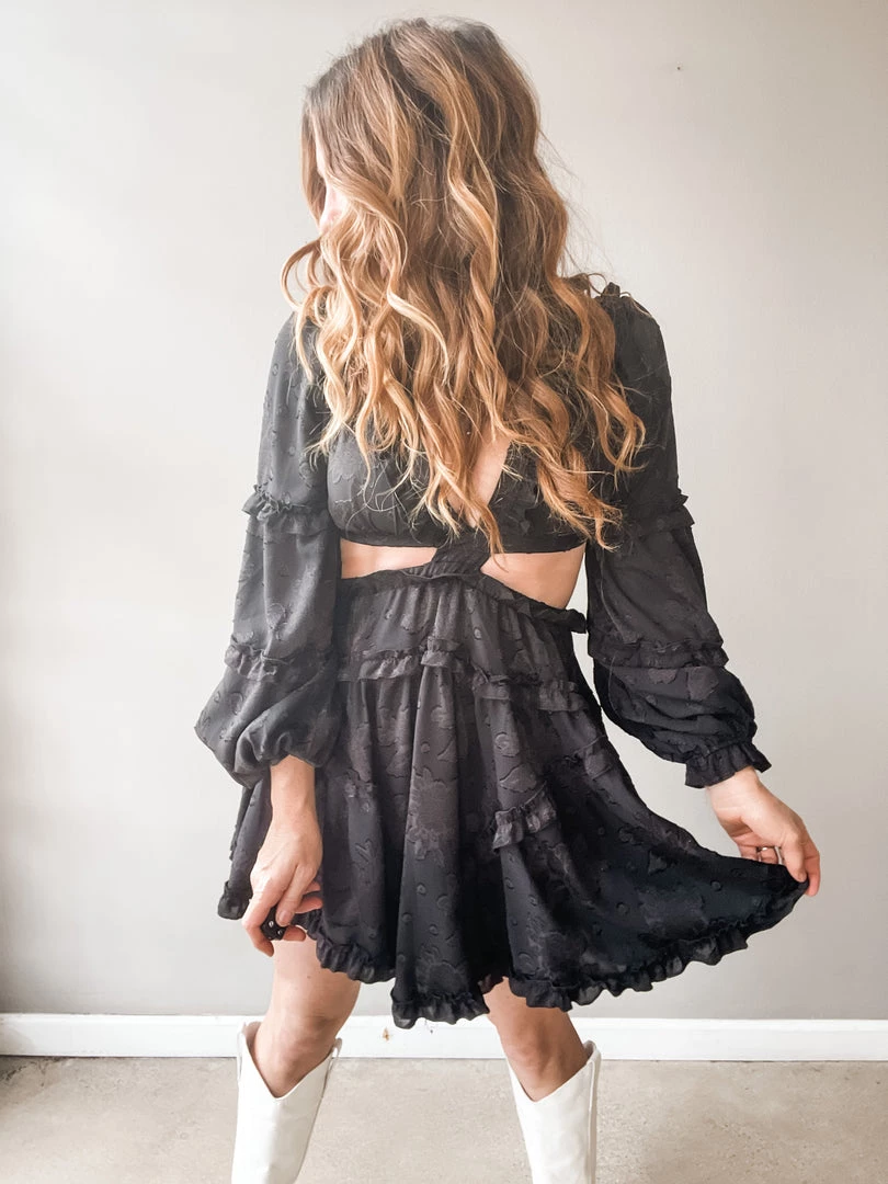 Such a fun update on a classic mini dress with its cut out details in the bust and stunning lace up back. All over polka dot and floral details adds some fun dimension to this flirty dress. A fixed front waistband with elasticated back and ruffle tiered skirt. Semi sheer long sleeves with elastic wrists and a double lined skirt and bust.