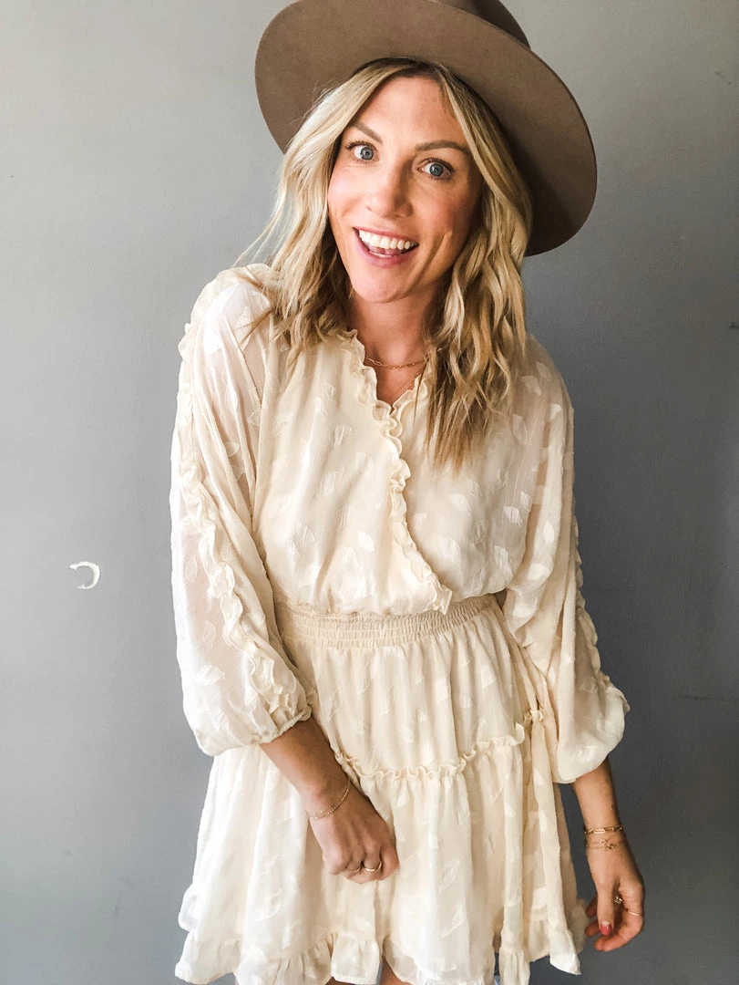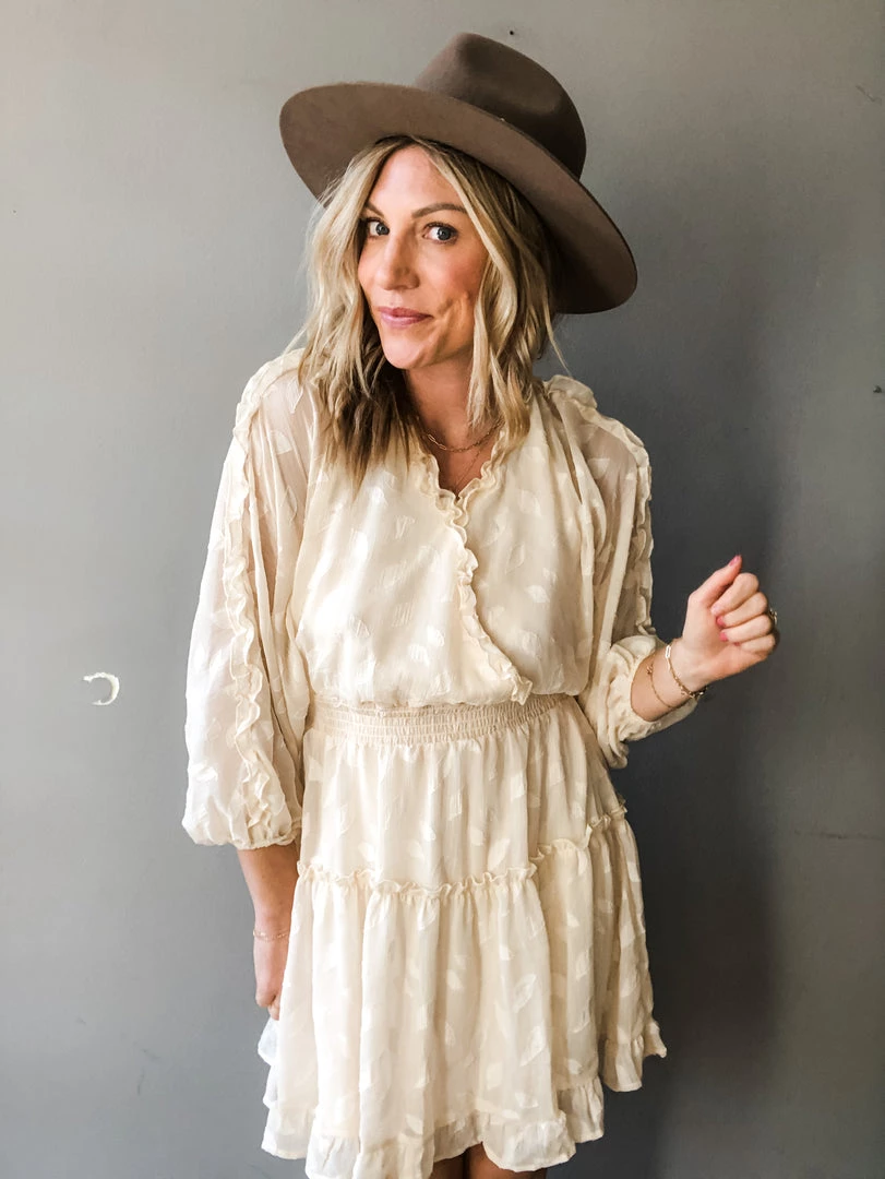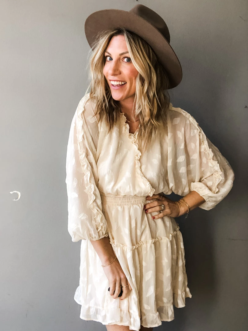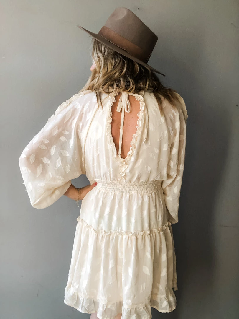 A floral butterfly sleeve mini dress that is so sweet and feminine. Ruffle details on the hemlines, elastic waist and open back with tie closure. A great dress for any special occasion. Lined.