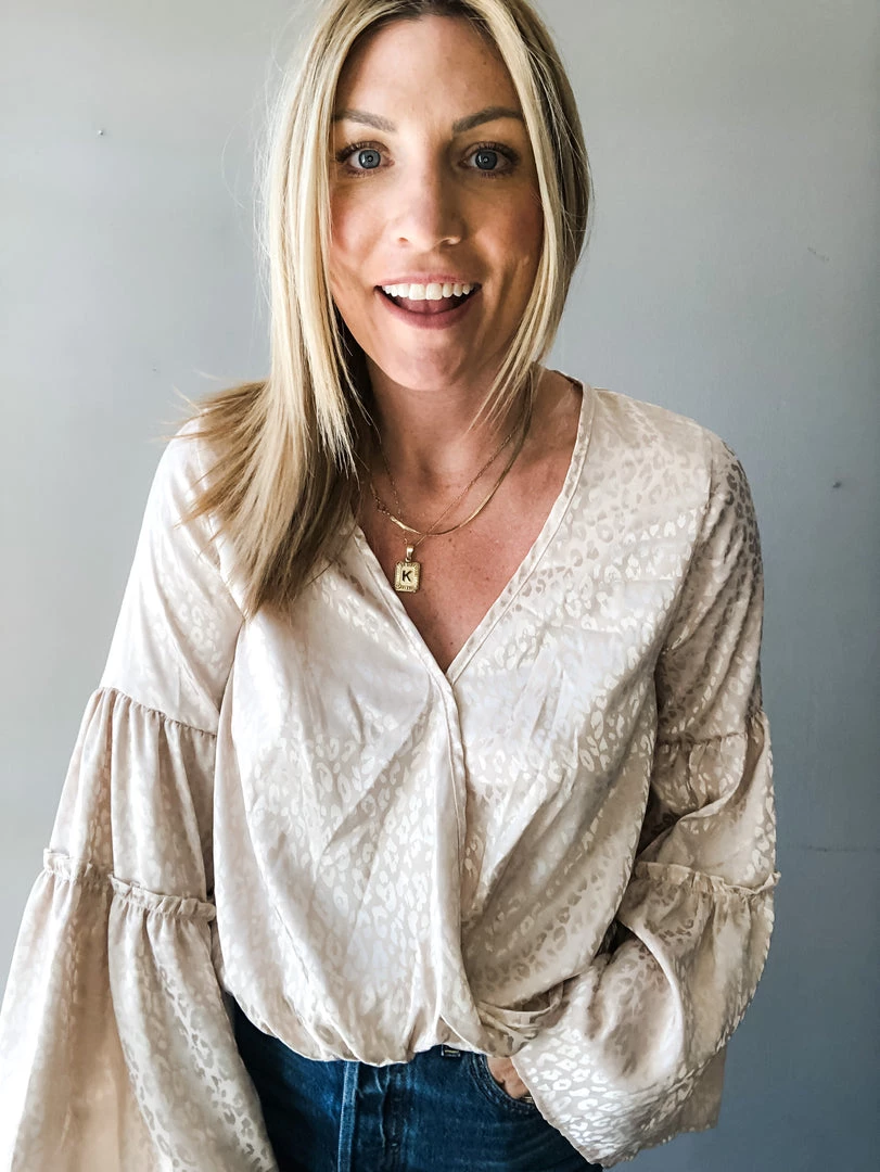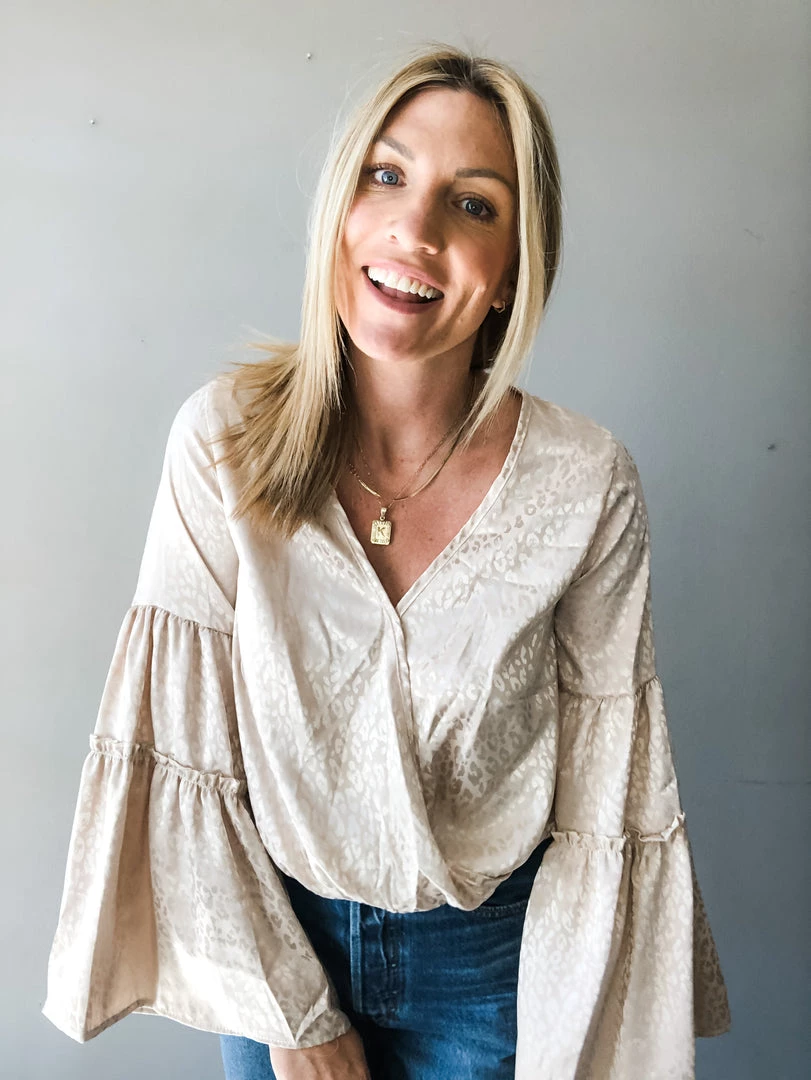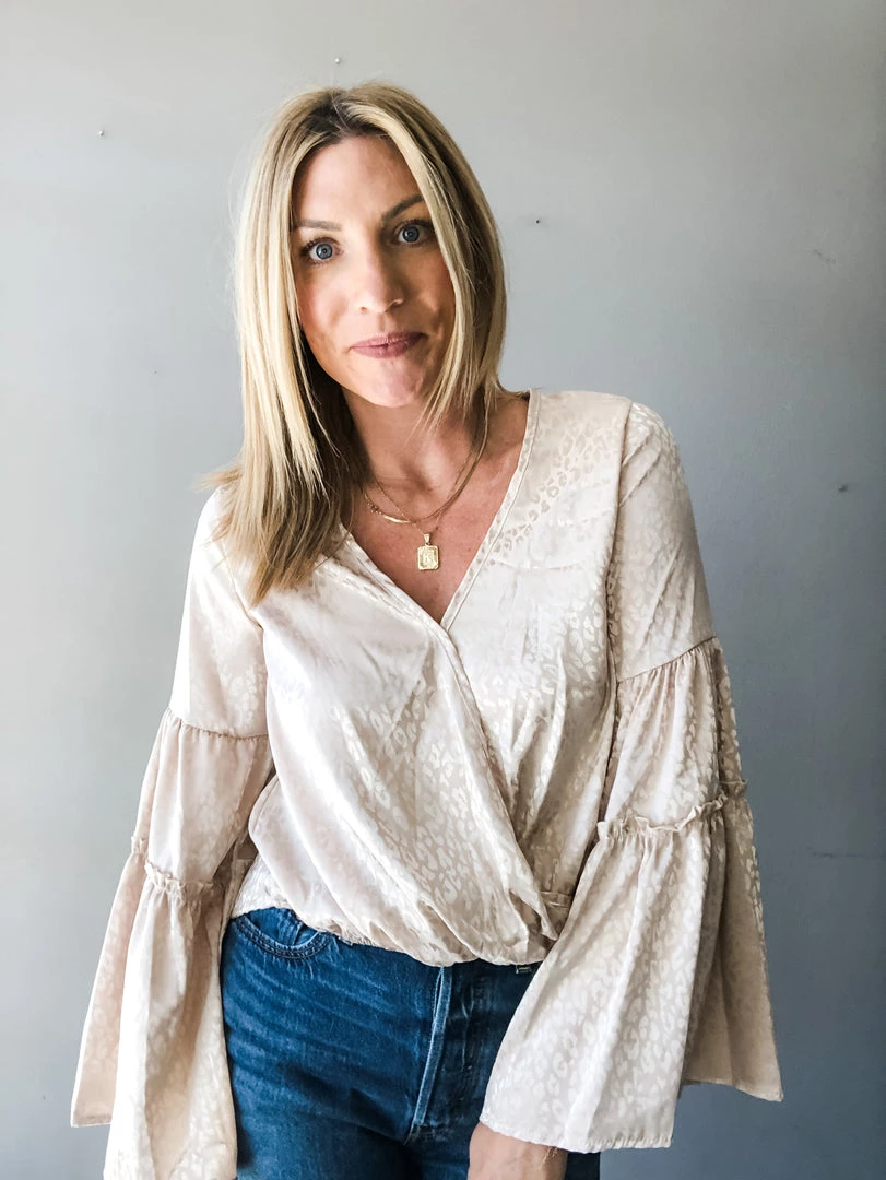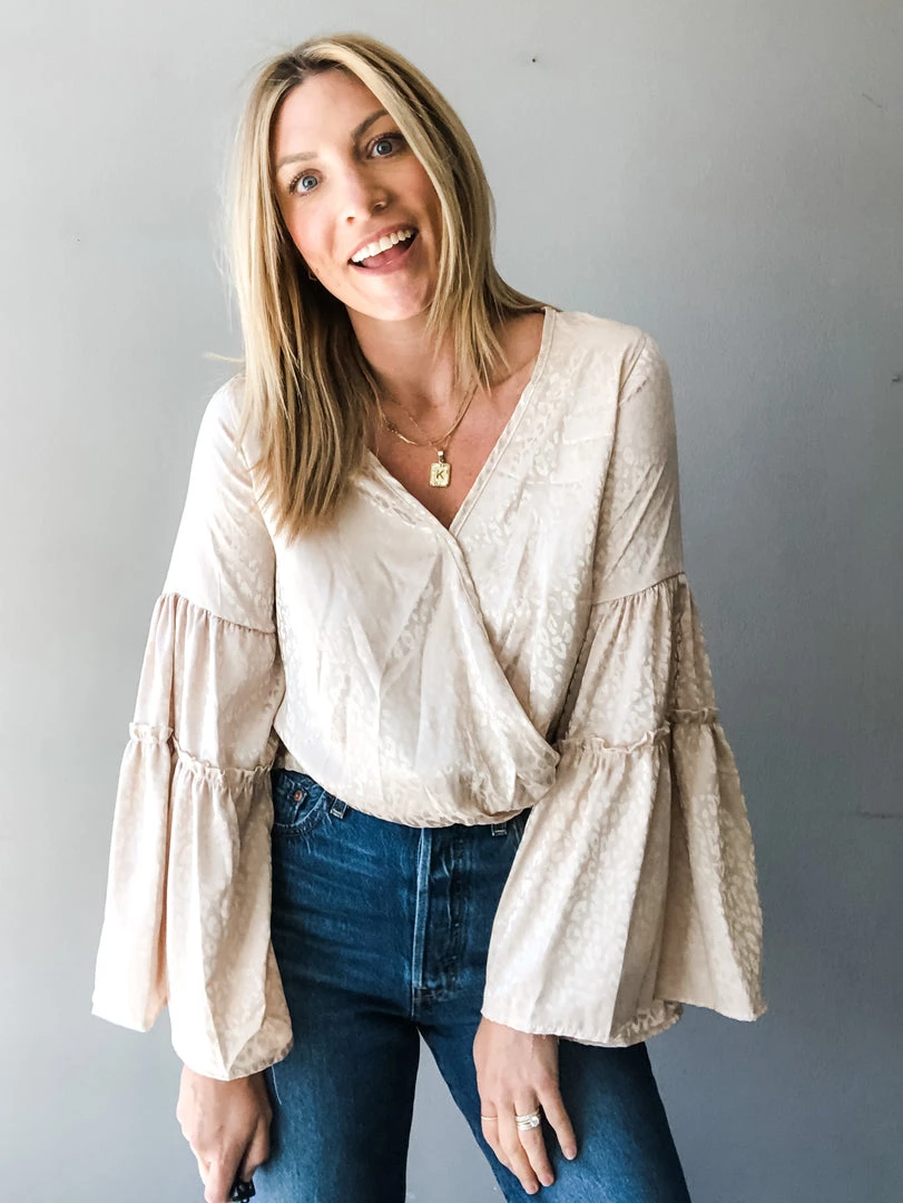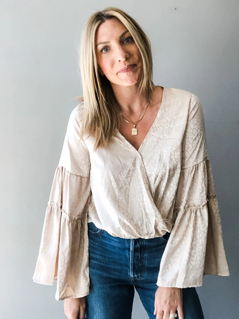 Show us a girl who doesn’t love a good leopard moment and we”ll show her the On The Prowl Top. A wrap style top with fixed stitched front to avoid any potential wardrobe malfunctions (we got you girl) in a must have a cream colorway. This flowy top will add a little glimmer to your eye with its leopard print that packs just the right amount of subtle sheen. A showstopper with dramatic but functional ruffle tiered sleeves. Elasticated front waistline makes for a slight bubble style top that hits a little shorter in the front and is great for work or play.