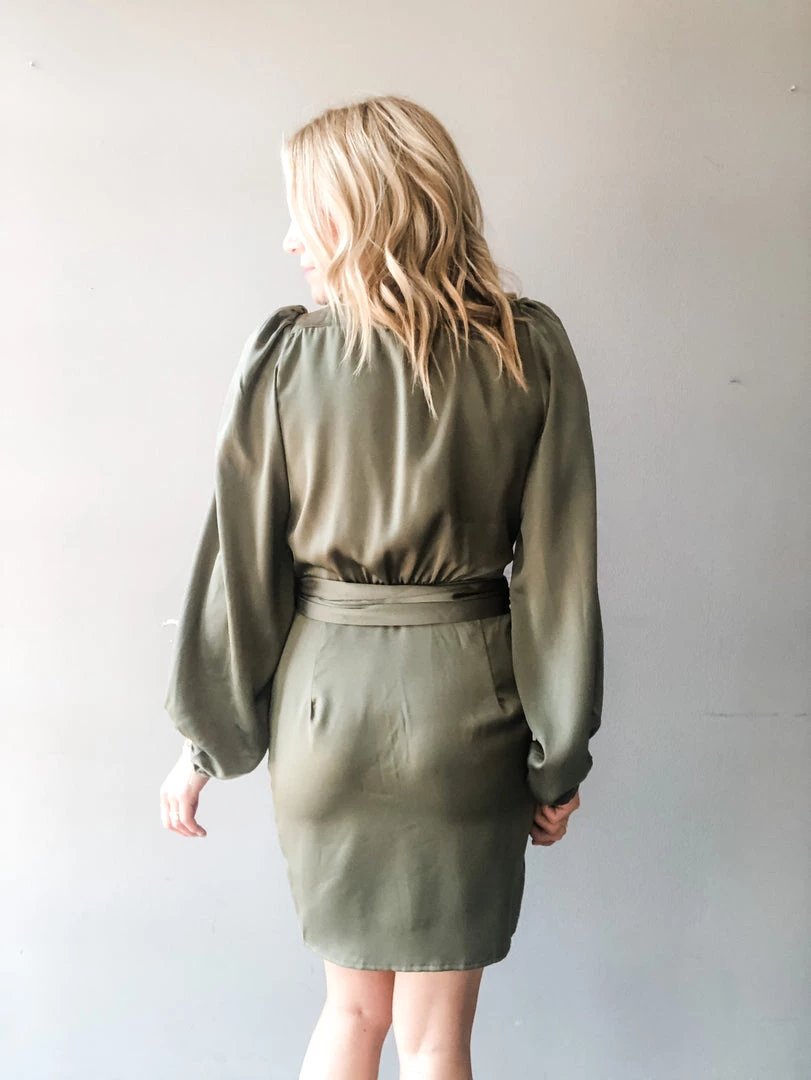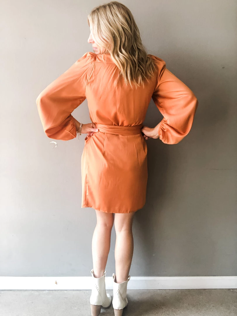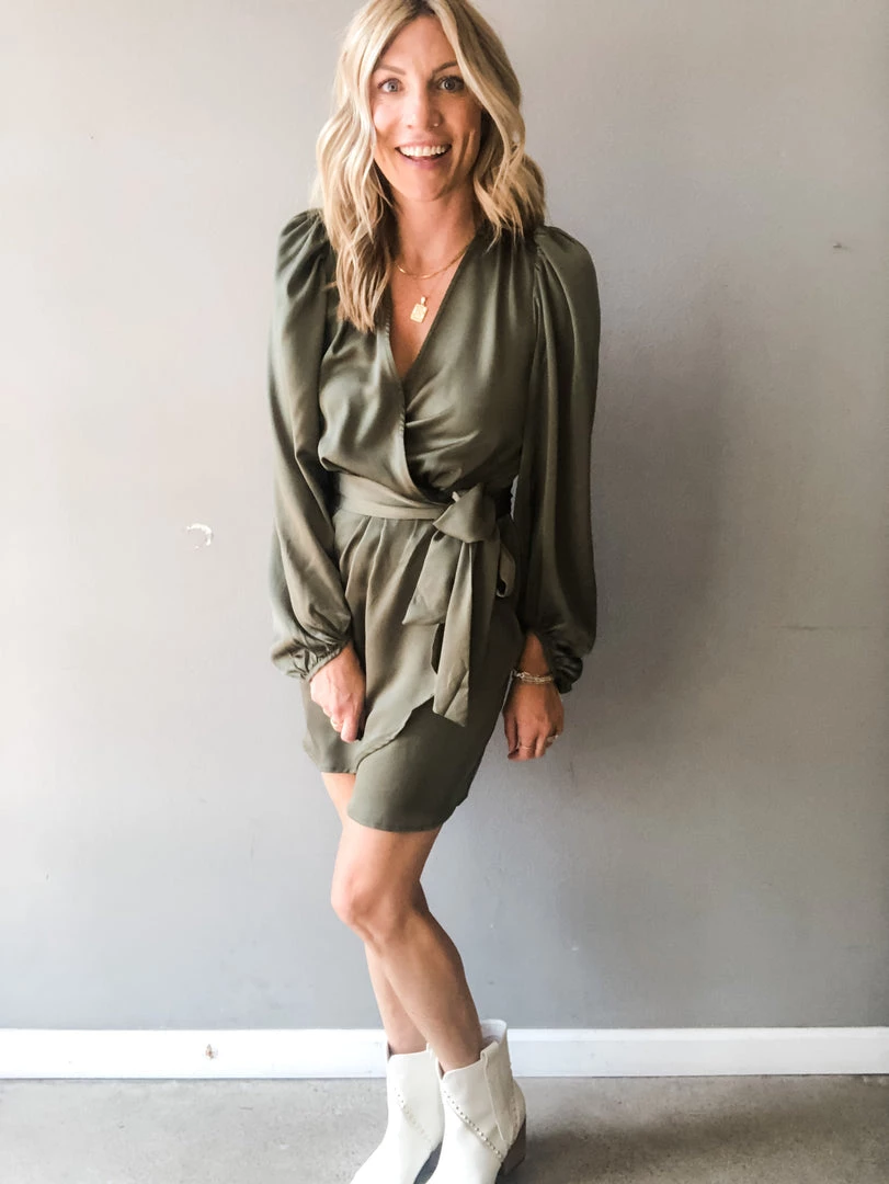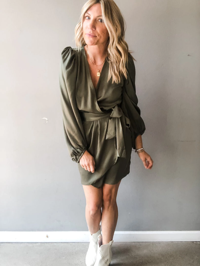 Turn heads in this silk wrap style mini dress. In a rust or olive color way, this special occasion dress features a wrap with two fixed buttons, a thick tie at the side, puff shoulders and loose balloon sleeves. Perfect for a wedding, reunion or holiday party. Pair with booties or a heel to complete the look in this sophisticated mini dress.