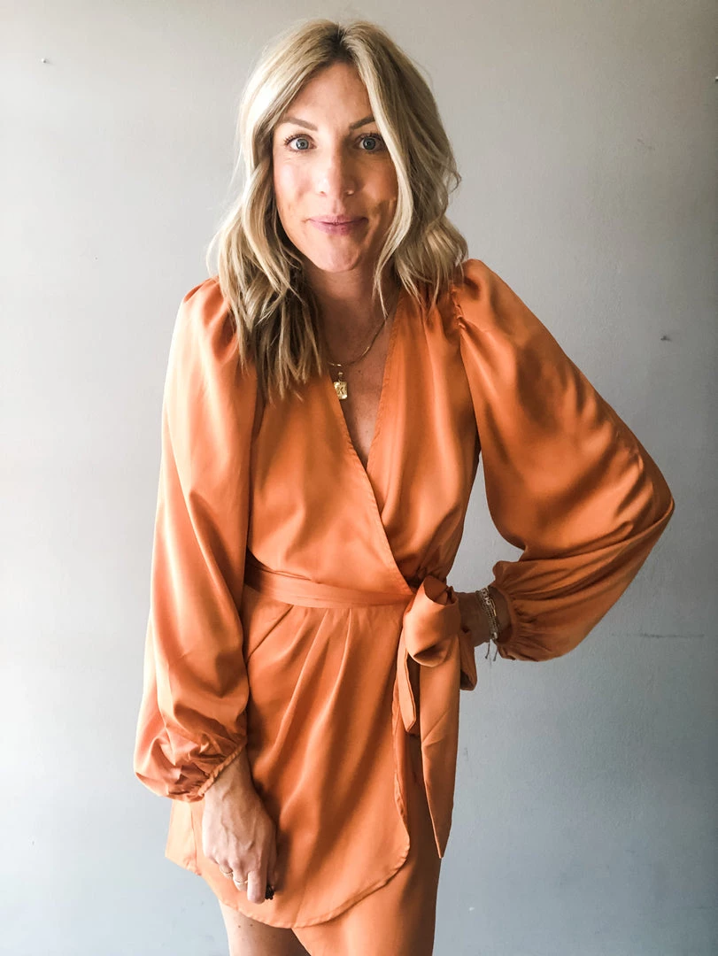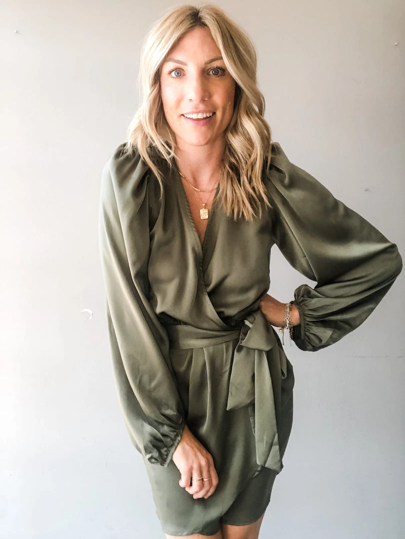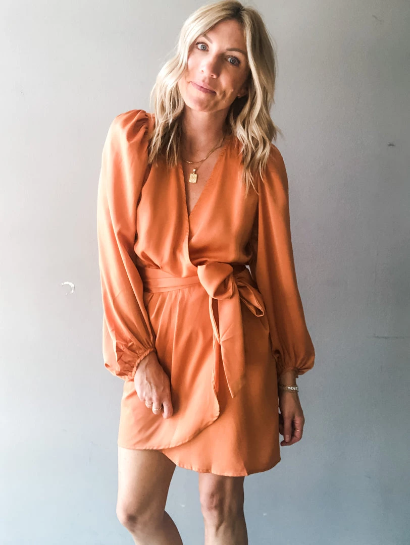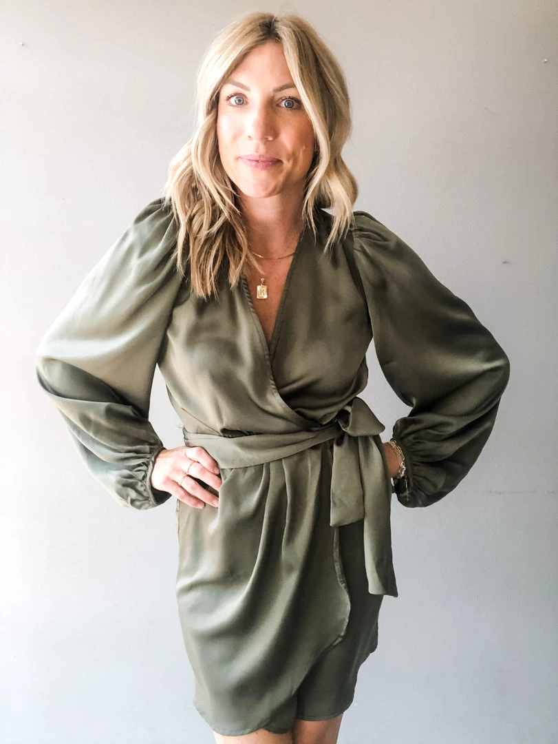 Turn heads in this silk wrap style mini dress. In a rust or olive color way, this special occasion dress features a wrap with two fixed buttons, a thick tie at the side, puff shoulders and loose balloon sleeves. Perfect for a wedding, reunion or holiday party. Pair with booties or a heel to complete the look in this sophisticated mini dress.