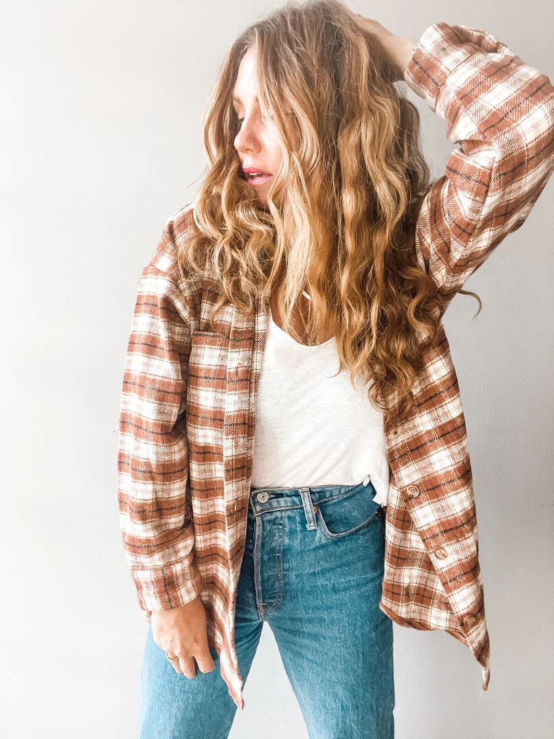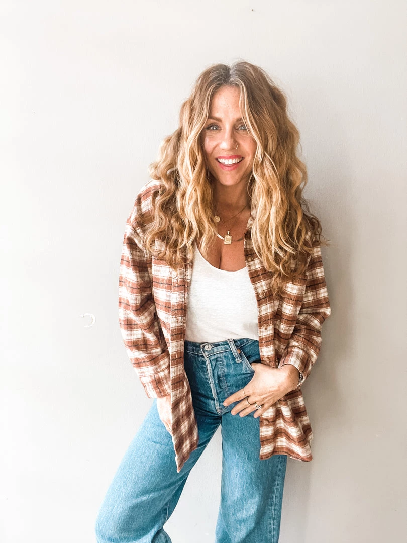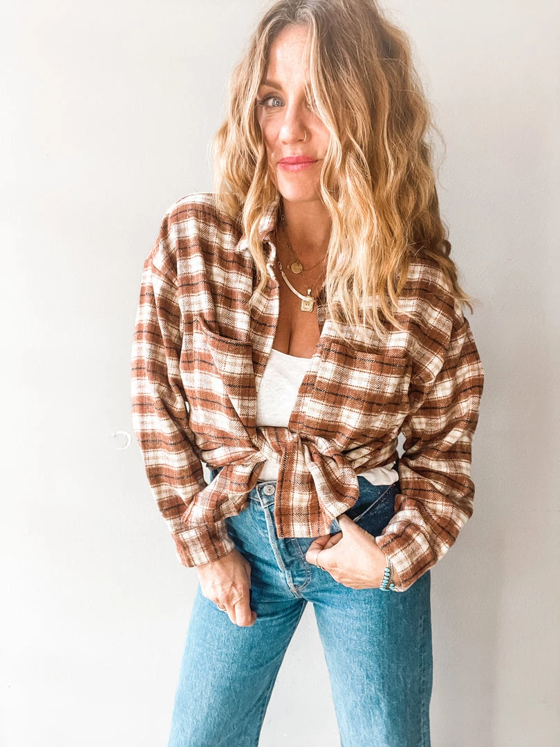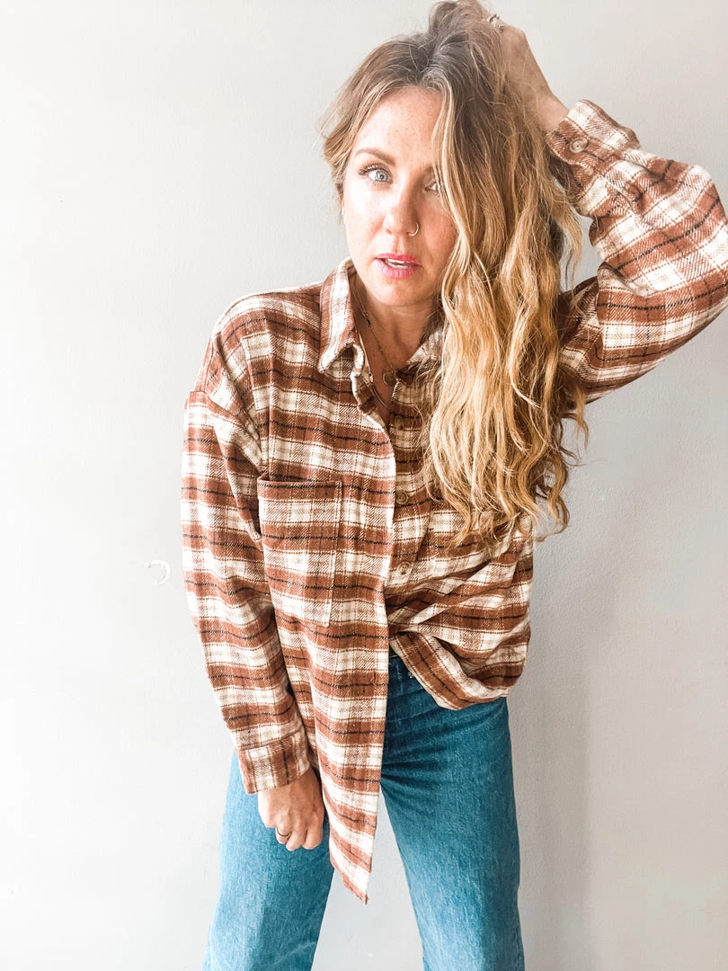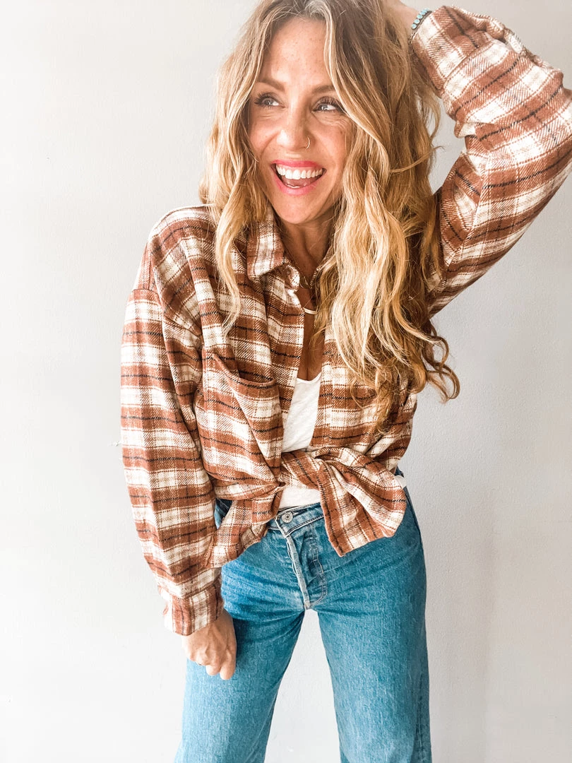 The type of button down you’ll wear all season long!! Perfect for those chilly Fall morning coffee runs, pumpkin patch pics or just hitting your favorite watering hole for a hot toddy with your gals. This brown and ivory plaid long sleeve is just the right amount of warm and cozy. It’s the type of flannel that gets better with every wear. A classic fitting top with button down front and breast pocket details. Toss over any layered look and wear it as a shacket or knot it up for a fun twist on a wardrobe staple.