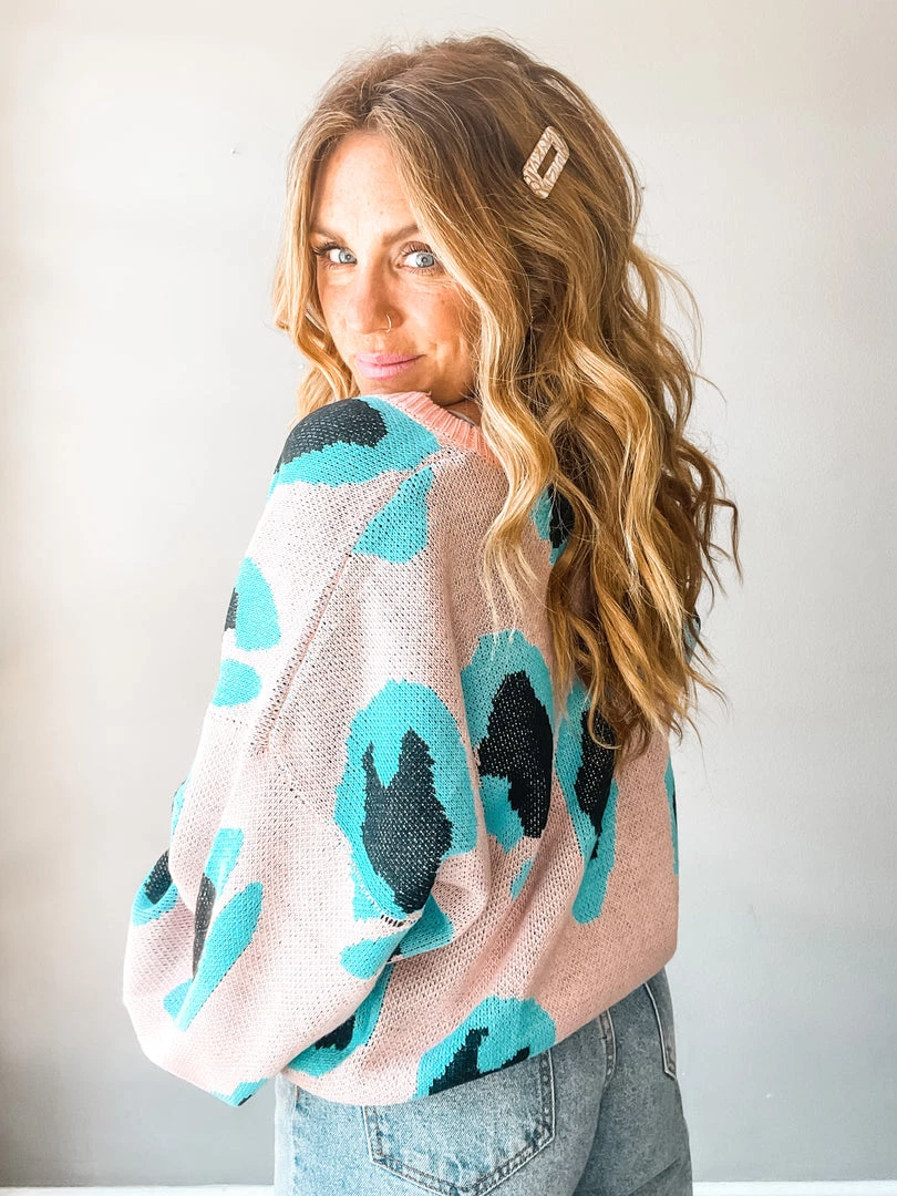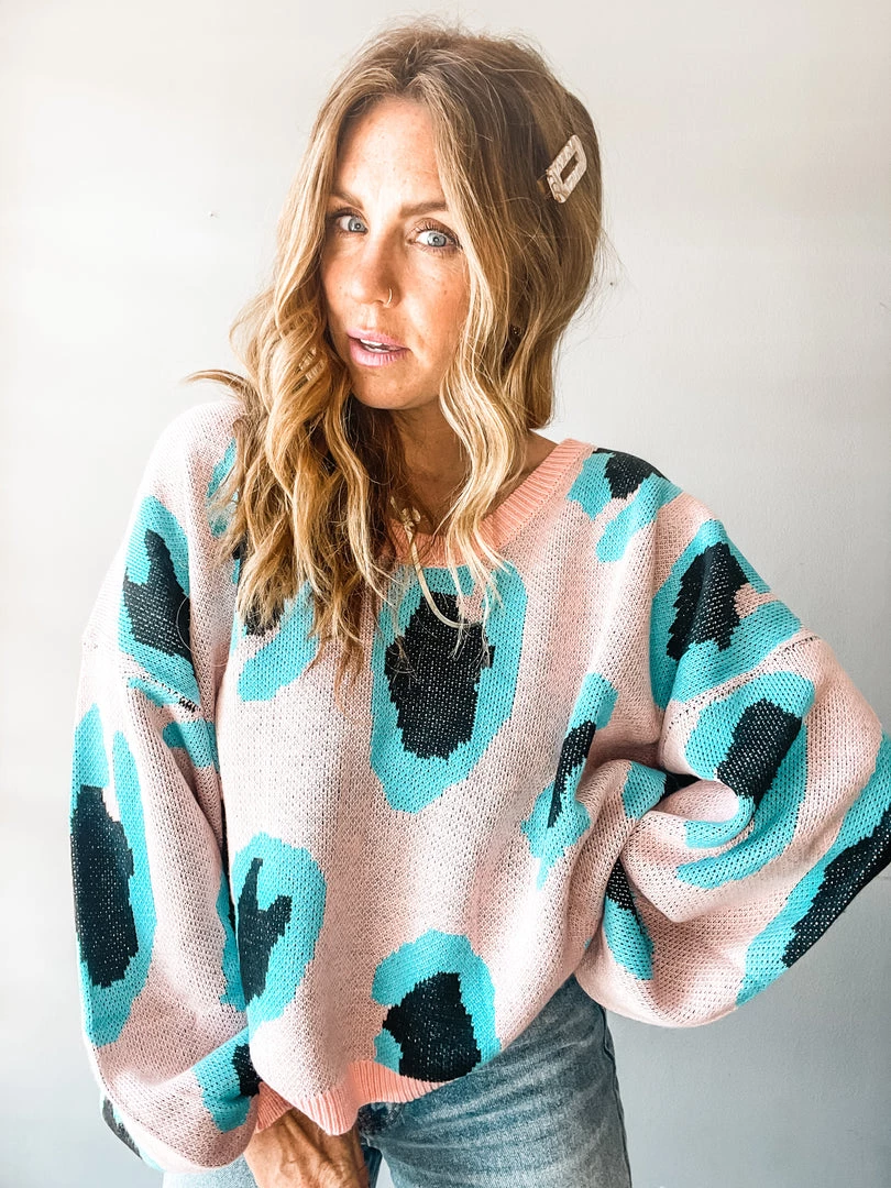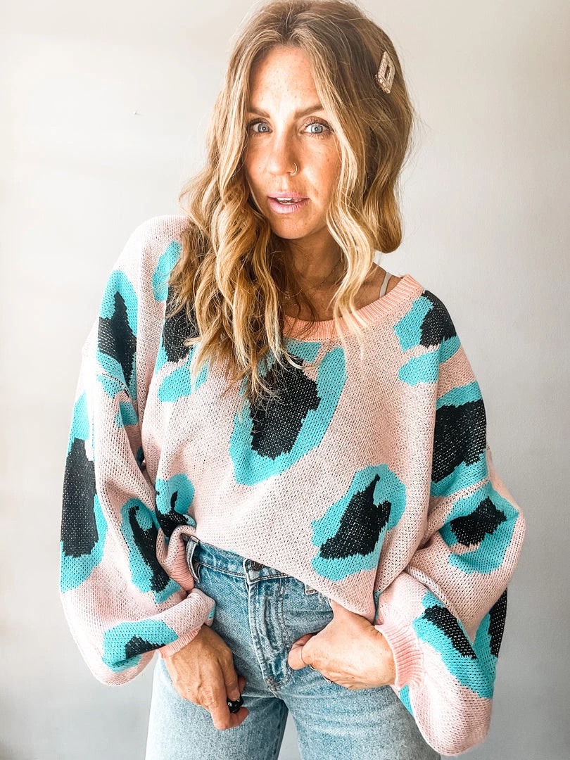 This fun and funky sweater has all the groovy vibes with its bright colors and fun animal pop print. We love this long sleeve v neck knit tossed on with a black slip dress, maxi skirt or paired with some high waisted flare cords. Loose fitting and the perfect statement piece.