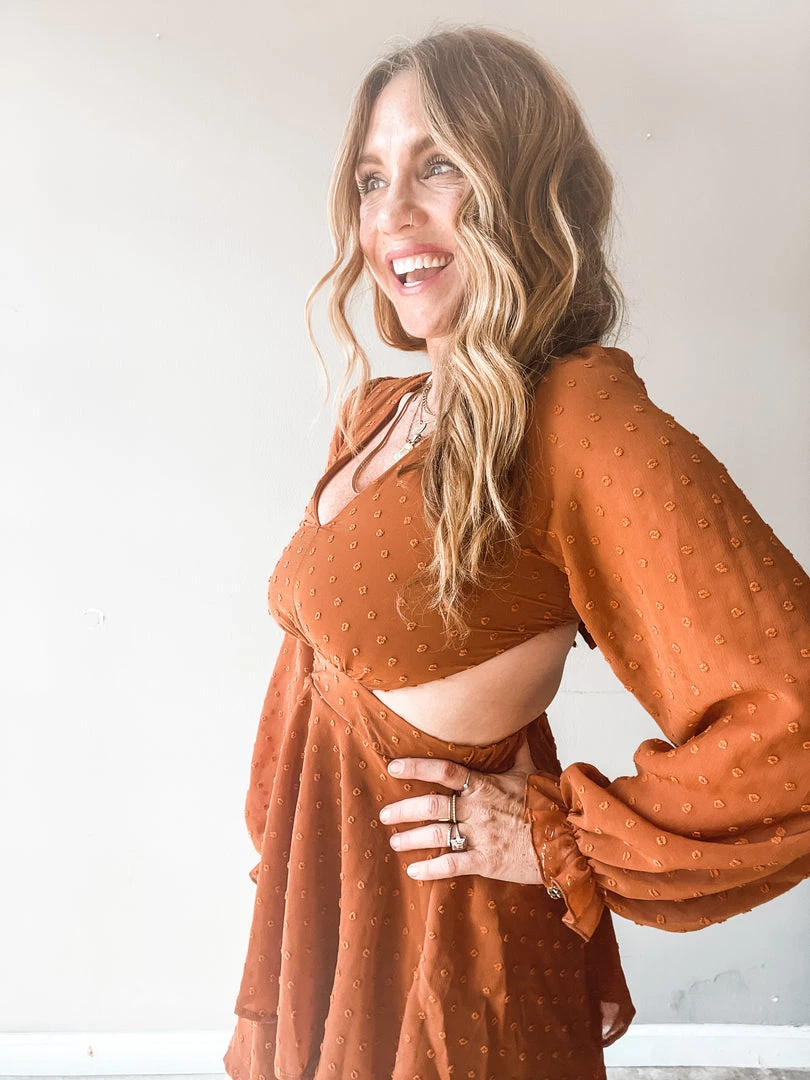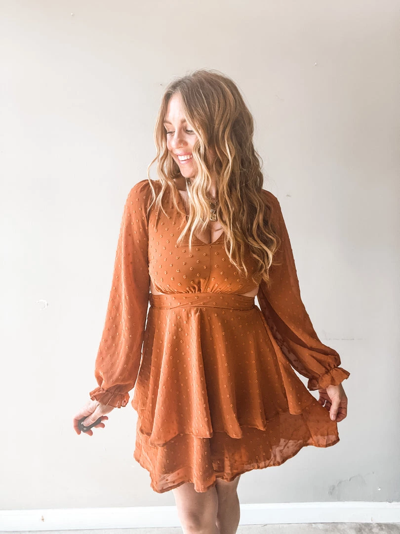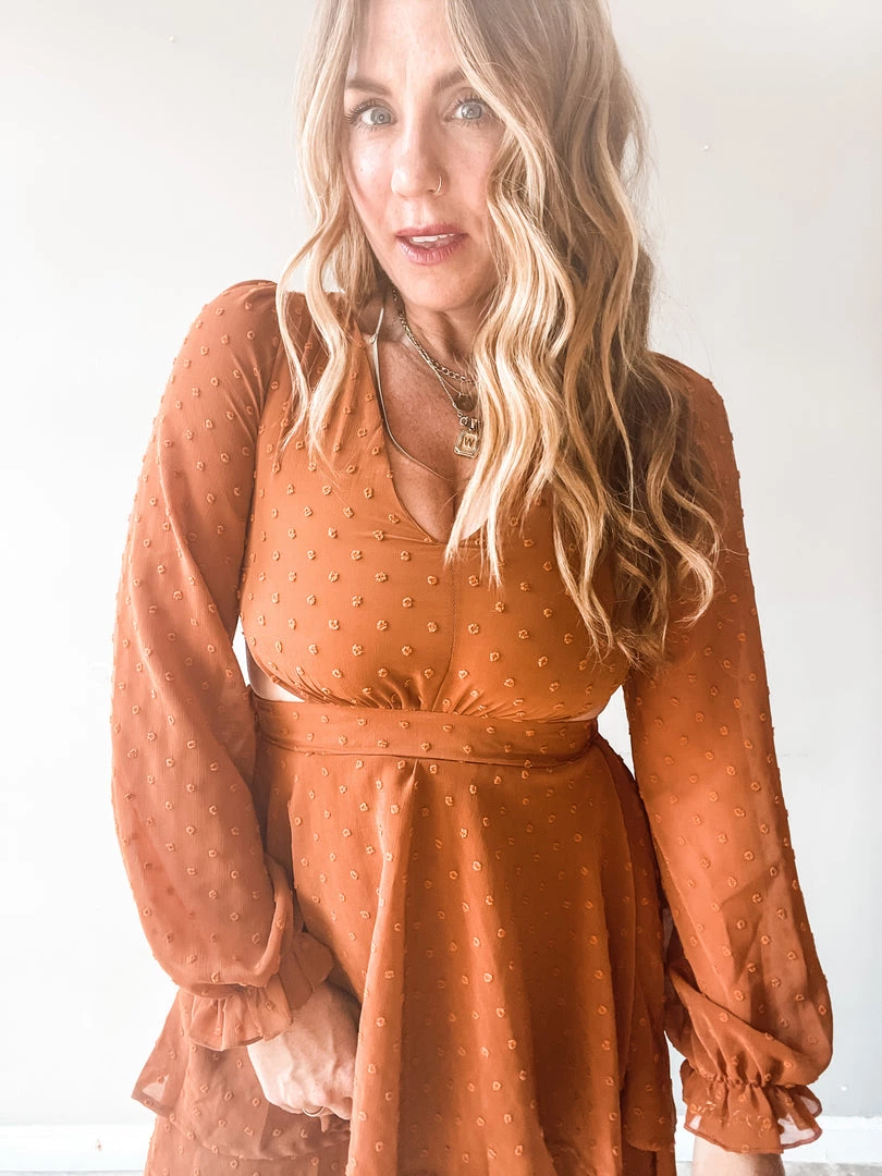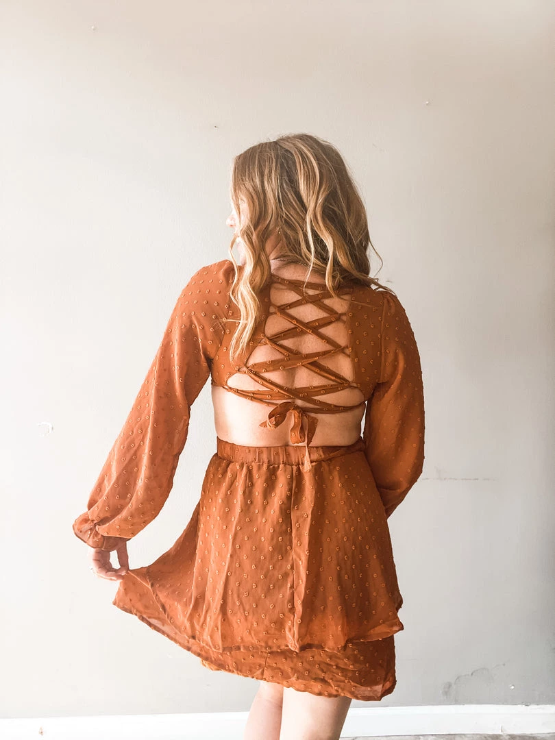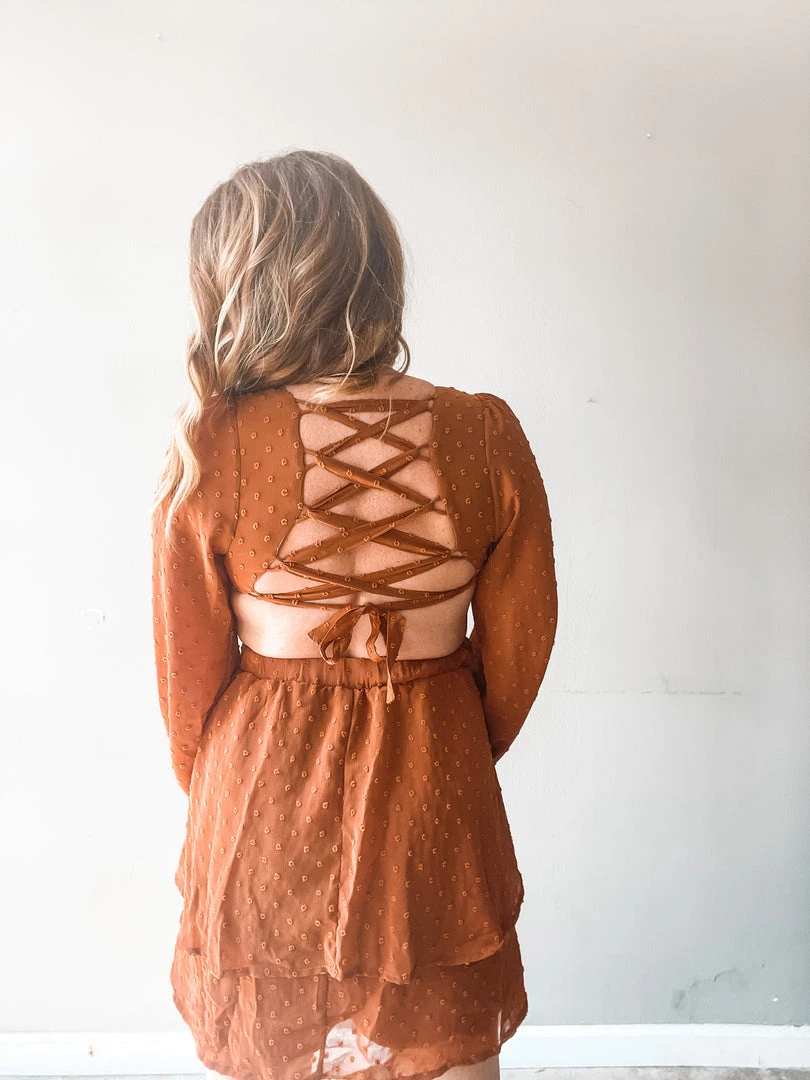 A moment for this sweet rust number please!! Such a fun update on a classic mini dress with its cut out details in the bust and stunning lace up back. All over swiss dot details adds some fun dimension to this flirty dress. A fixed front waistband with elasticated back and ruffle tiered skirt. Semi sheer long sleeves with elastic wrists and a double lined skirt and bust.