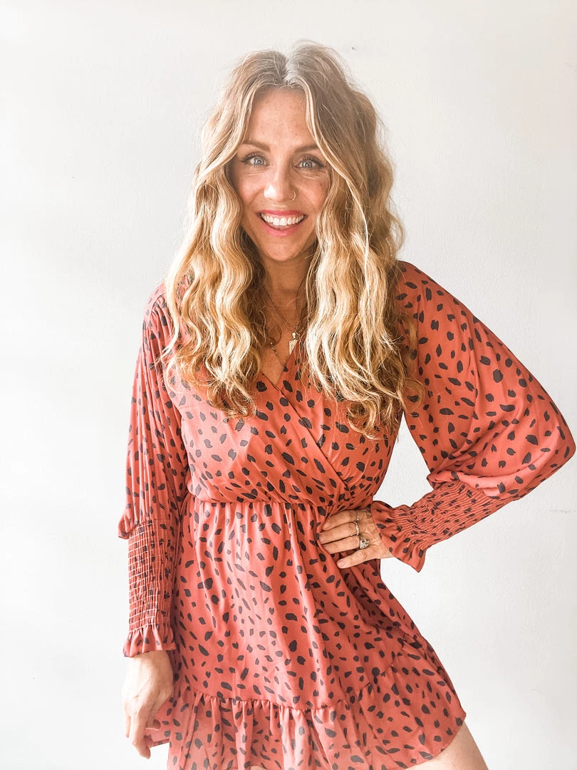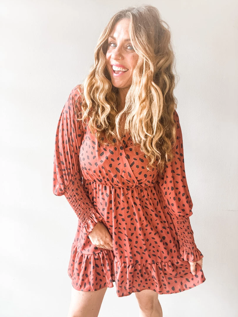 The Midnight Train to Georgia Dress is a SUPER flattering silhouette for all body types! We love the v neckline (with sewn closure at the bust). fun fitted details on the sleeves, and the loose skirt! This flirty Fall dress pairs well with sneakers or boots, and looks so great layered with all your go-to Fall outerwear!