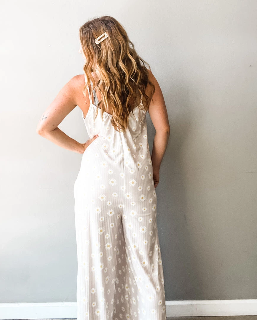 The sweetest daisy print jumpsuit that we ever did see!! A tank style jumpsuit with side pockets, cause we see you girl. This ribbed fabric with scoop neck jumpsuit has spaghetti straps, a loose fit and long wide legs. Pair with sneakers or a wedge and live your grooviest life.