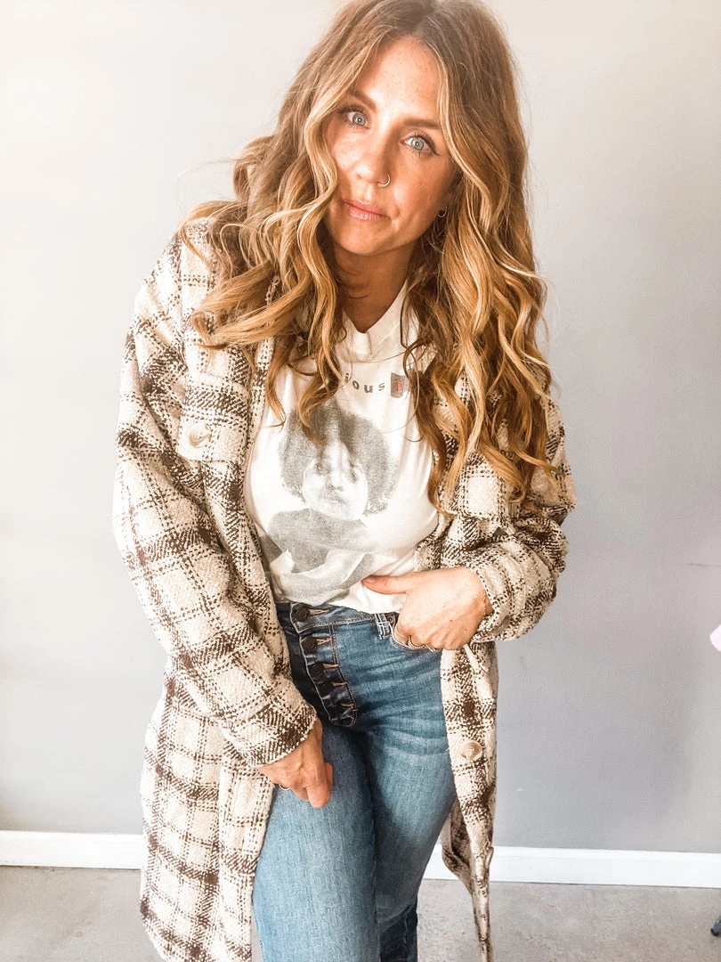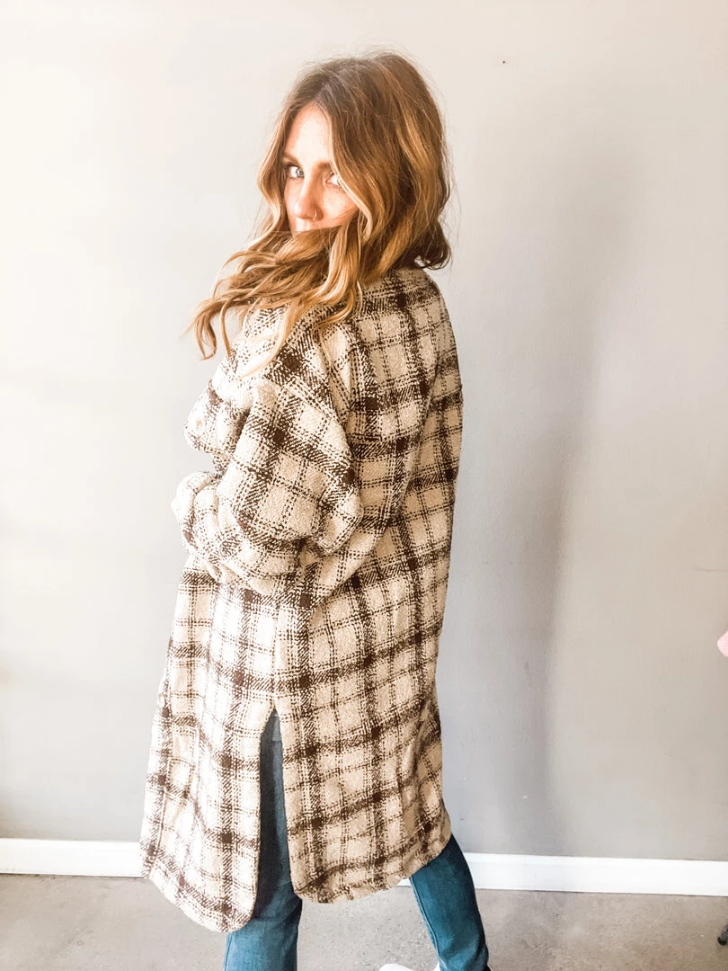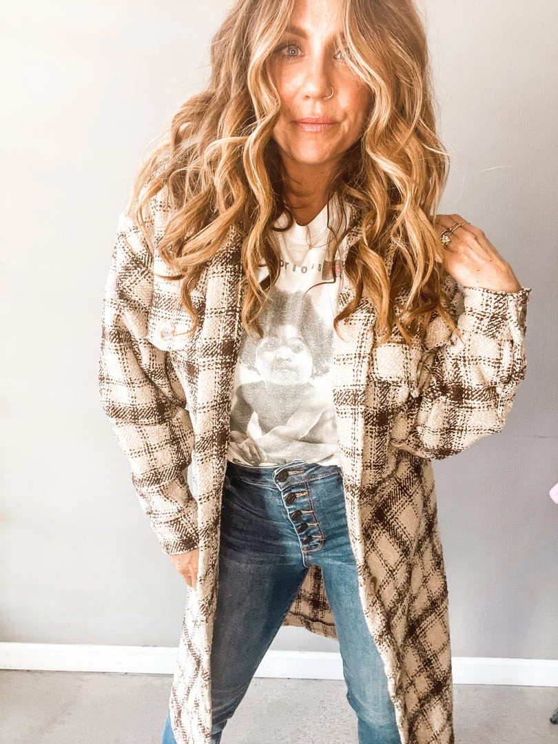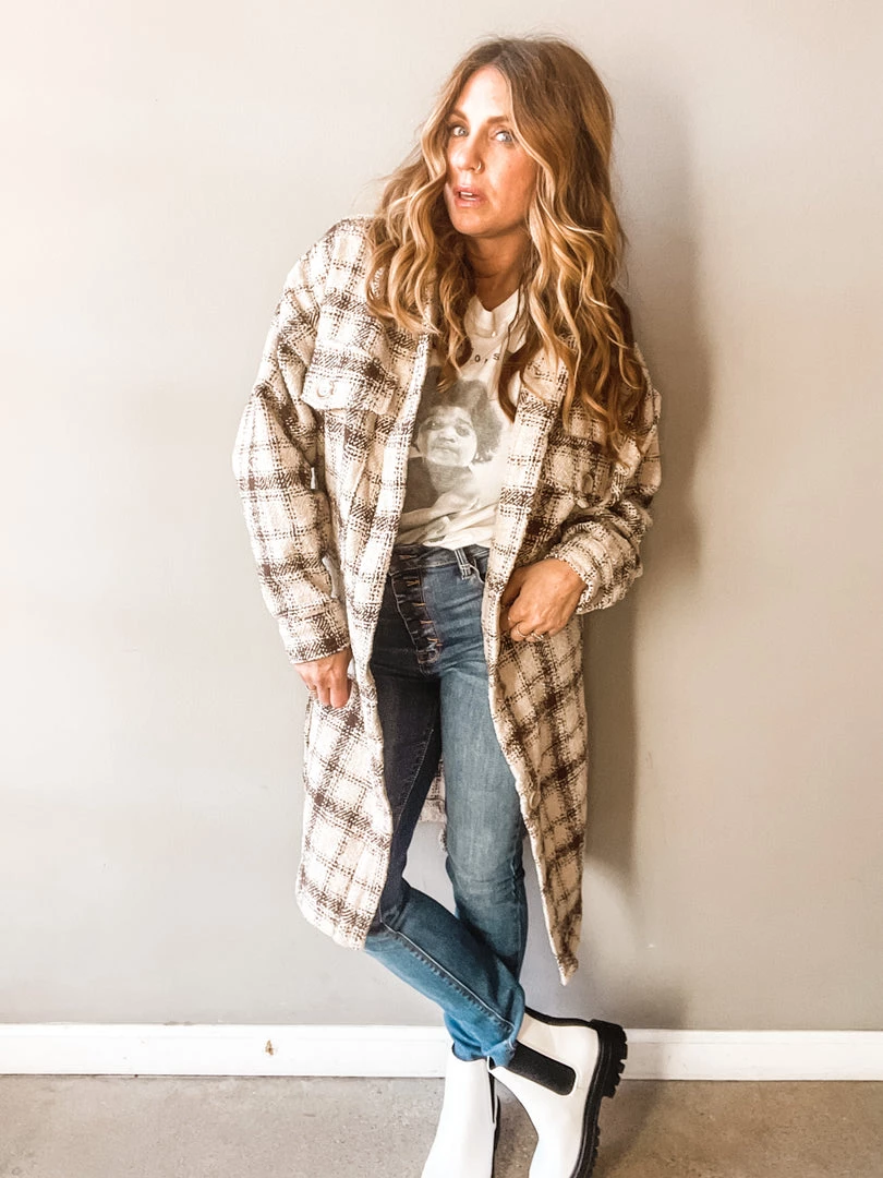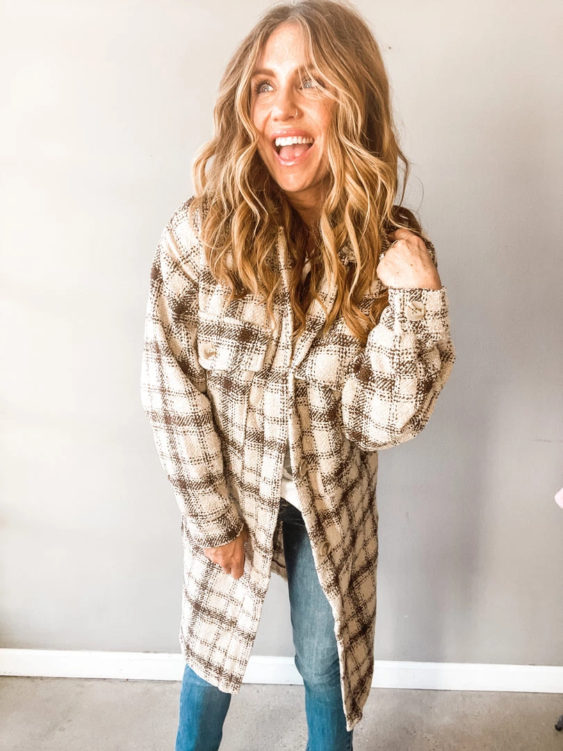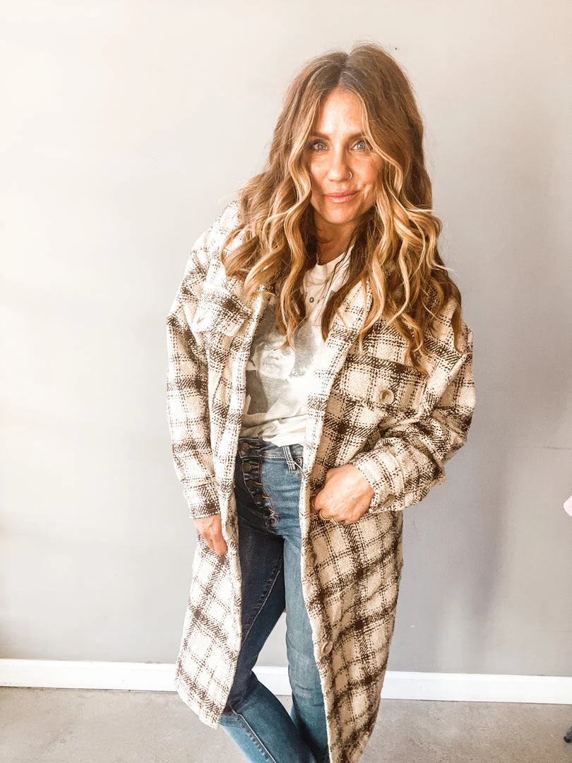 Is it just us or is anyone else actually excited for this cool and cozy weather and dressing in all the layers..well you’re in luck cause we’ve hit the jackpot with the new goods. The Play it Plaid coat takes the cake with its knee skimming length and menswear inspired fit. This beige and taupe plaid coat fits like an oversized shacket and features a five button front with pocket details at the bust and side pockets. Adjustable collar and tapered button sleeves makes this cozy jacket an easy toss-on piece.
