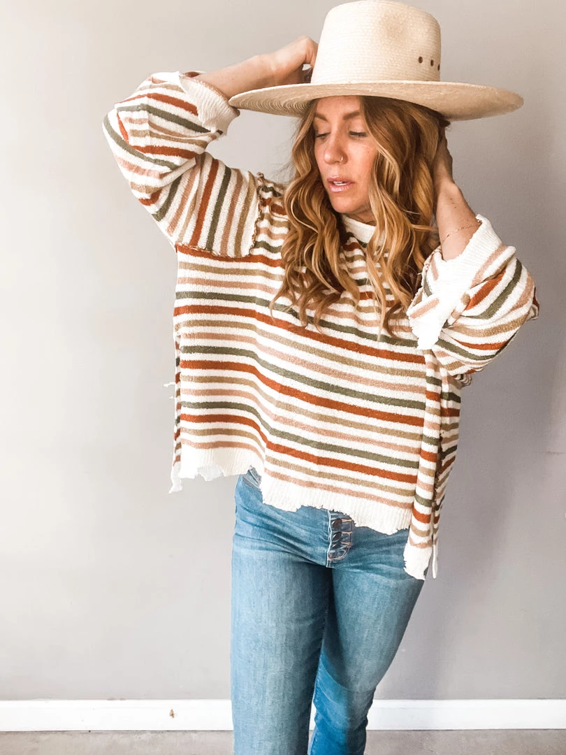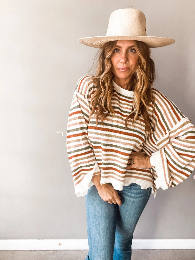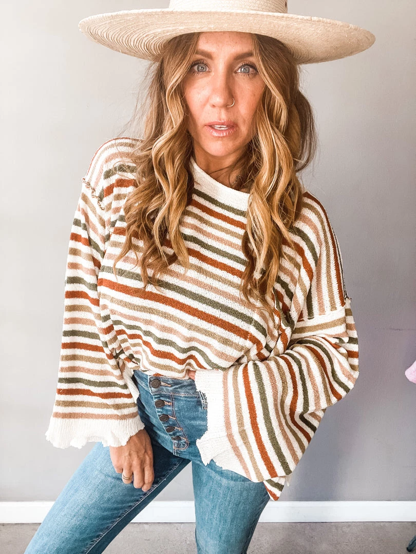 This multi striped sweater is Right On Time with its holiday inspired color way!! A relaxed wide crew neck and wide long sleeves make this striped sweater so fun and the exposed seam details on the drop shoulder keeps things interesting! A flowy and slightly boxy fit that hits just below the waist and looks great tucked in or worn loose. We love this sweater for a casual day out with the fam picking out a tree or dressed up for your annual holiday get together with the gals. Oversized breast pocket detail and contrast hem and wrists wraps this pretty top up nicely.