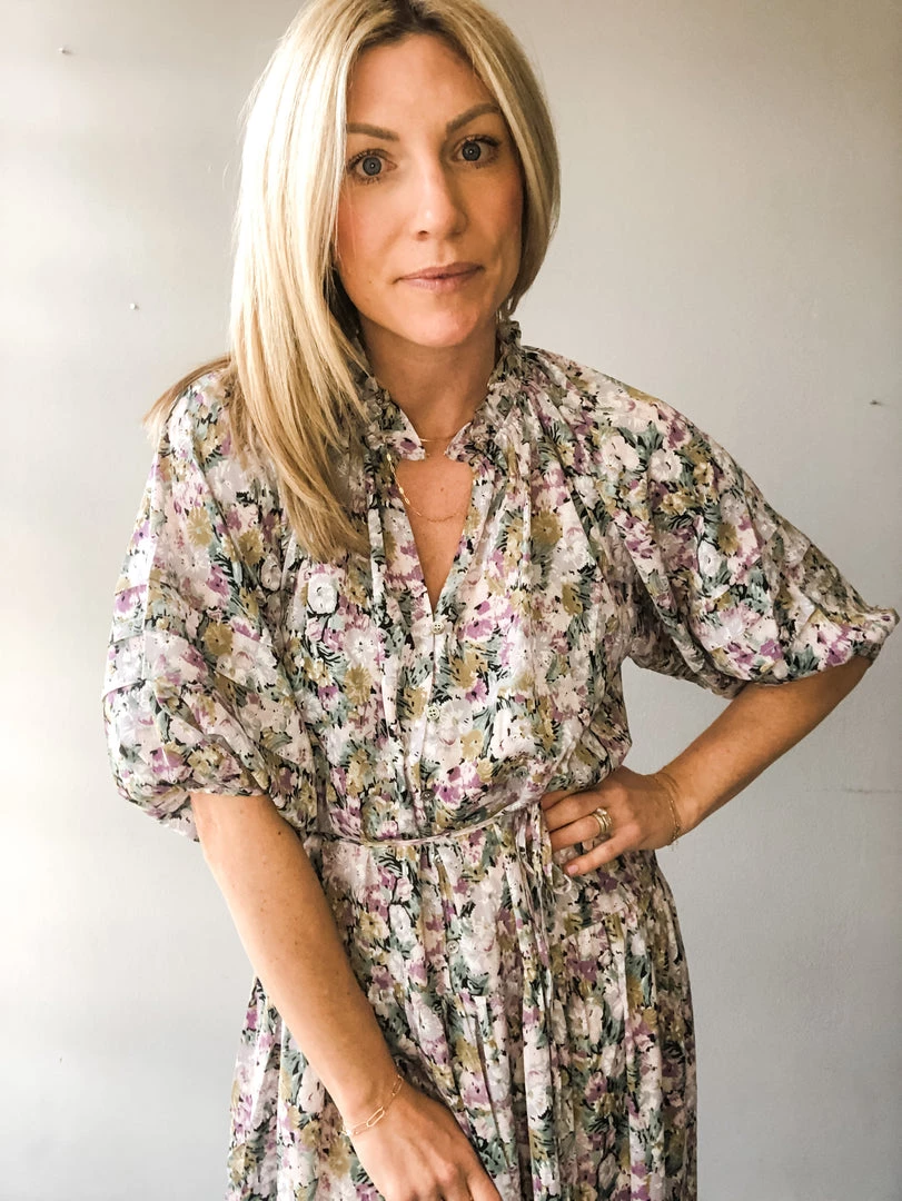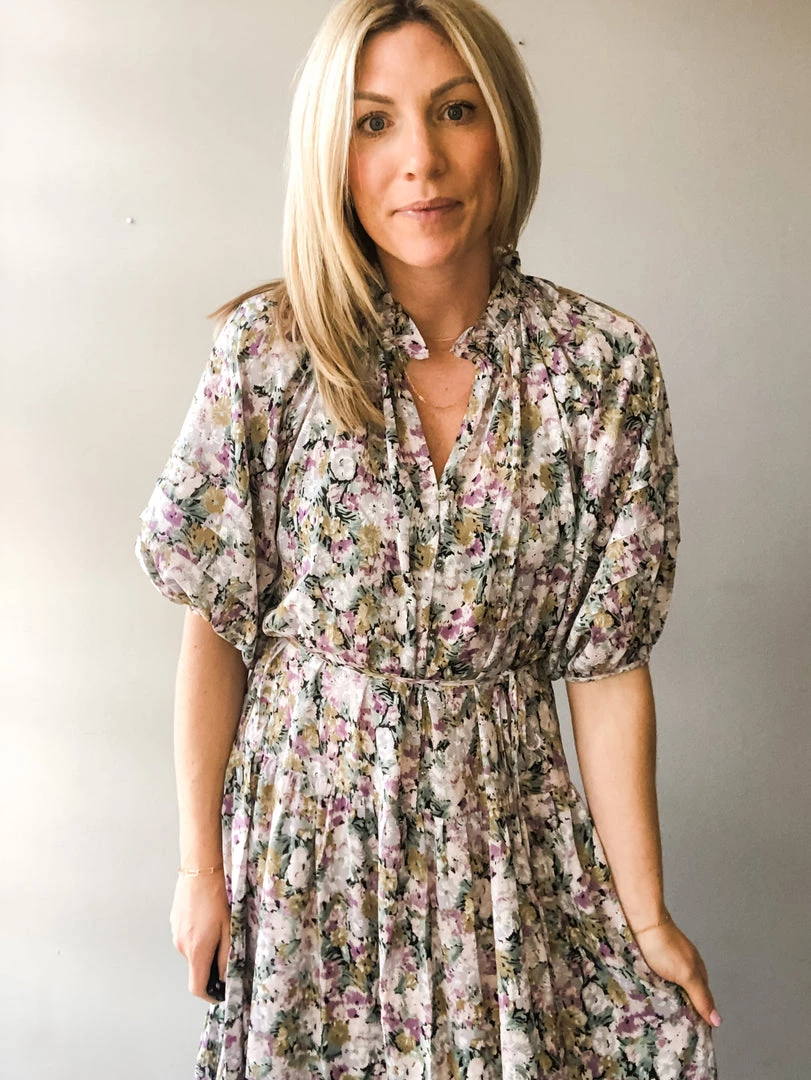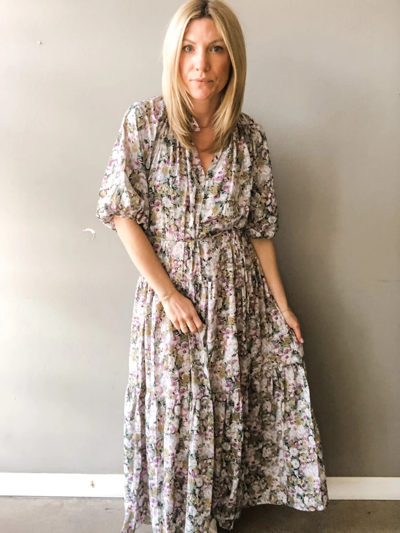 An all over floral maxi dress with balloon sleeves, button front detail, tiered skirt and a tie at the waist. A stunning spring dress that can be dressed up, worn casual with sneakers or layered under a jacket. Easy to pair and wear and versatile for all body types.