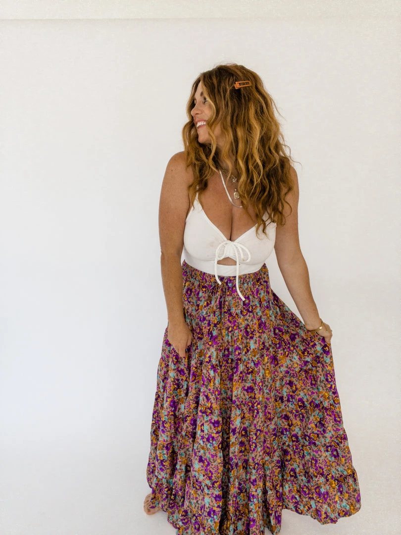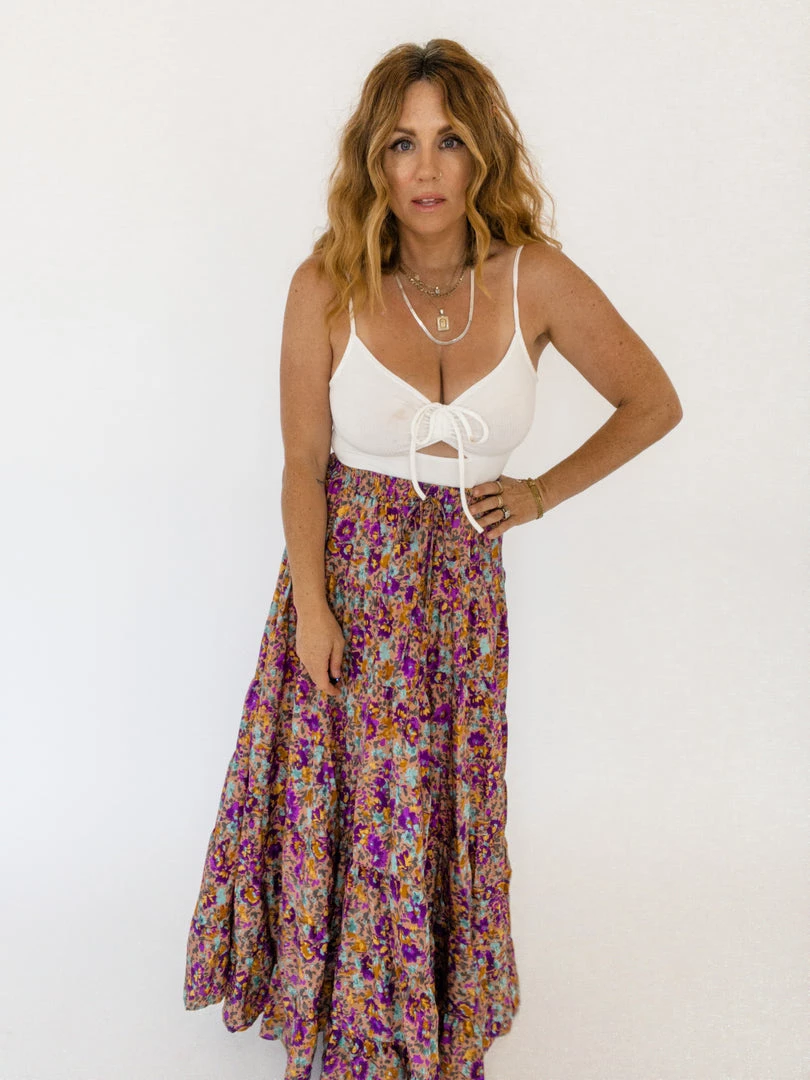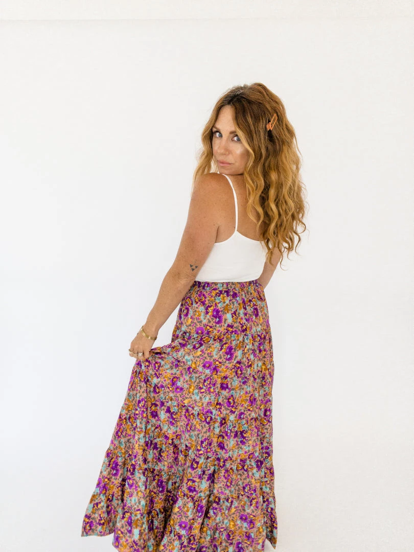 The Cassie Maxi Skirt is a stunning floor-length skirt that has a dusty pink base color and vibrant purple, blue, and yellow florals. Its tiered, has an elastic waistband, and a drawstring.