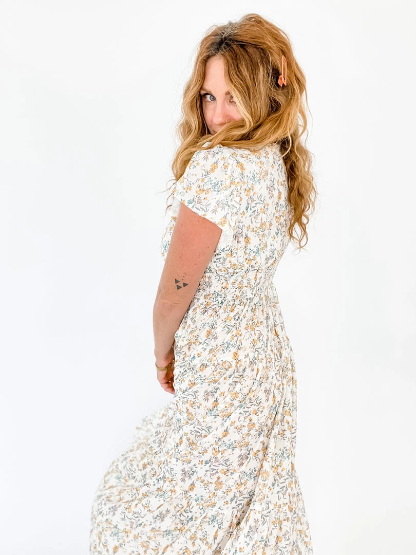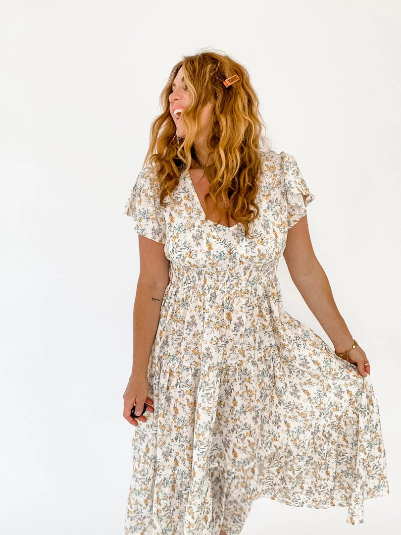 The Lia Maxi Dress has an ivory base color with soft mustard and green florals. It features a tiered skirt, smocking under the bust, a v-neckline, and flowy capped sleeves.