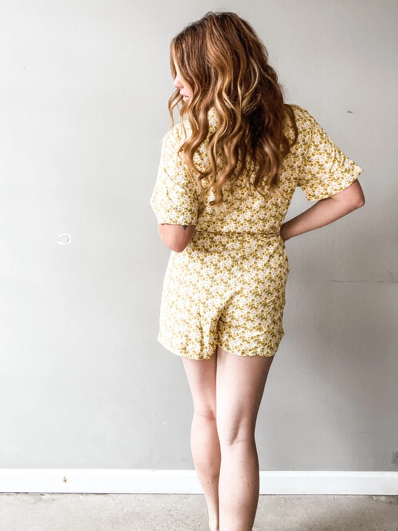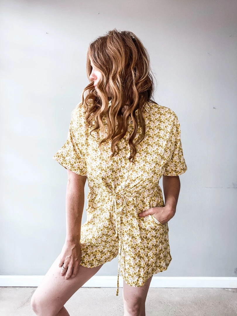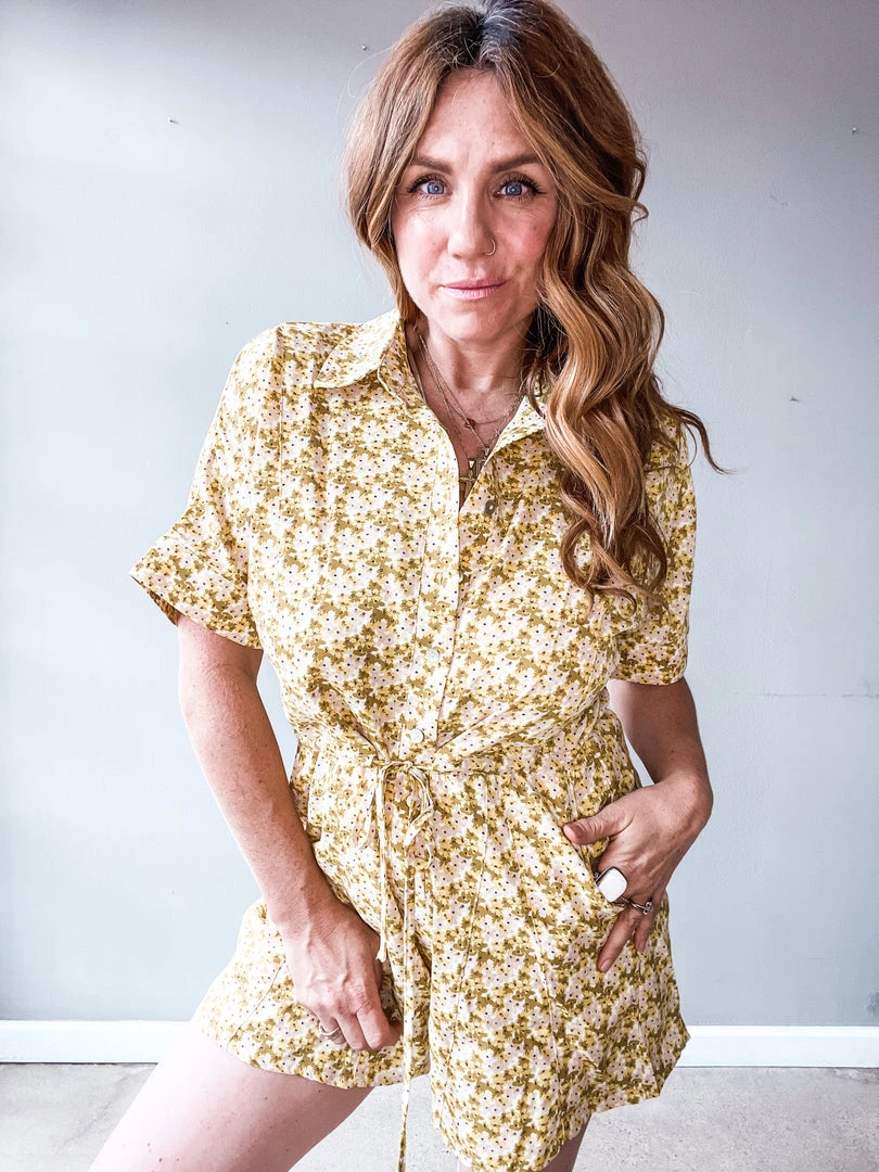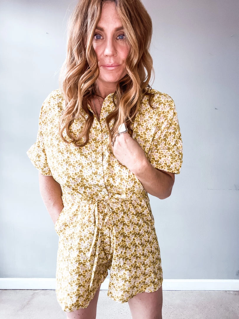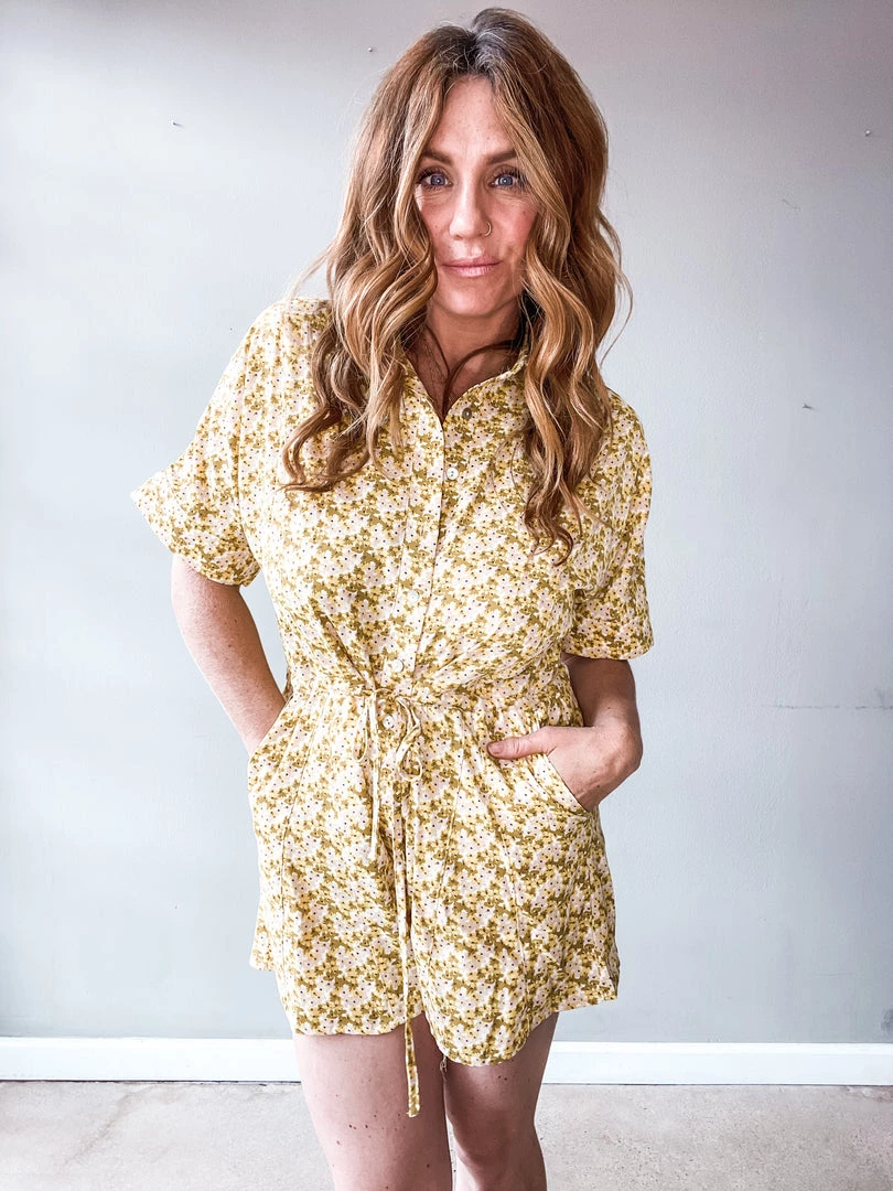 The Sunshine State Floral Romper is a retro dream! We love the bright yellow floral print of this drawstring waist, button front romper with collar details and comfy side pockets! The perfect length and fun piece to dress down with sneaks or dress up with wedges!