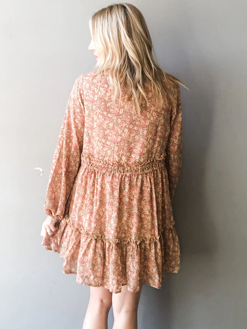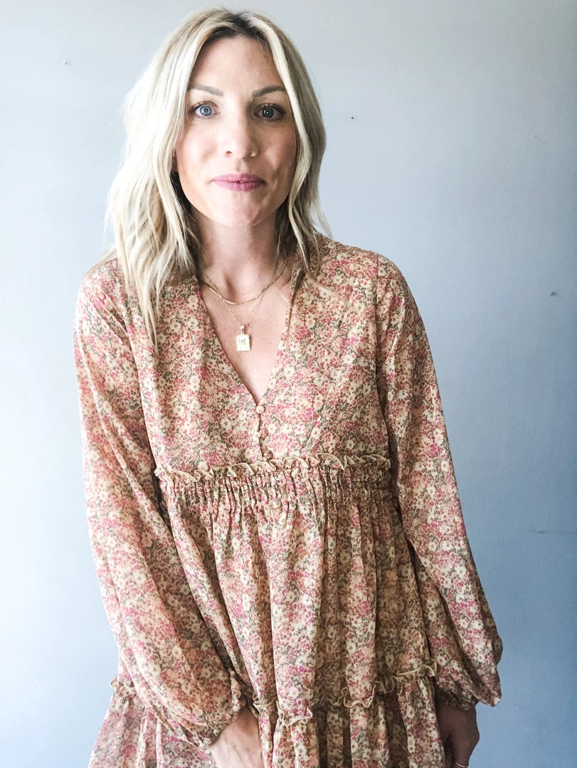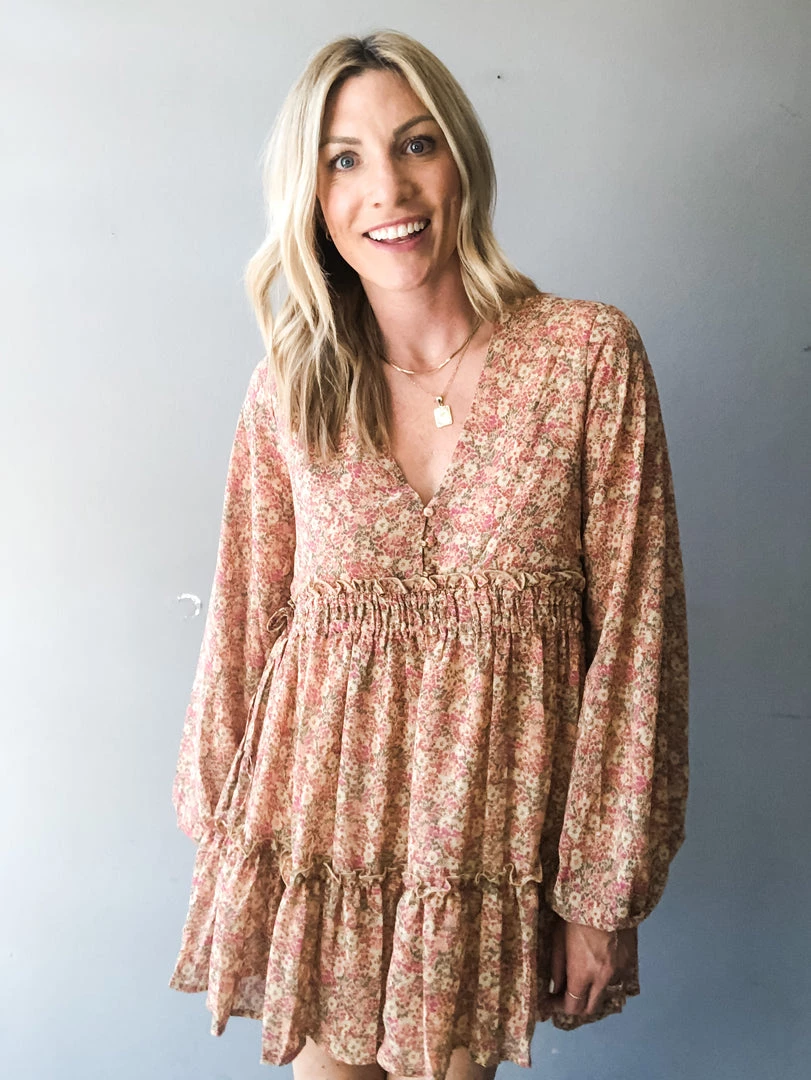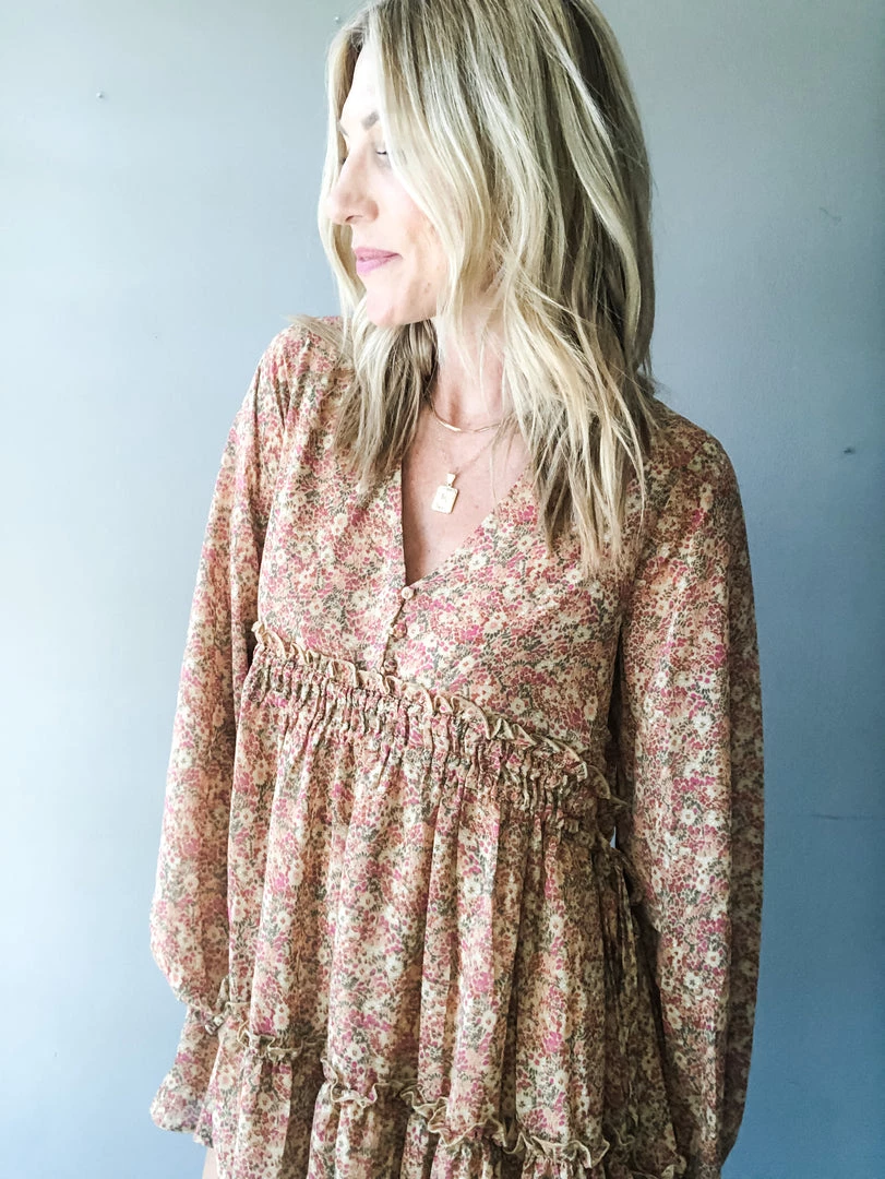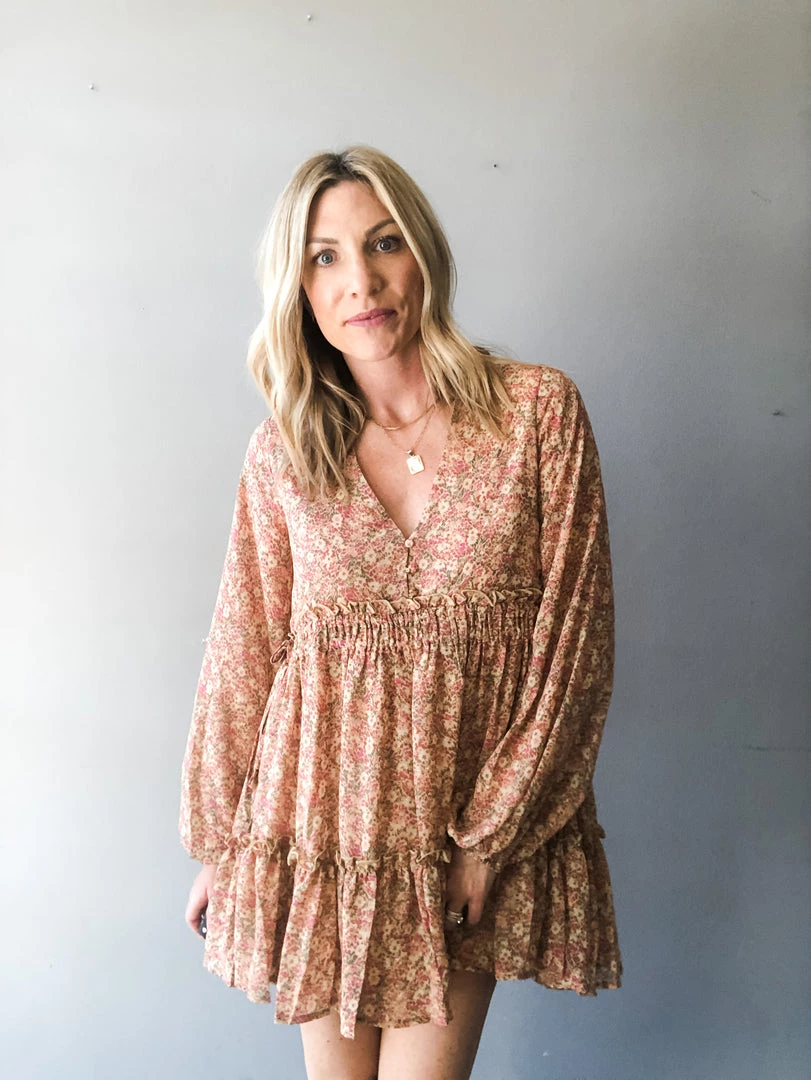 The babydoll you’ve all been asking for…super flattering waistline with a full sleeve in a floral colorway that’s perfect for late Summer and early Fall. A classic V neck with button down details at the bust and ruffle tiered hem with double lined skirt. A full and flowy silhouette that hits about mid thigh.
