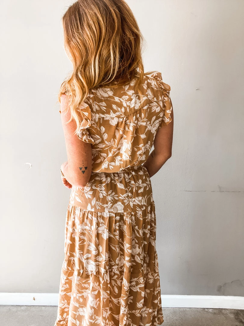 The Floral Flights Dress is a chic Fall floral midi dress with a super flattering smocked waistline with tie and fun tie at the bust. We love the ruffle sleeve details on this easy transition piece! Feminine and flirty, this looks great with boots or sandals, heels or sneaks!