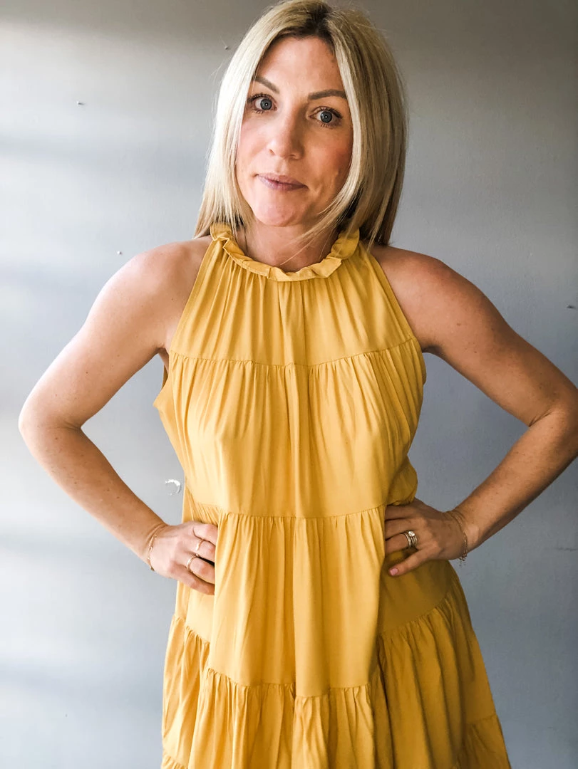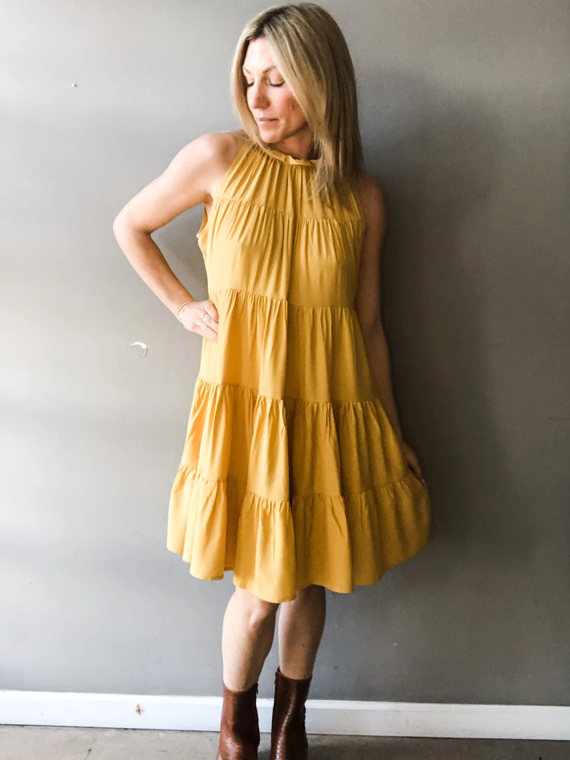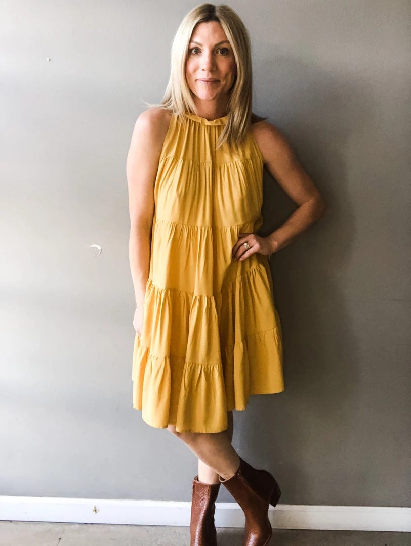A high neck tiered dress with tie back closure that is feminine and chic. We love this dress paired with the new Caty cognac snake boot for a more casual look but can dress her up with a heel for any special occasion. Loose fitting with a ruffle detail at the neck and beautiful tie at the back with a hook closure.