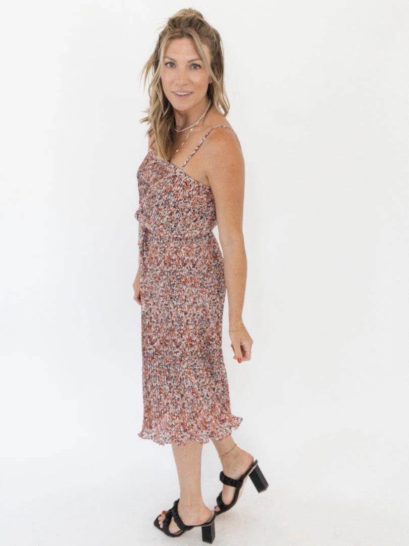 The Annabel Midi Dress has a straight neckline, an elastic band and adjustable tie around the waist, and a pleated skirt. It comes lined and has a unique dot print of orange, pinks and blues. The straps are adjustable and it has a keyhole with button closure on the back. A great dress for a special occasion and for all age and body types.