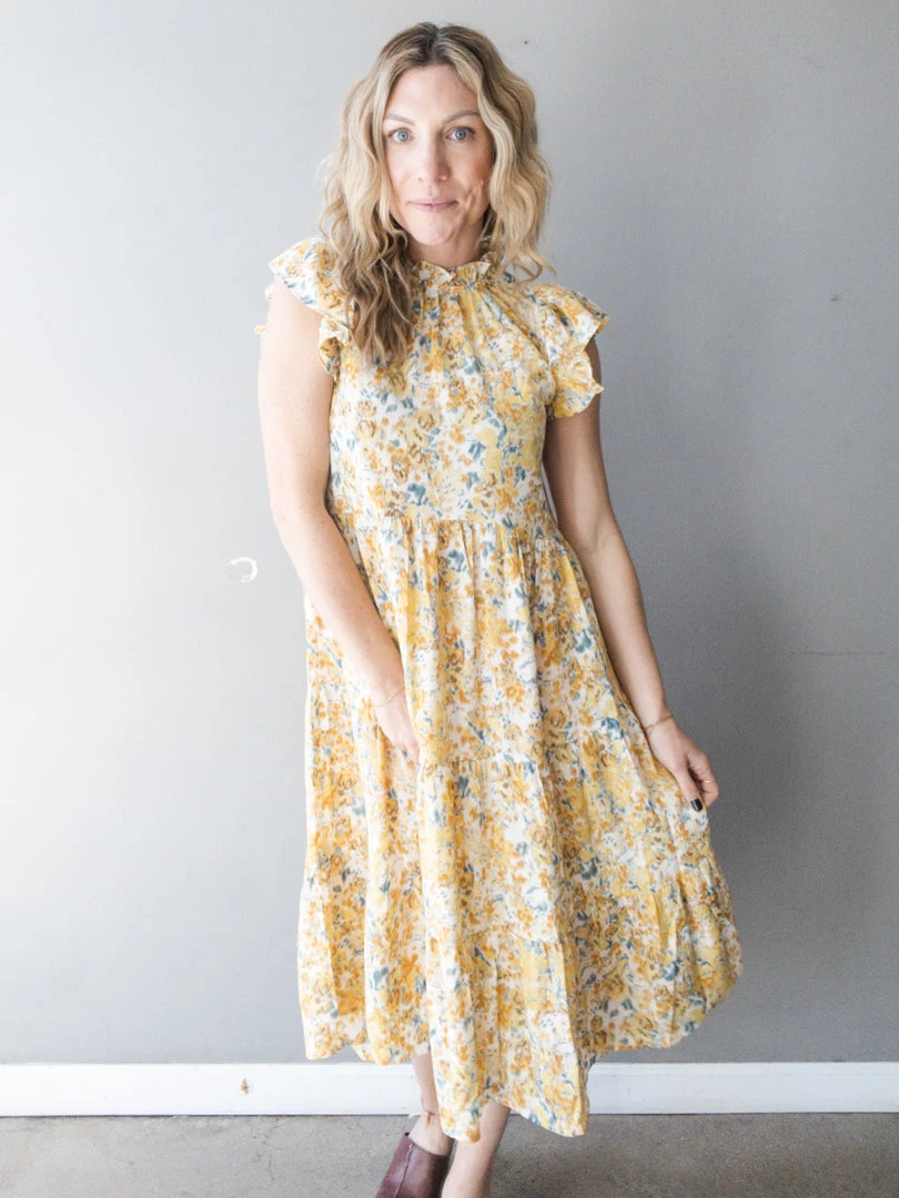 A pretty midi dress with yellow, cream, apricot, light blue and tan floral. With a high neck, ruffle sleeve and tiered skirt this is a happy dress that can easily be dressed up with a summer sandal or a bootie. Feminine and chic she is versatile and perfect match for brunch or a bridal shower. Keyhole and button closure at the back.